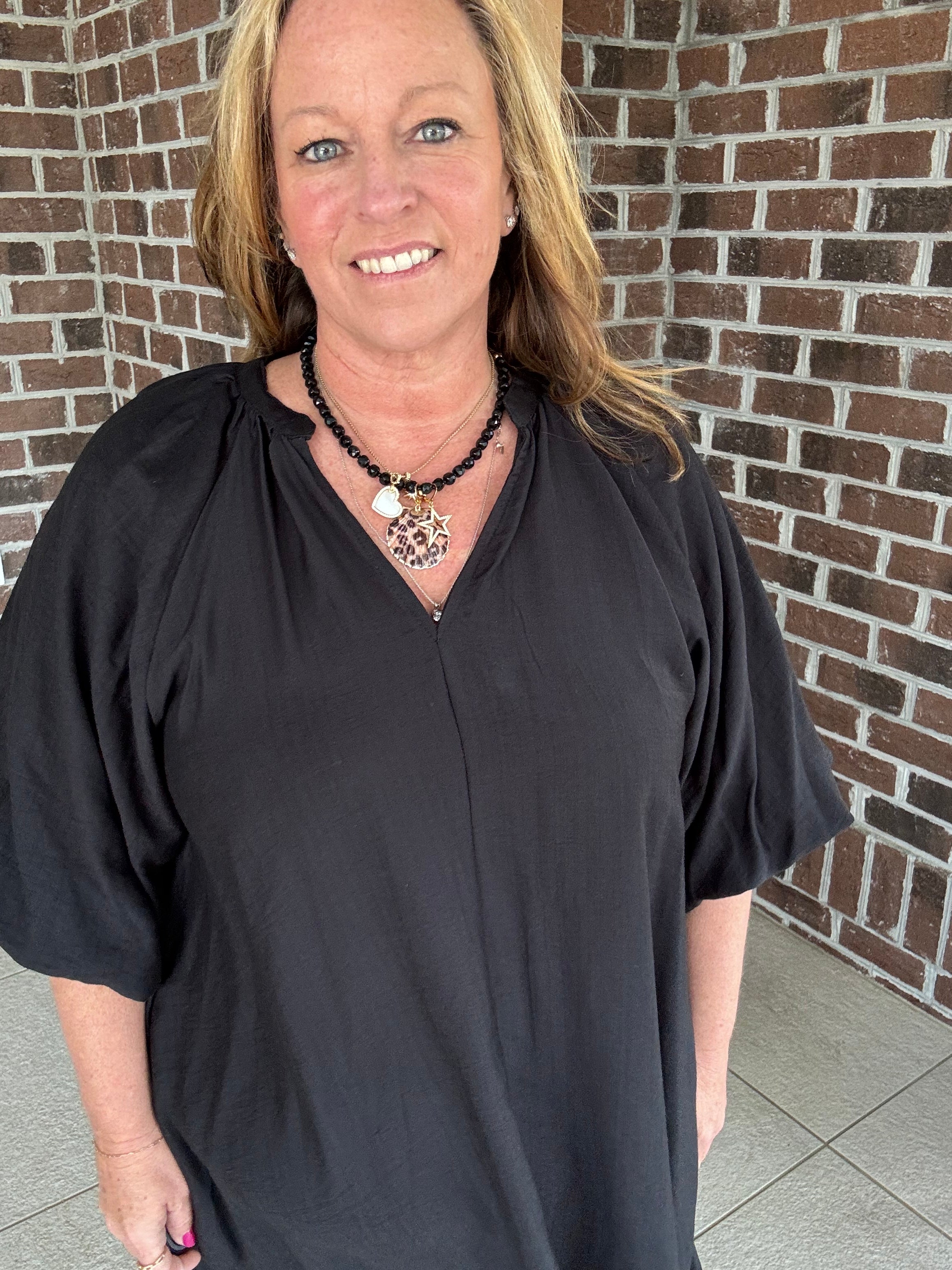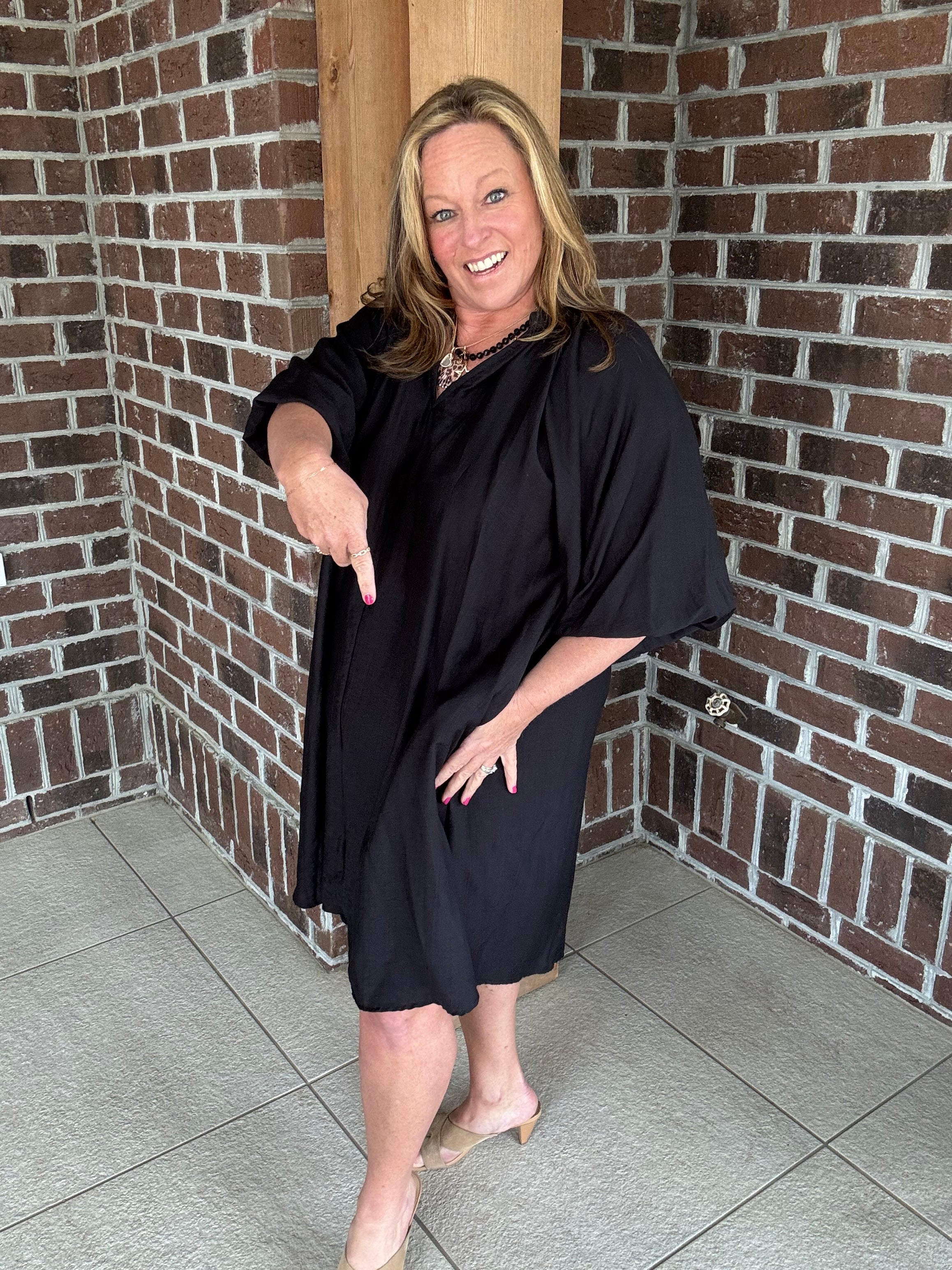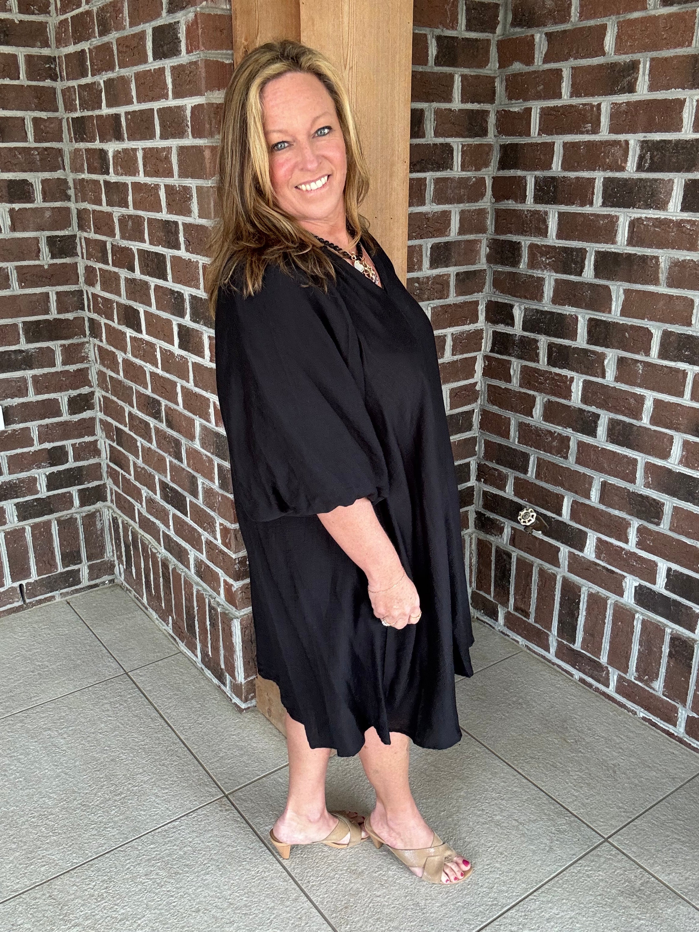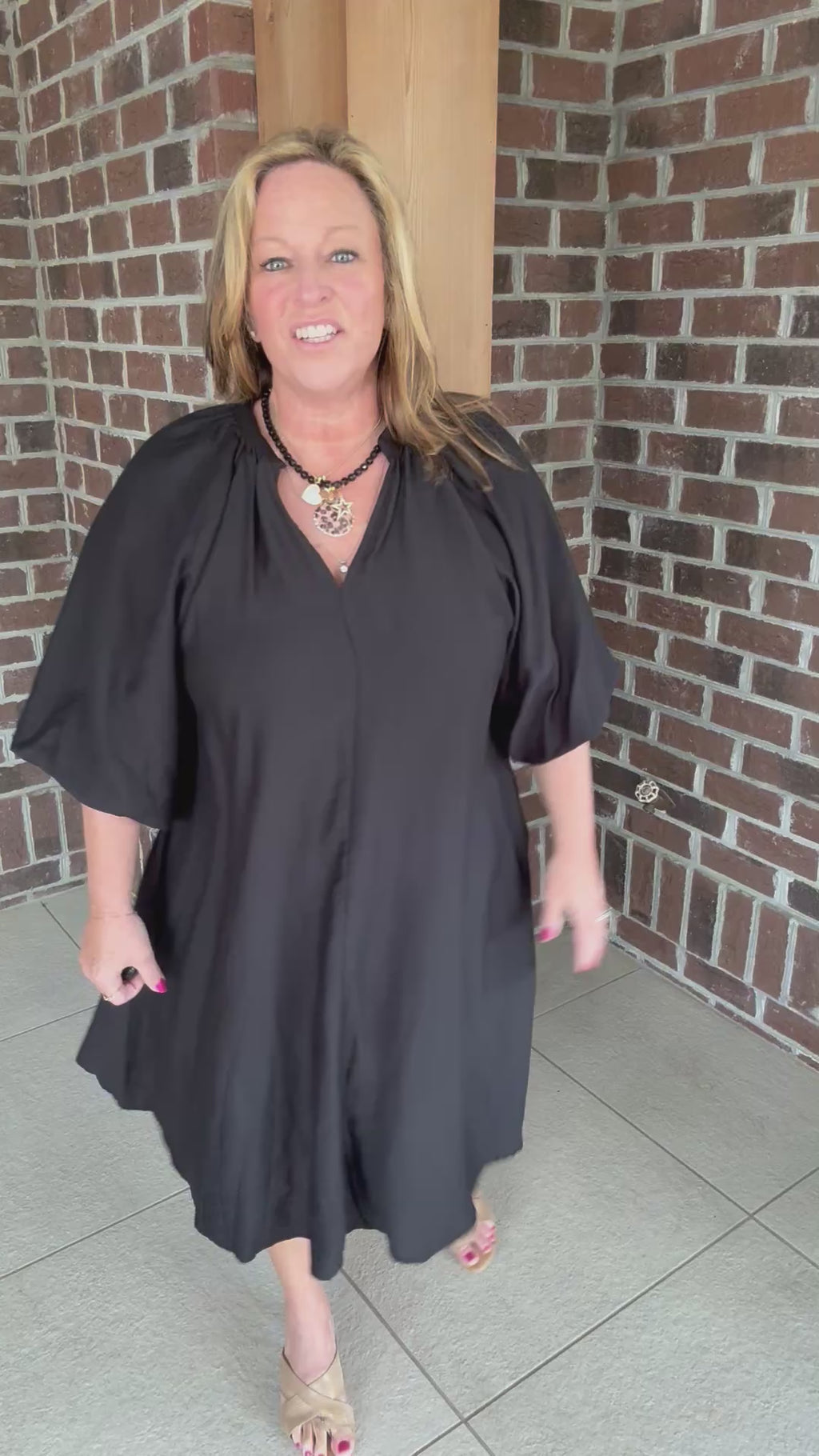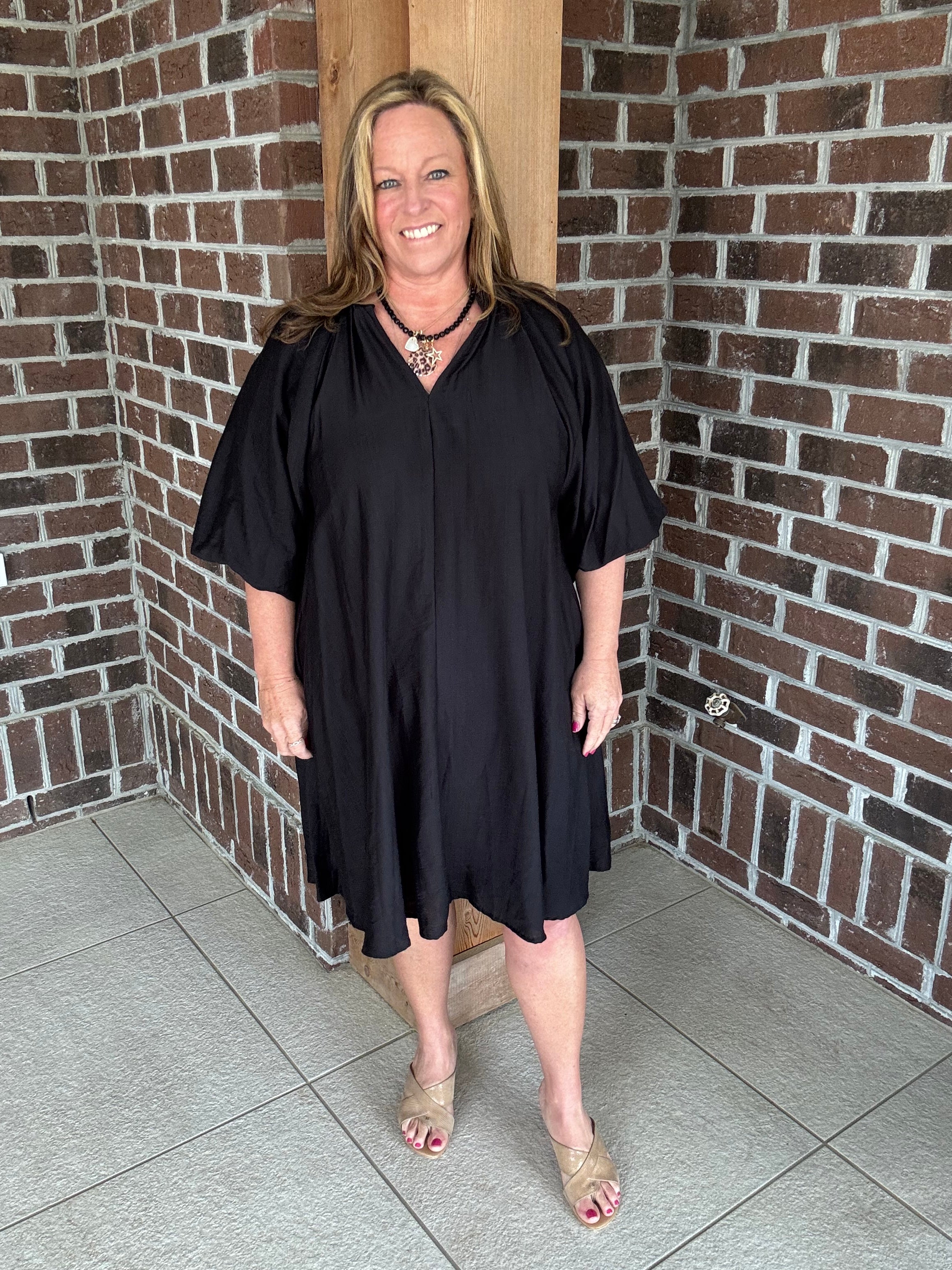 Every wardrobe needs a timeless piece, and this black A-line dress is just that — the perfect staple for every season and occasion. Crafted from lightweight polyester, it drapes beautifully with a flattering V-neckline and elbow-length sleeves. Side pockets add functionality without sacrificing style, making it an effortless go-to for work, church, or a night out.