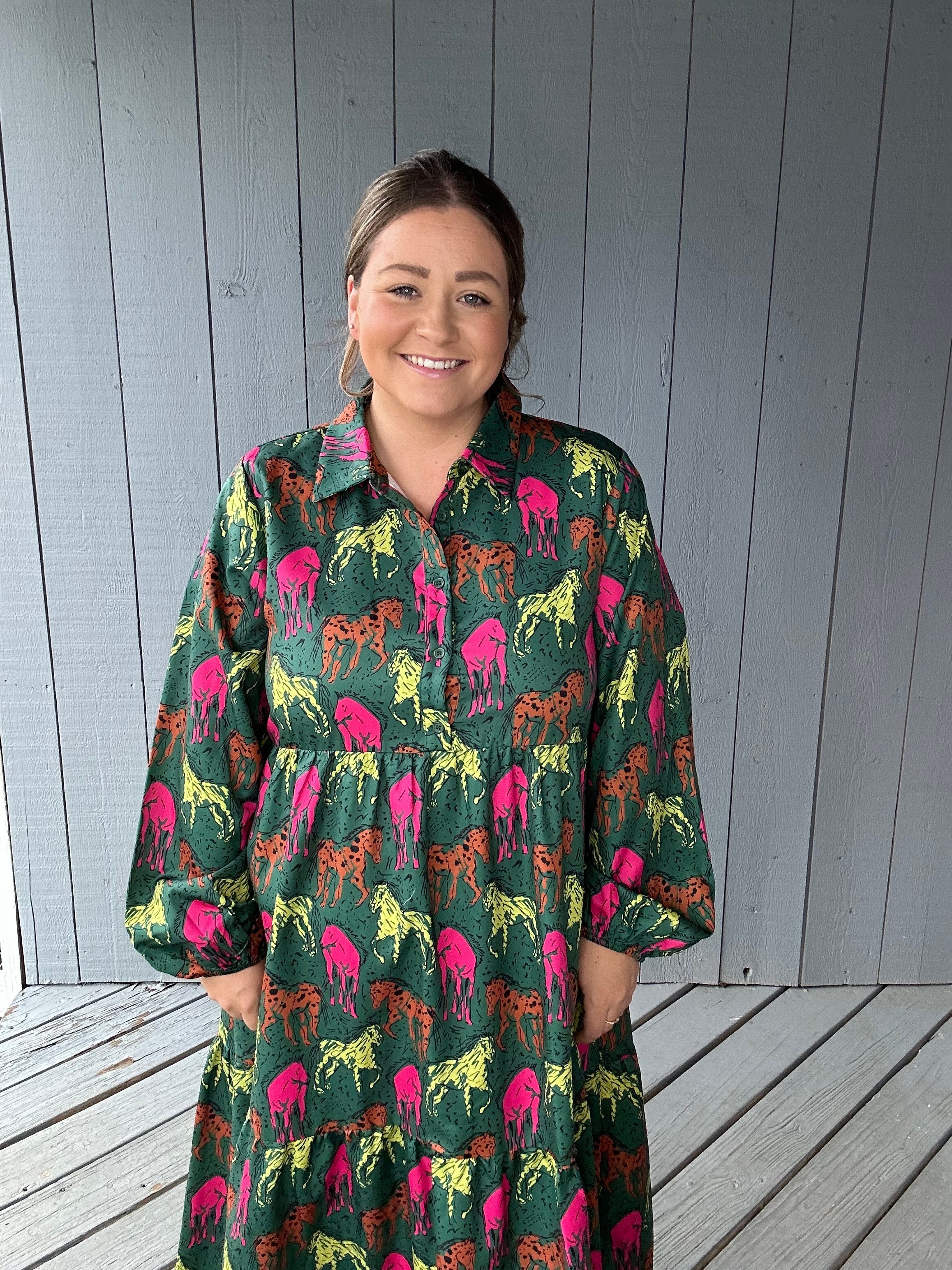 Step into fall with this stunning dress by Jodifl, featuring a playful horse pattern accented with vibrant neon yellow and neon pink hues. The dark green background provides a rich canvas for this eye-catching print, while the collared neckline and button-down front add classic polish. The dress flows into two tiers for a flattering, feminine silhouette and offers long sleeves and a long length for cozy coverage.