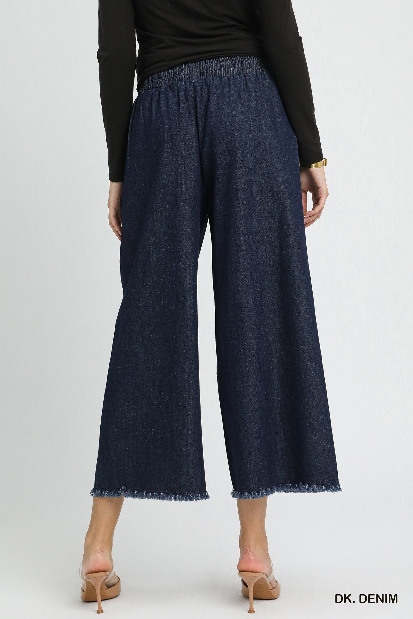 The elastic waistband gives you that easy, slip-on fit you’ll reach for every time, while the wide-leg silhouette and raw fringe hem keep the look modern and fun. Pair them with a tucked-in tee and sneakers for weekend errands, or dress them up with wedges and a blouse for casual Fridays.