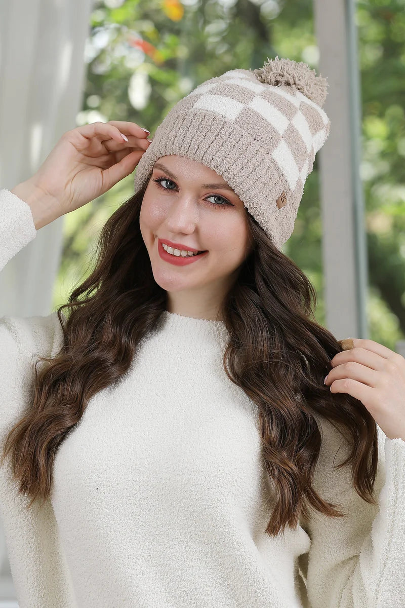 Stay cozy and stylish with the ComfyLuxe Checkerboard Pom Beanie, the ultimate blend of softness and chic design. Crafted in ultra-soft knit fabric, this beanie features a trendy tan and cream checkerboard pattern that adds a modern twist to your winter look. The plush pom on top completes the look with a playful touch while keeping things warm and comfy.