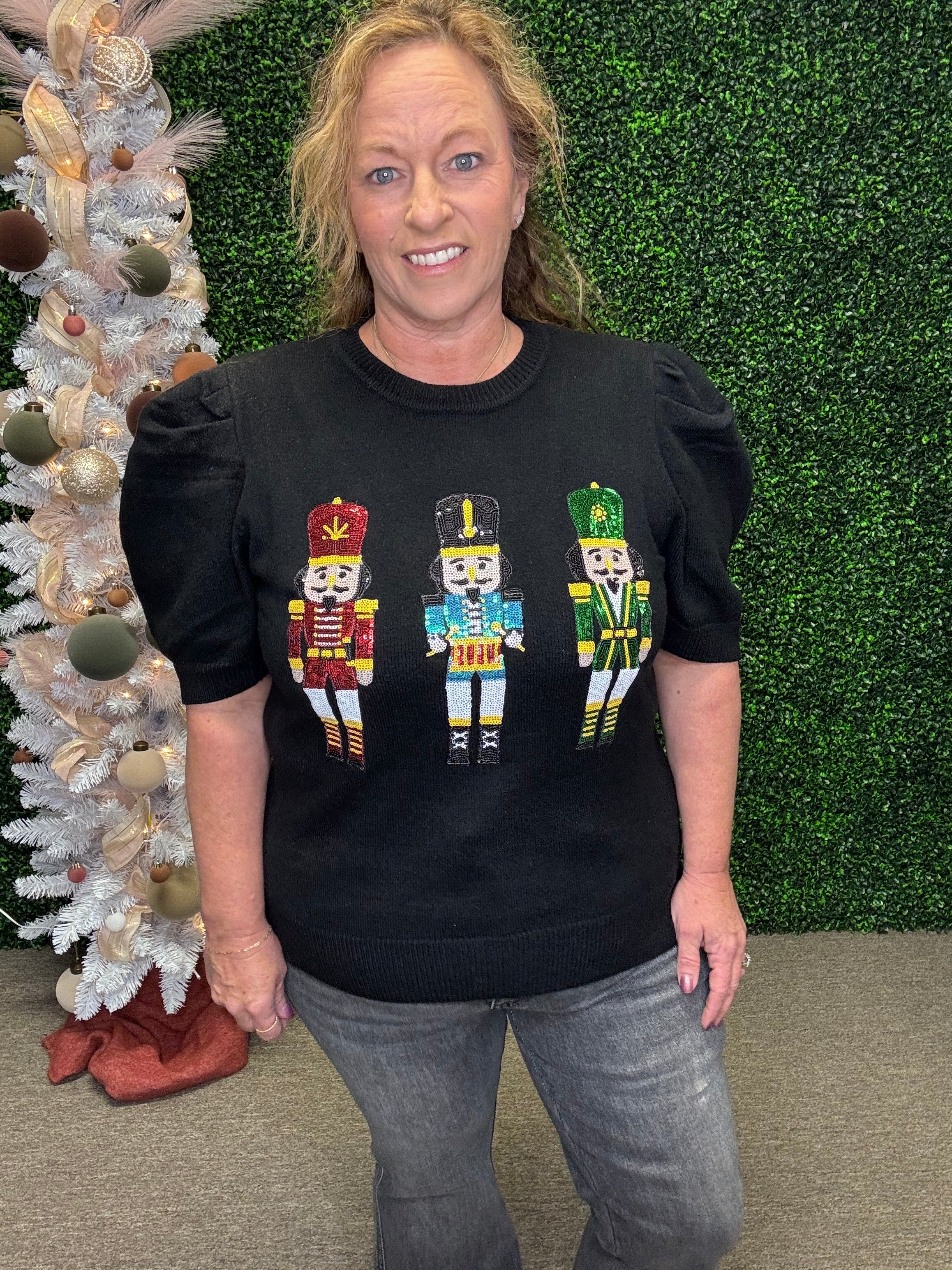 Looking for a festive sweater that’s both playful and chic? This half-sleeve knit sweater is accented with fun sequin nutcracker patches, making it the perfect statement piece for holiday parties, family gatherings, or casual festive days. Its soft, midweight knit keeps you comfortable while the whimsical design ensures you stand out in style.
