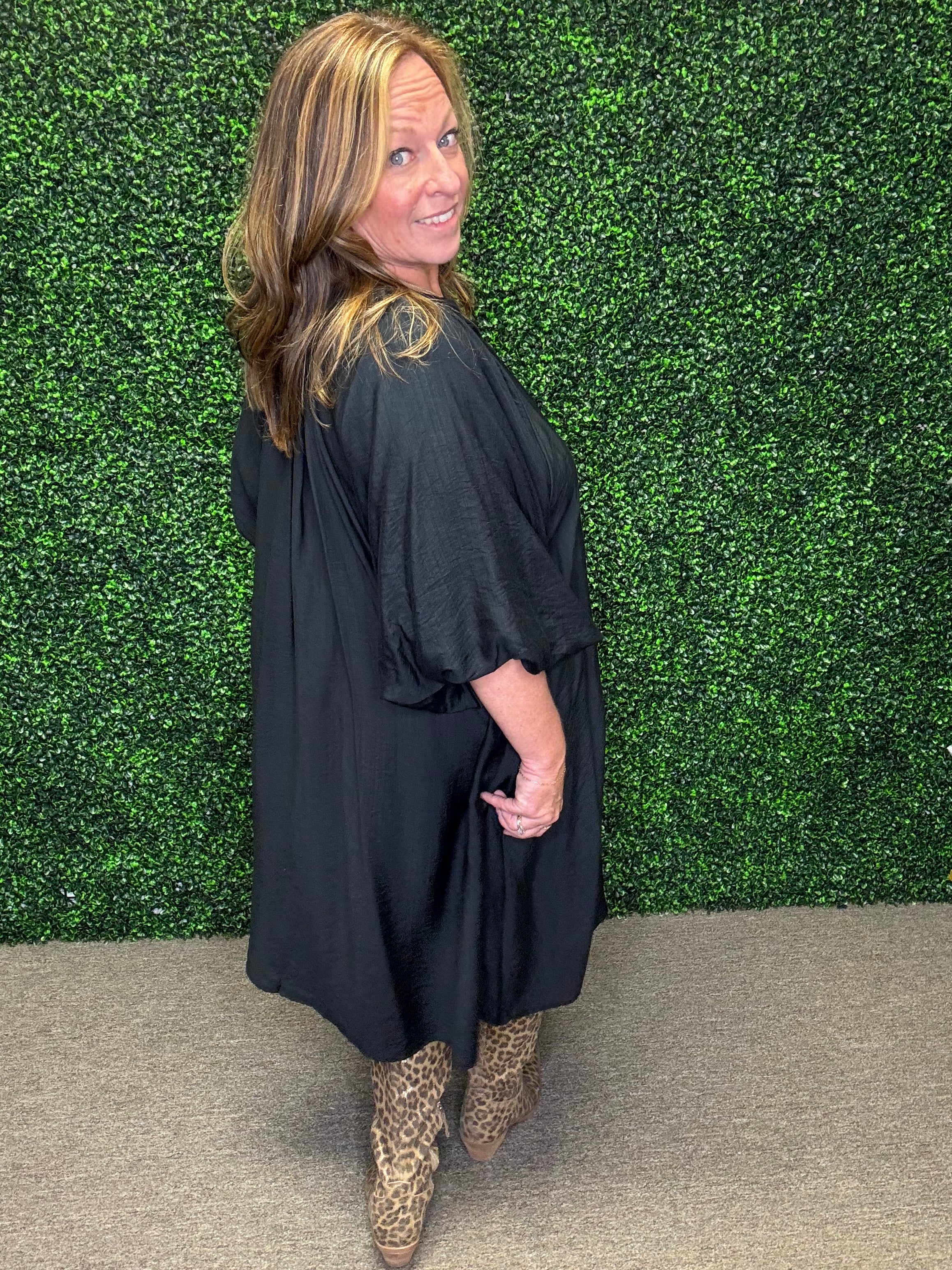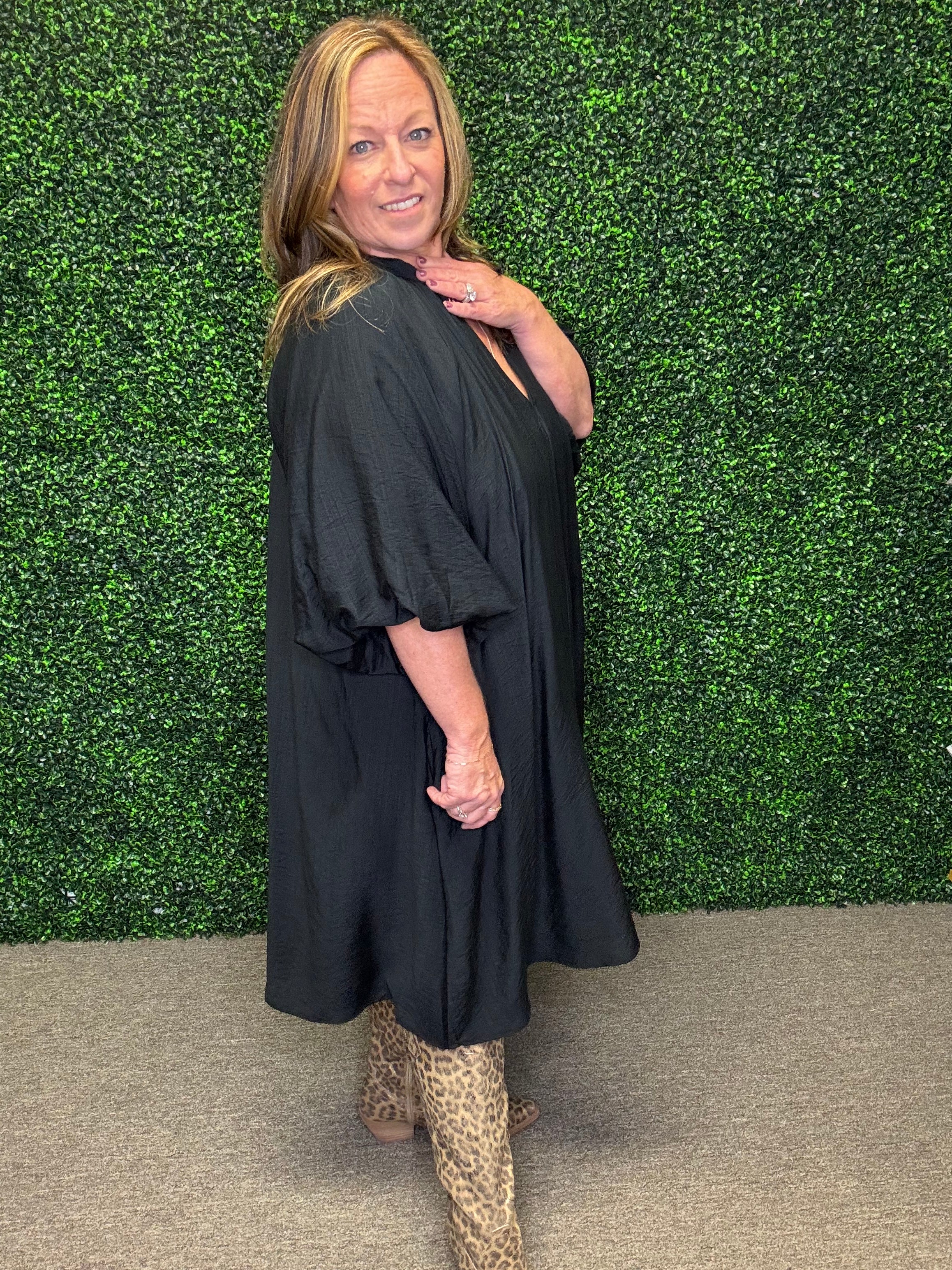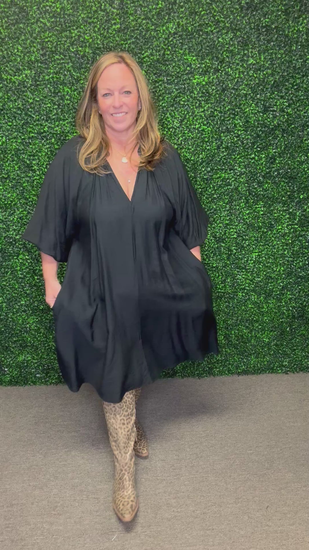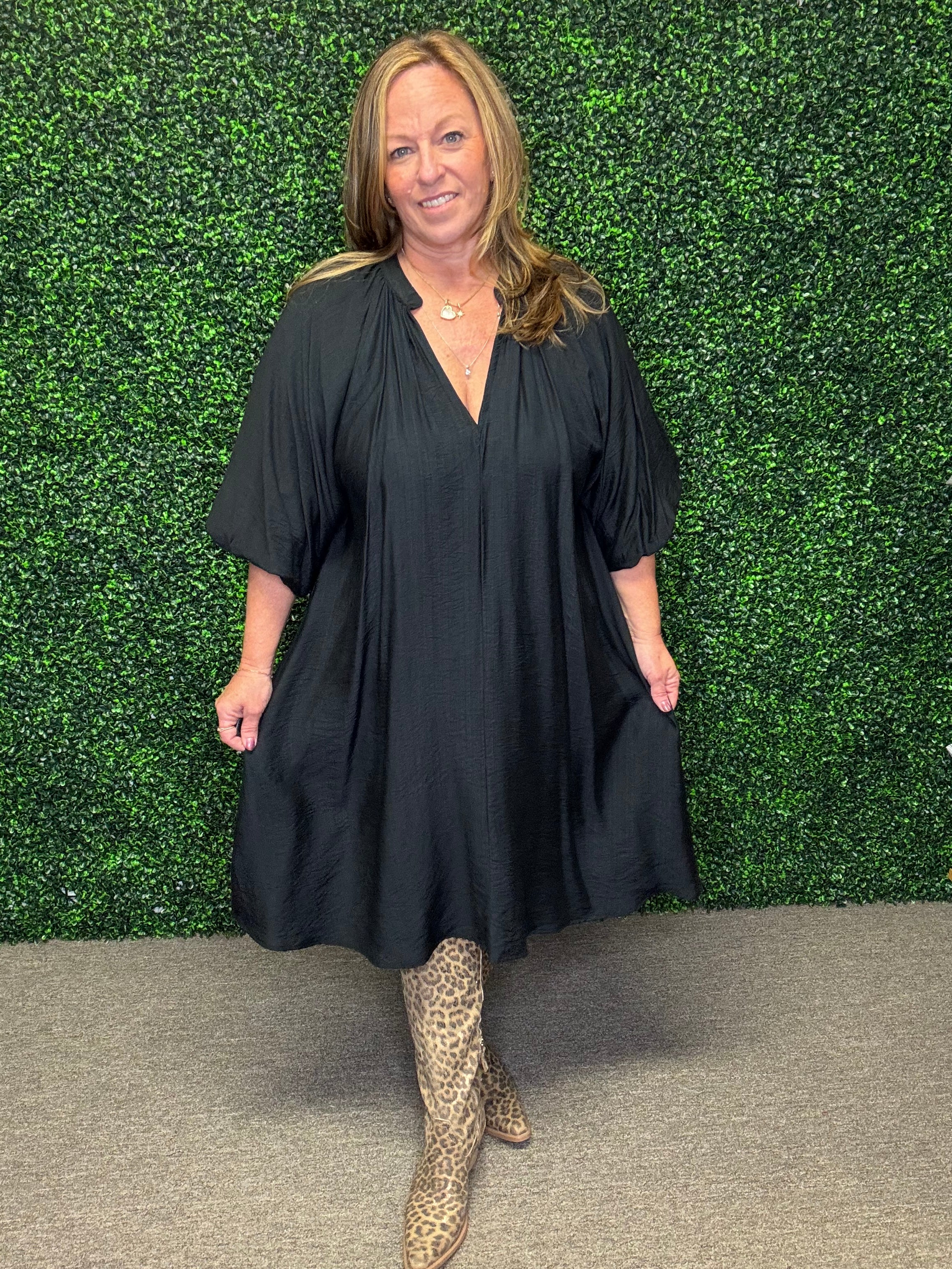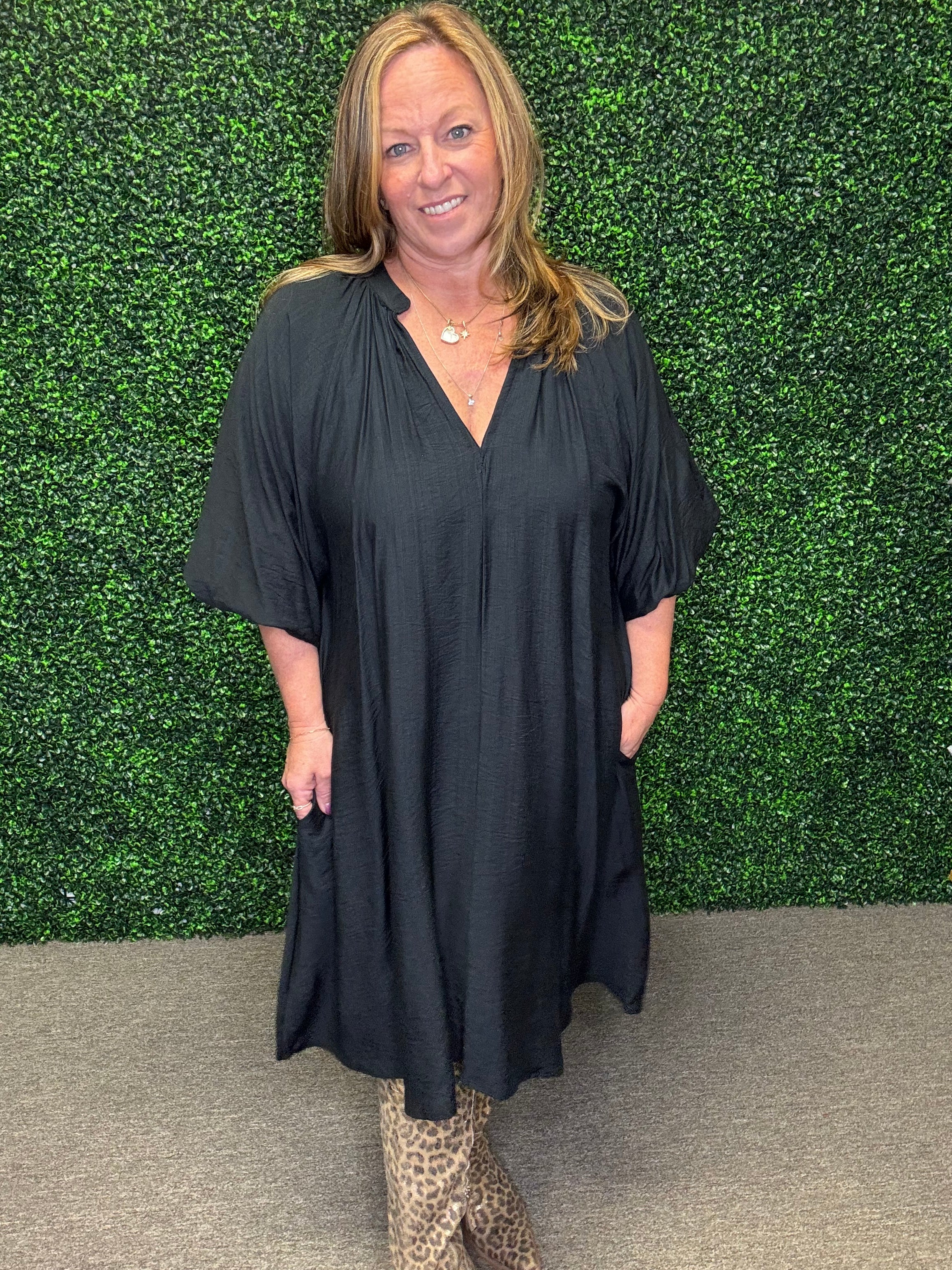 Every wardrobe needs a timeless piece, and this black A-line dress is just that — the perfect staple for every season and occasion. Crafted from lightweight polyester, it drapes beautifully with a flattering V-neckline and elbow-length sleeves. Side pockets add functionality without sacrificing style, making it an effortless go-to for work, church, or a night out.