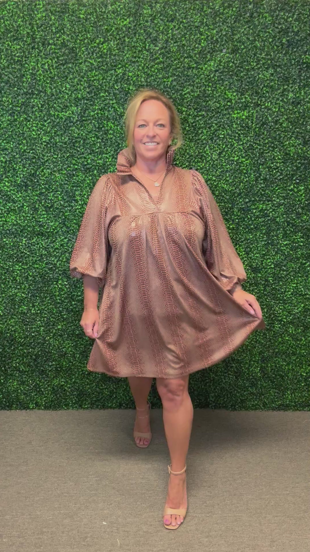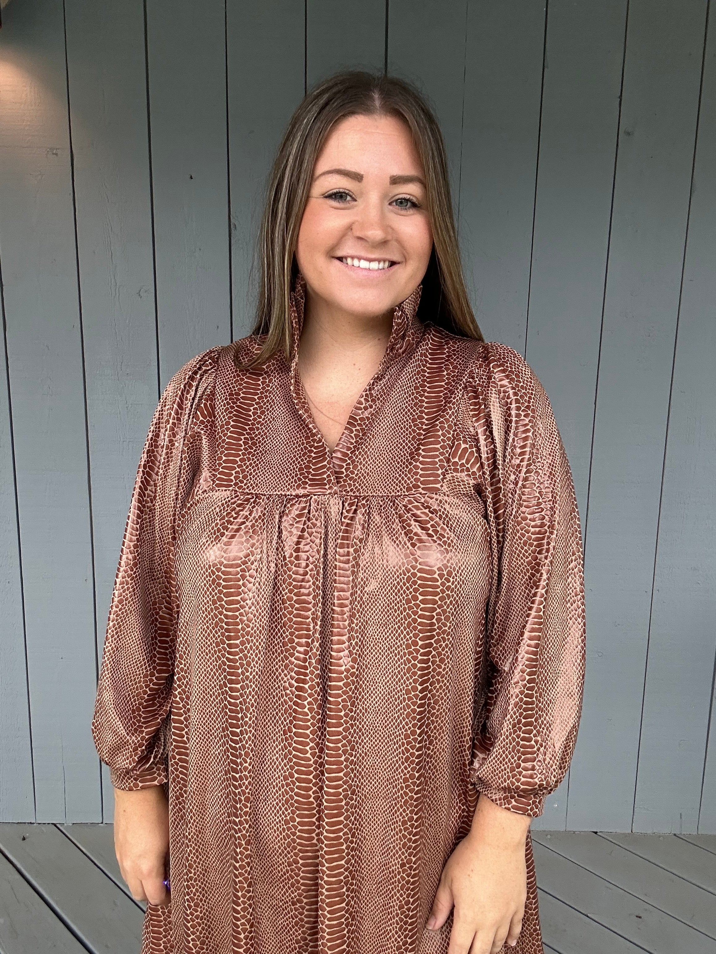 Make a statement in this luxurious, splurge-worthy dress that feels every bit as special as it looks. Designed with a unique faux copperhead animal print and a chic high ruffle collar, this piece is sophisticated, bold, and simply stunning. With a soft attached lining and luxe faux-leather feel, it’s an unforgettable piece for your wardrobe.