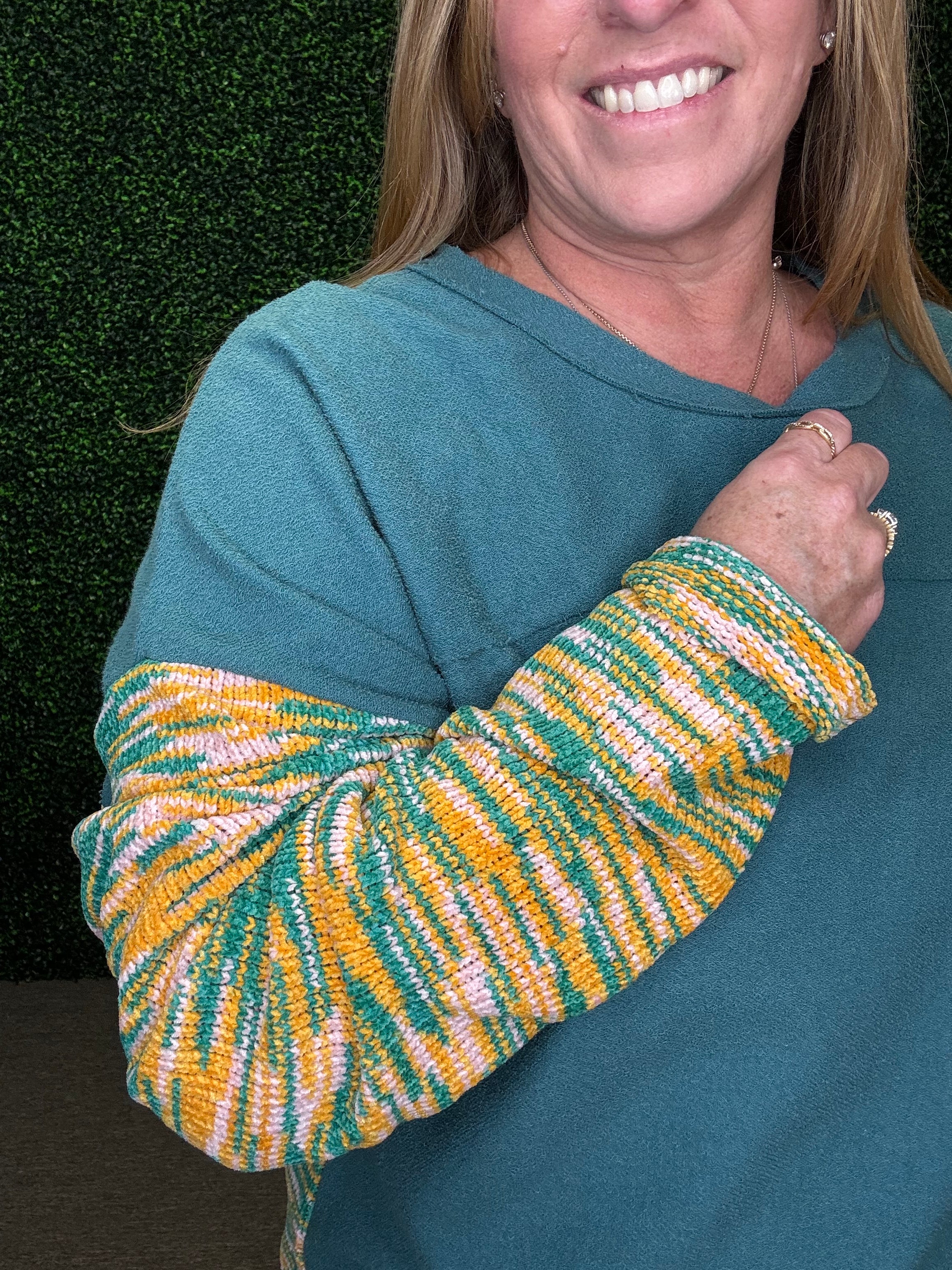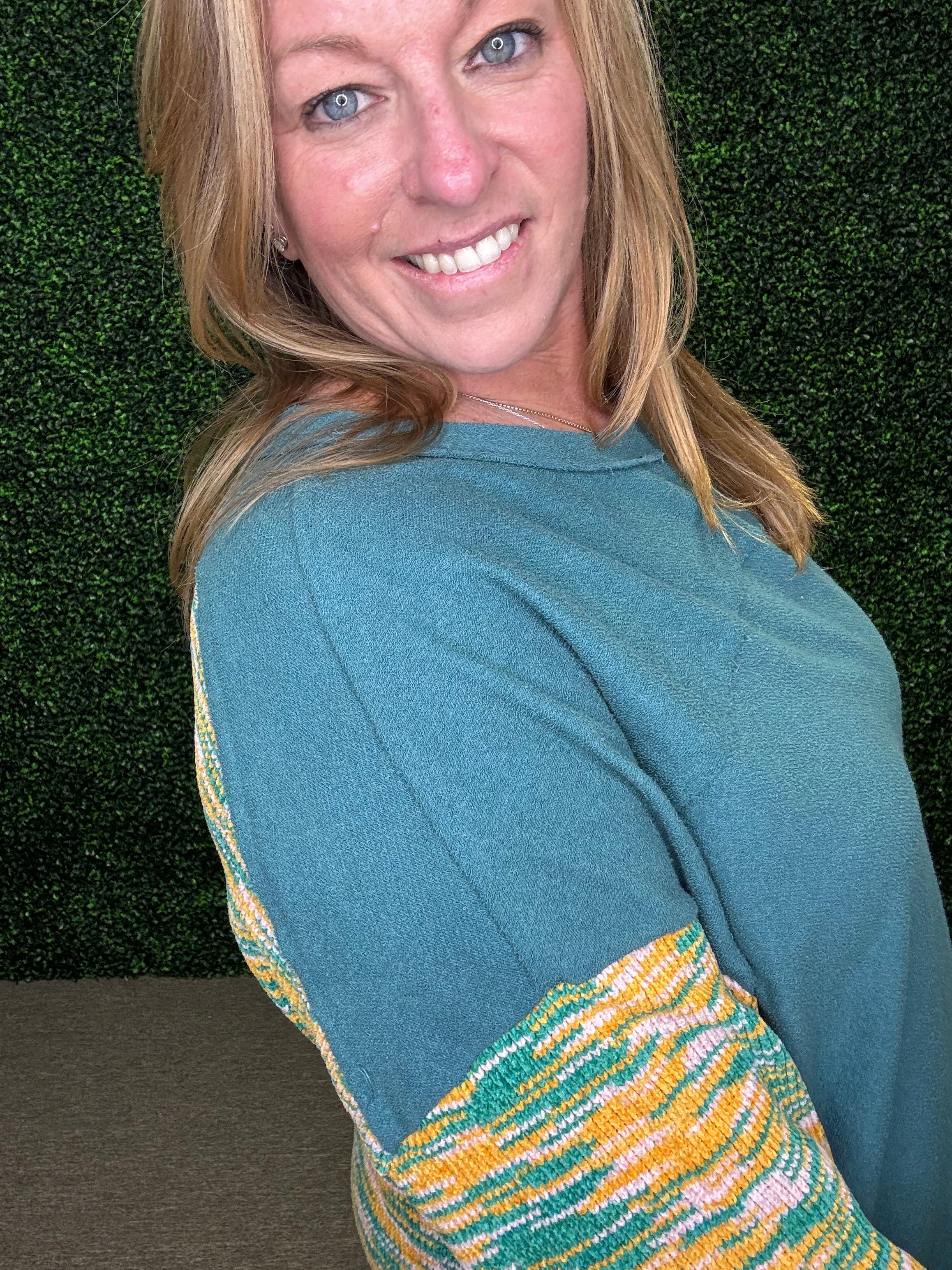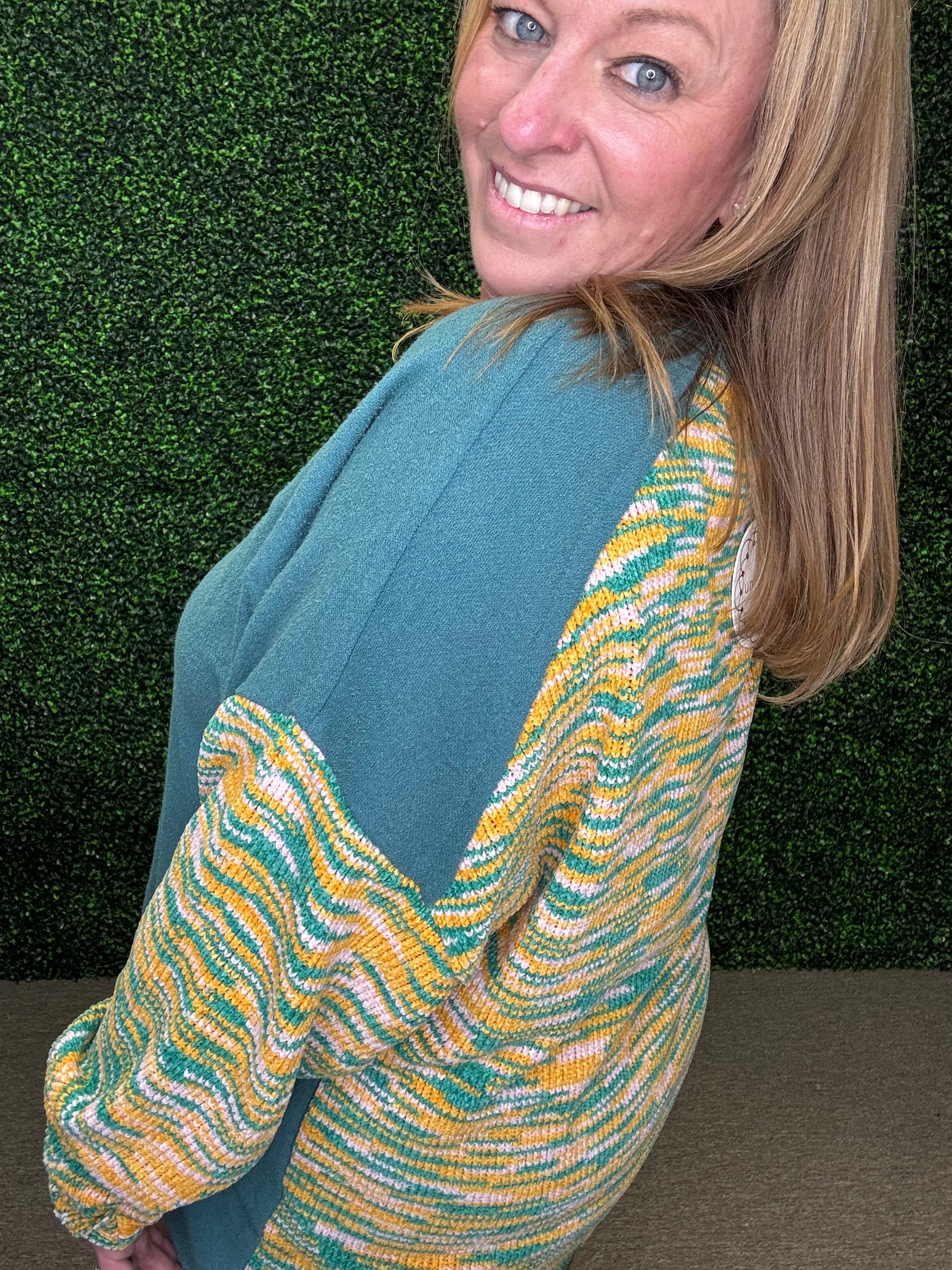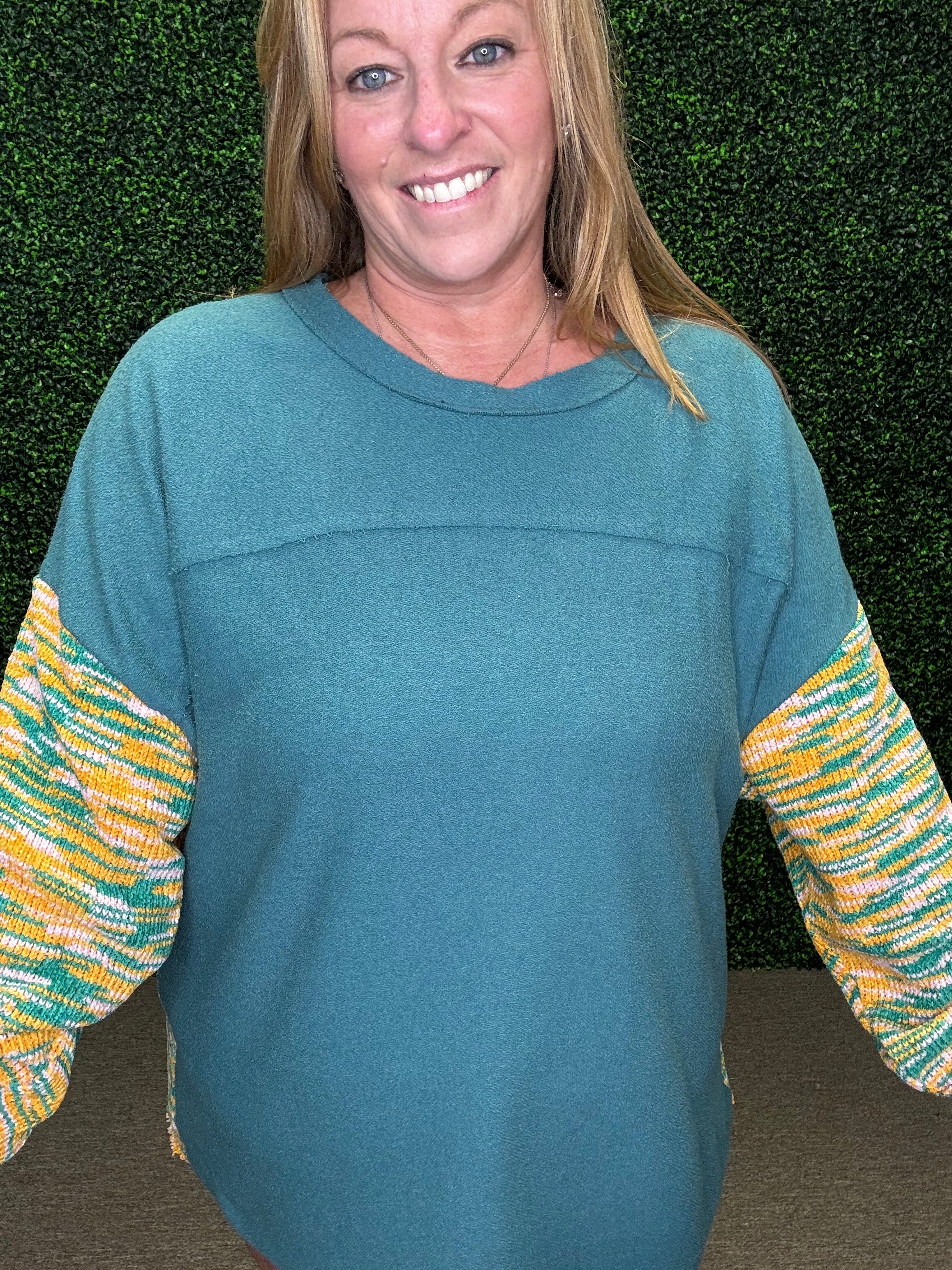 Add some color and cozy charm to your wardrobe with this playful pullover by Umgee! Crafted from soft French terry, it features a unique multicolored cut & sew design with a raw hem for a casual, laid-back vibe. Comfortable yet stylish, this sweater is perfect for everyday wear when you want to feel relaxed but still look put together.