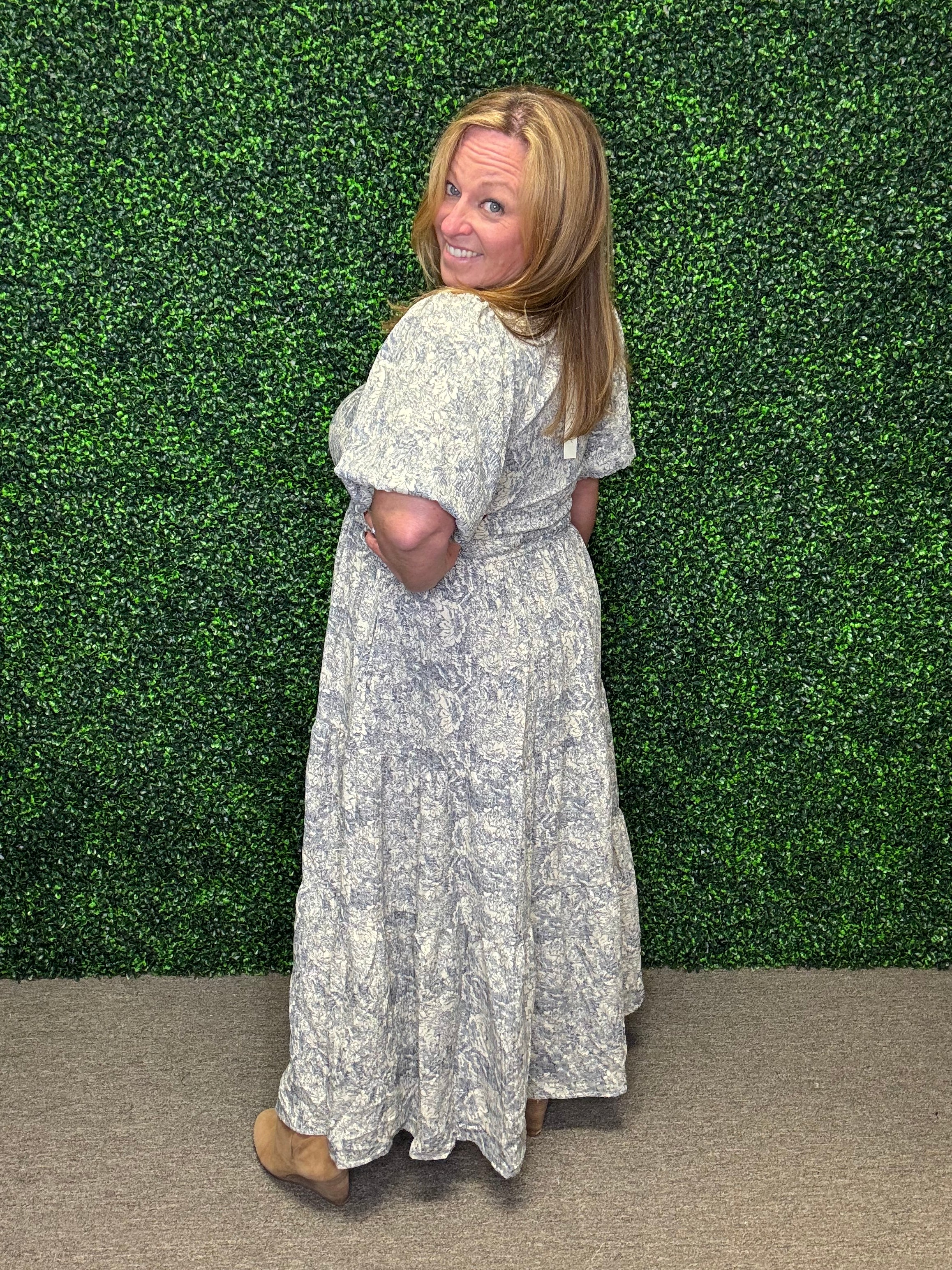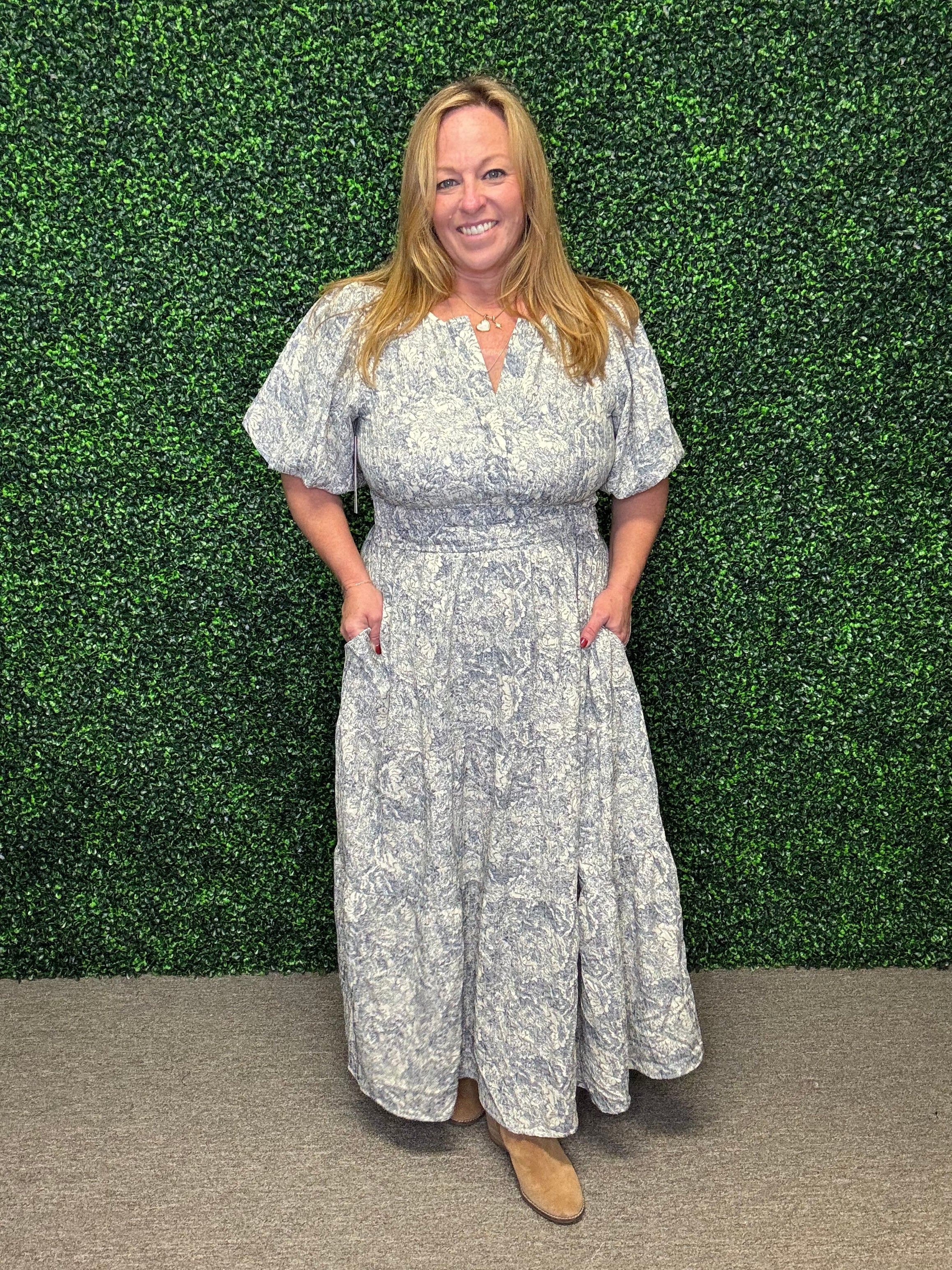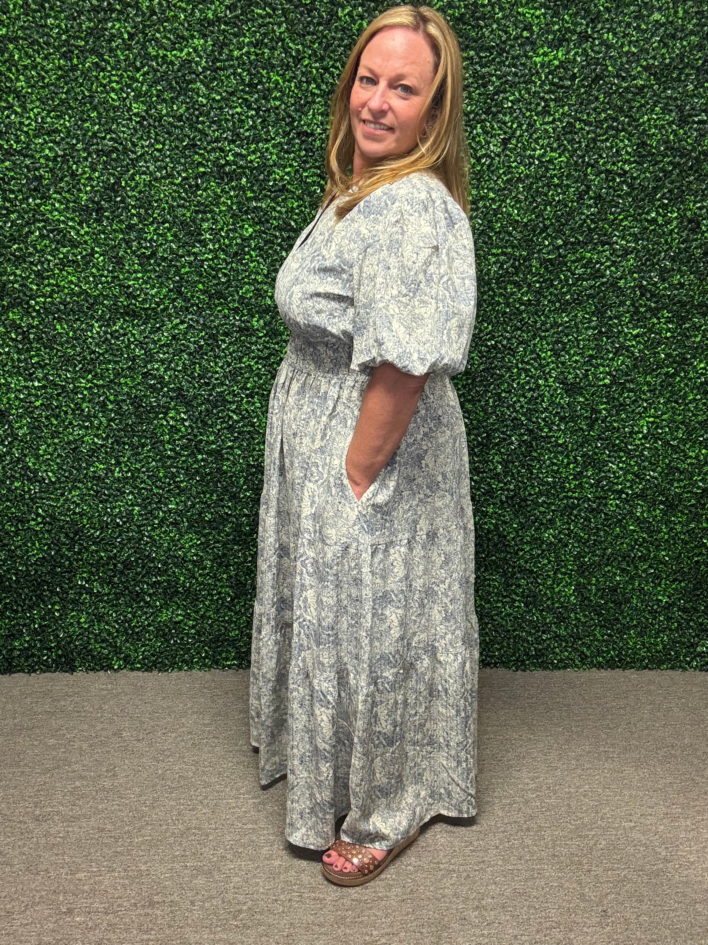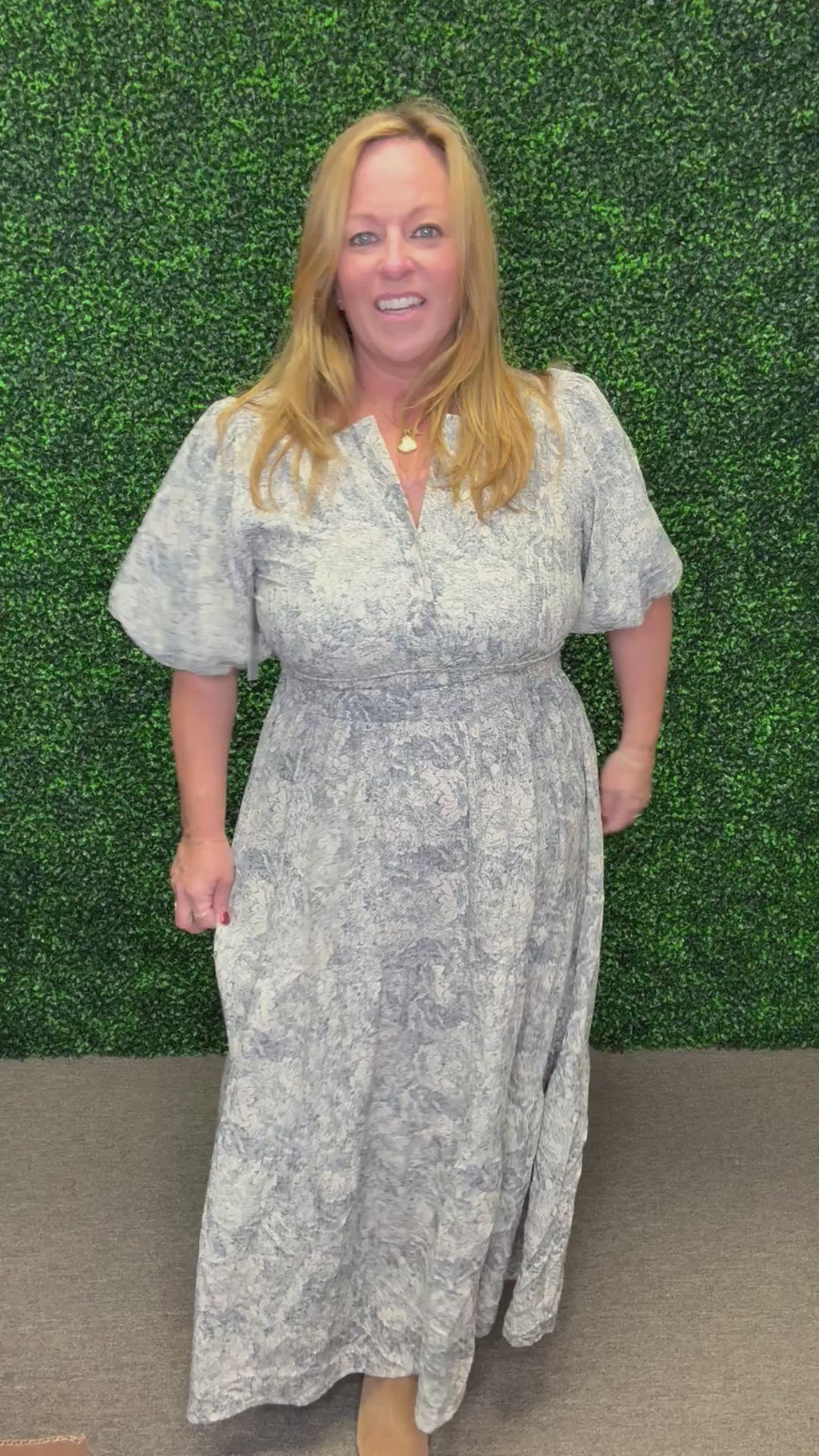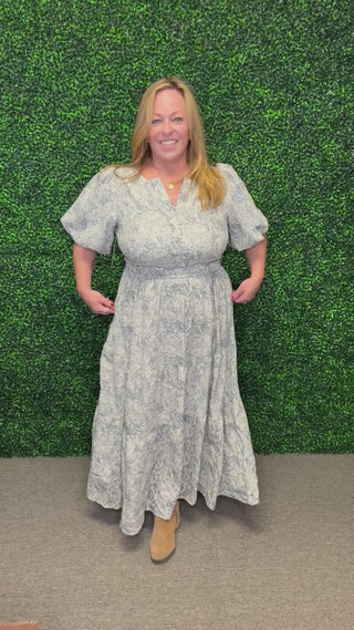 Perfect for any occasion, the She + Sky Slate Blue Floral Maxi combines effortless elegance with everyday comfort. Designed with a flattering silhouette, this maxi features a softly tiered body, an elasticized waistband that hits at the natural waistline, and convenient pockets—making it as practical as it is beautiful. The half balloon sleeves add just the right amount of volume, giving this dress a timeless yet modern feel.