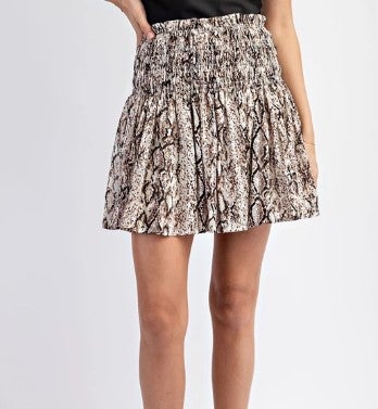 Unleash your fierce side with the Wild Instinct Snake Print Smocked Skort. This bold mini skort combines the playful style of a skirt with the confidence and coverage of lined shorts underneath. Featuring a flattering smocked waistband for a comfortable, flexible fit, it moves with you while keeping you secure. Made from 100% polyester, the lightweight fabric showcases a striking snake print that adds edge to any outfit. Perfect for a night out or a stylish day look—pair it with a fitted top and boots for maximum impact.