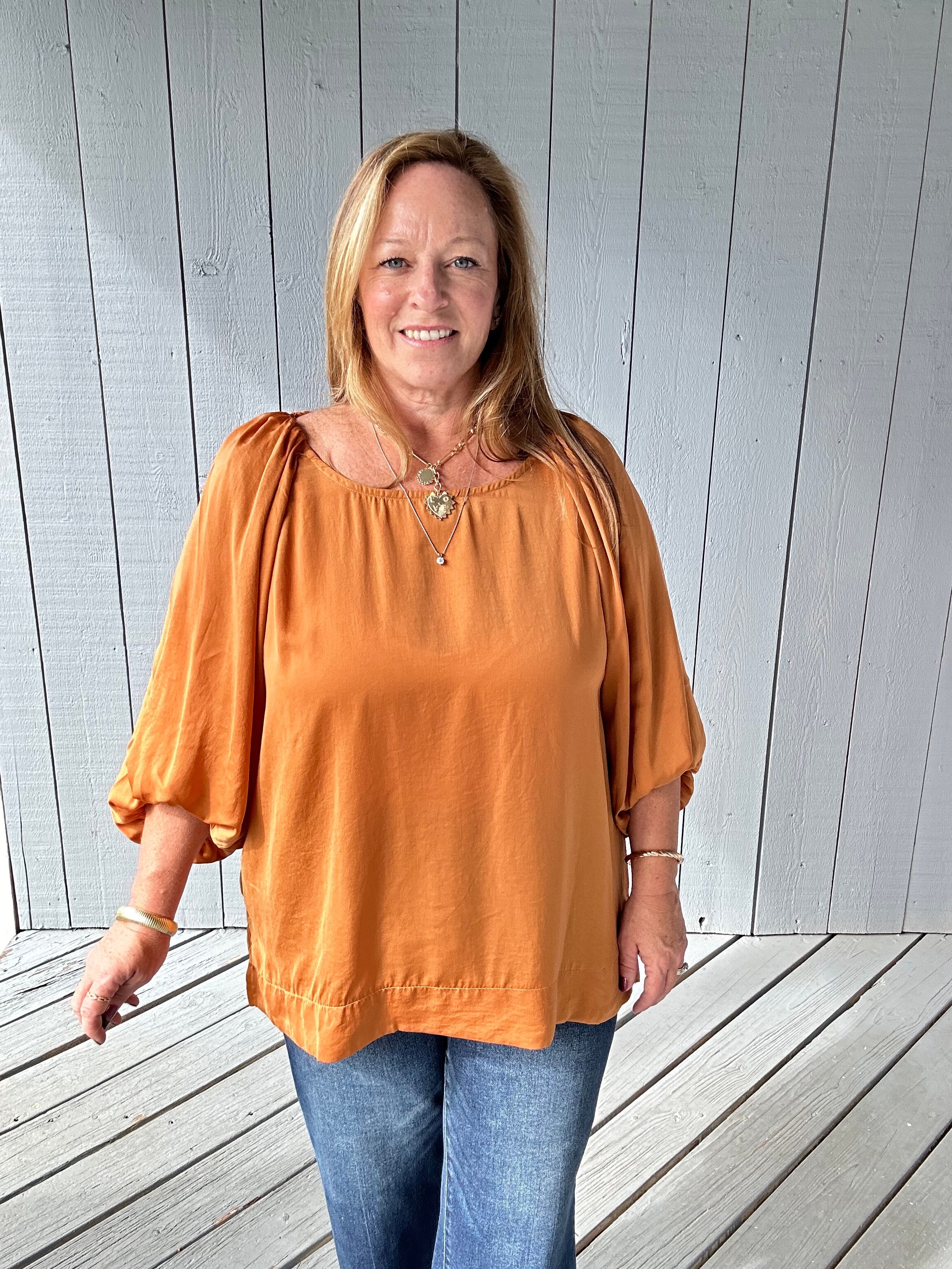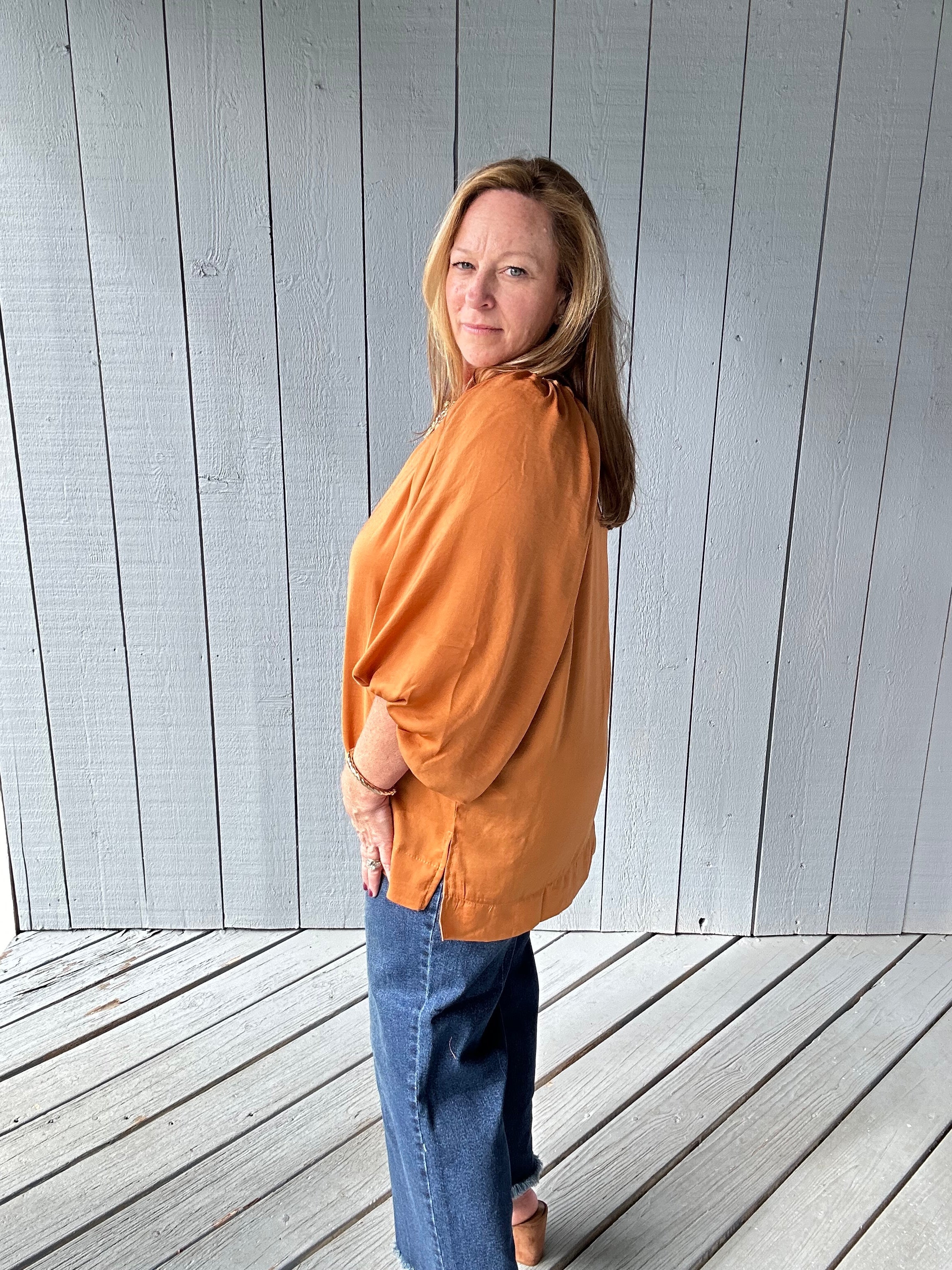 This curvy-exclusive beauty brings rich fall color and chic comfort together in one stunning top. The Cinnamon Satin Top is crafted in a washed satin fabric that gives a subtle sheen and elegant drape — perfect for transitioning from casual coffee dates to elevated evenings out.