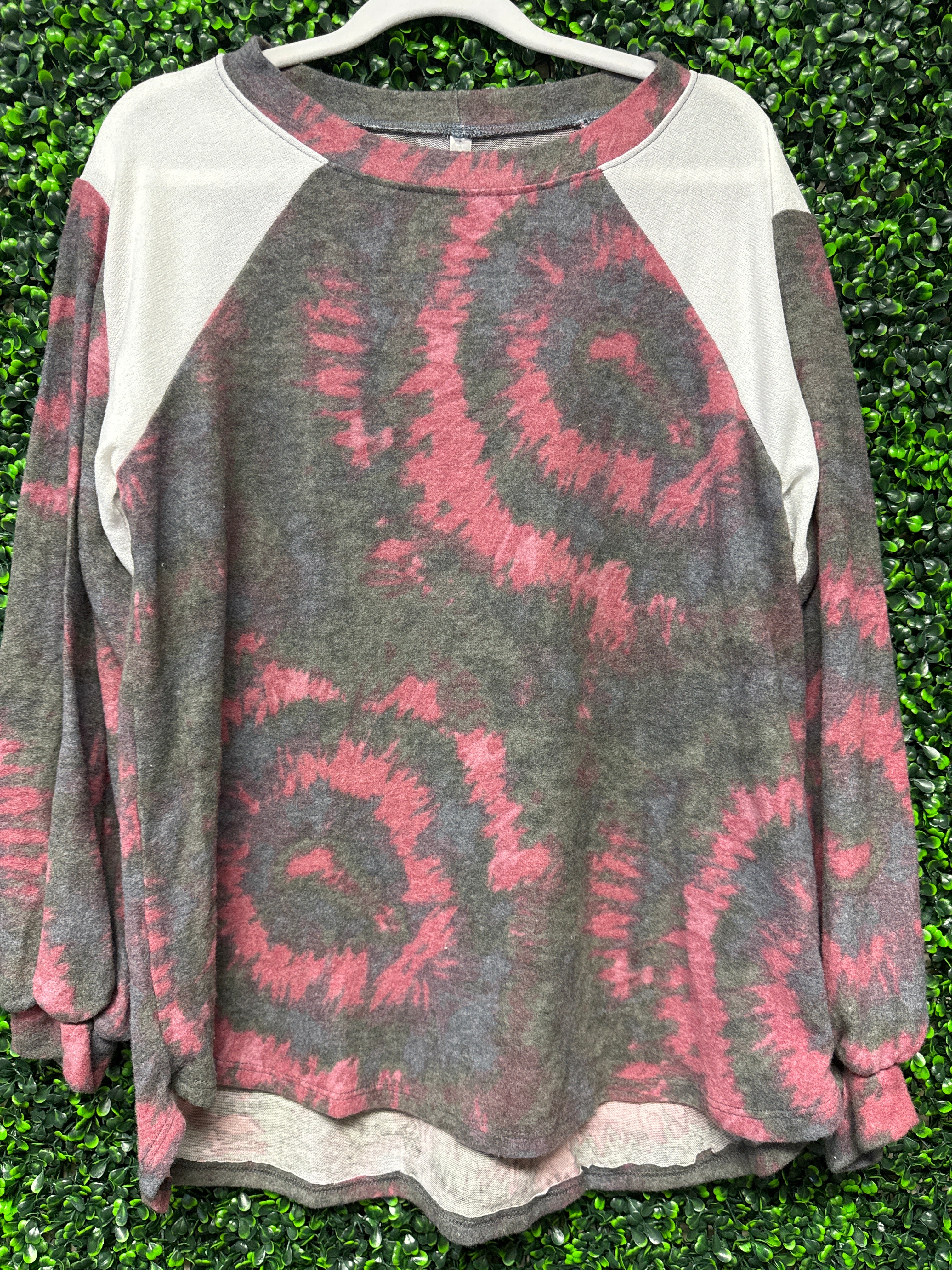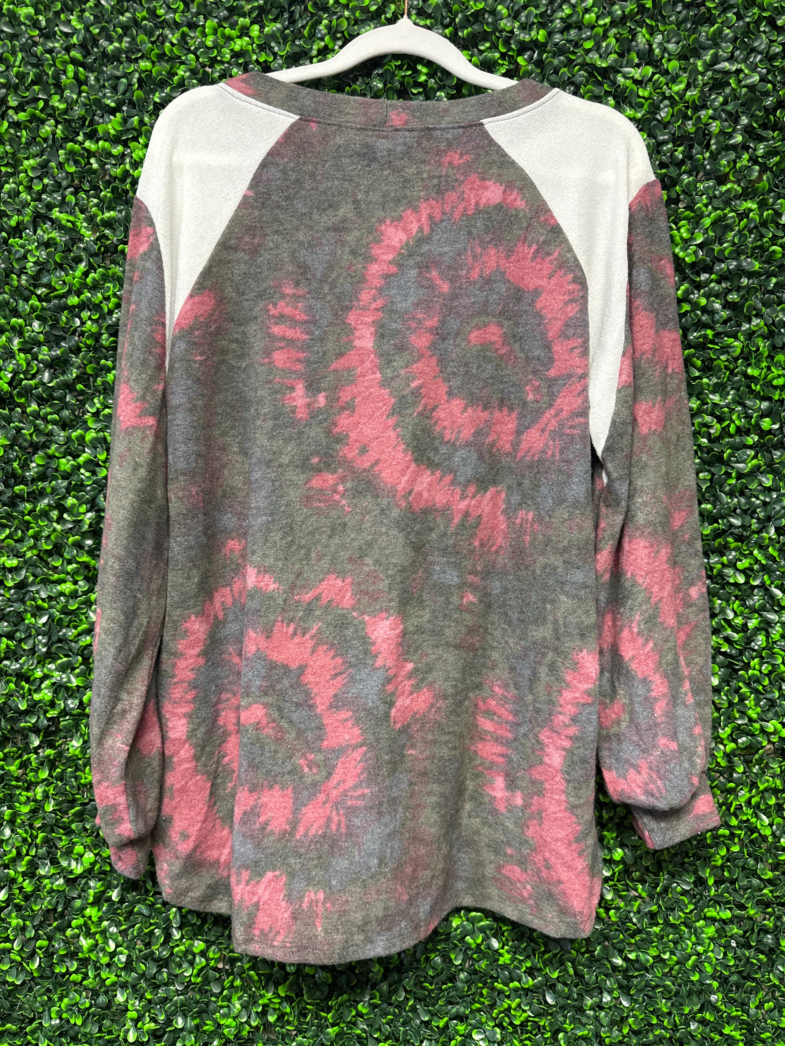 Soft, comfortable, and effortlessly cute, this Emerald top brings a fun pop of color while keeping that easy, everyday feel. The gray base with light burgundy tie dye swirls and crisp white shoulders creates a flattering contrast that stands out without being over the top.