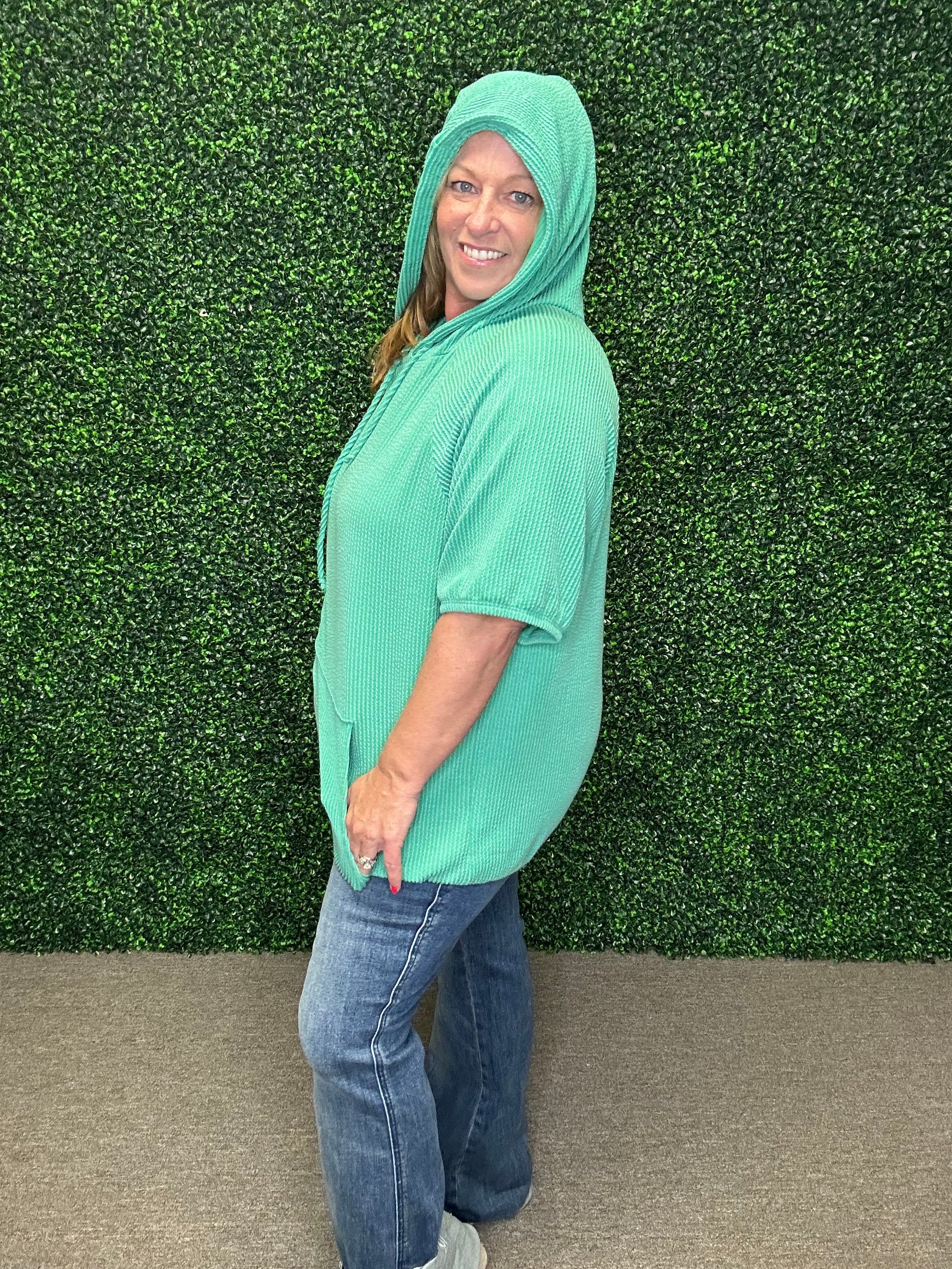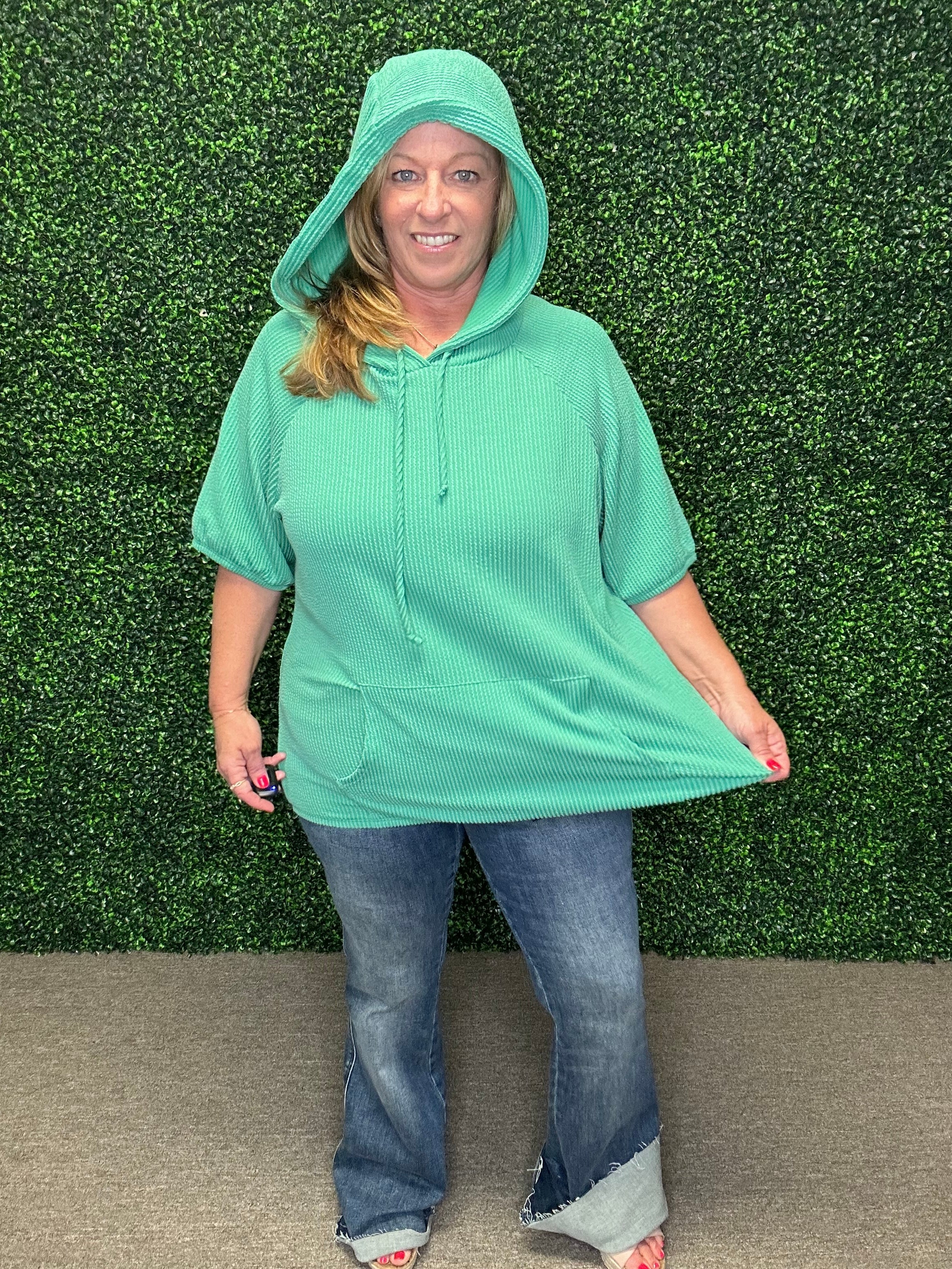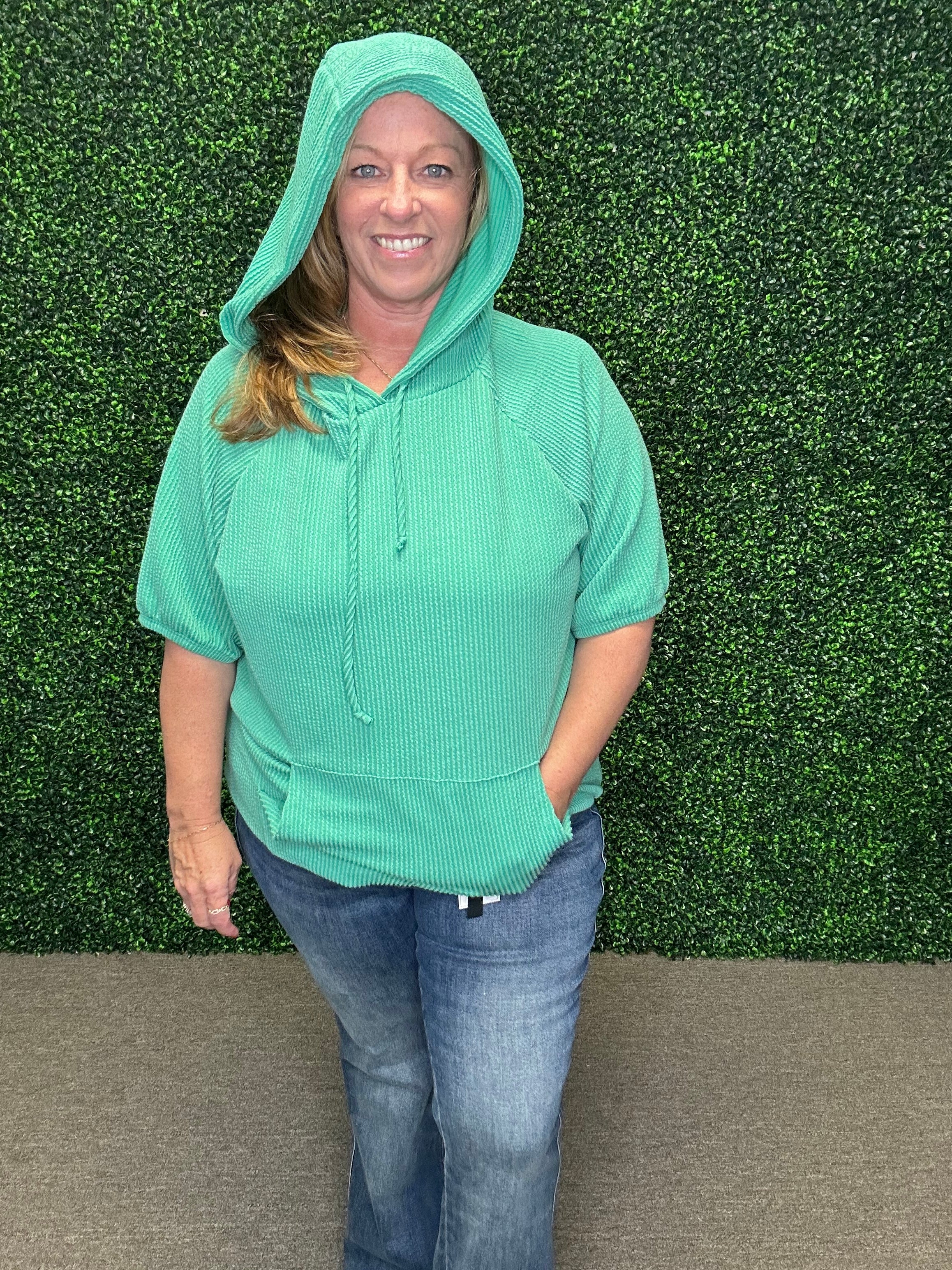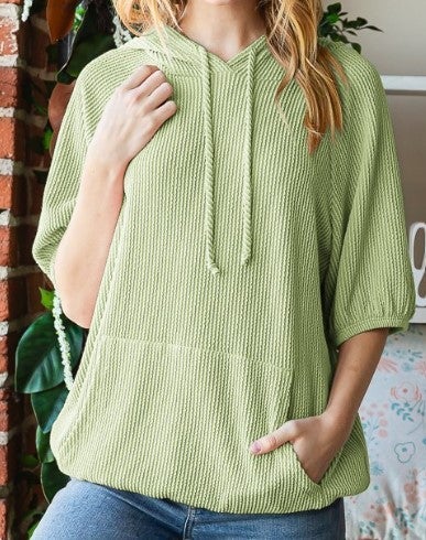 We are loving this new hoodie by Heimish. The perfect shades of green to lead you into spring as we transition from cold to warmer weather. This hoodie is the perfect layering piece or it can be worn by itself. The hoodie features a functioning drawstring at the neck, a band at the bottom and a kangaroo pouch pocket. The sleeves are elbow length!