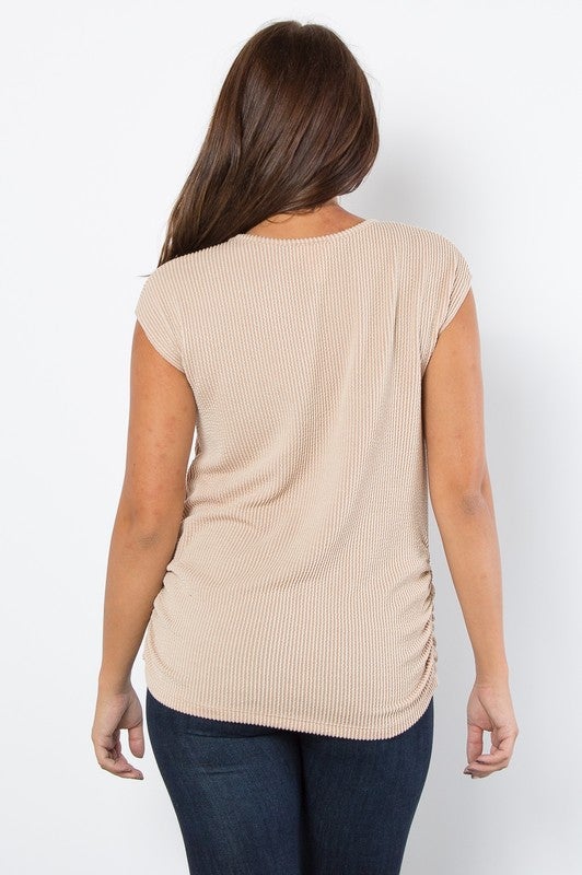 Elevate your style with our Raised Rib Side Shirred Top. Featuring a unique raised rib design and shirred sides, this top adds texture and a flattering silhouette to any outfit. Don't be afraid to stand out with this playful and quirky top! It's so cute and can be paired with jeans, leggings or a skirt!