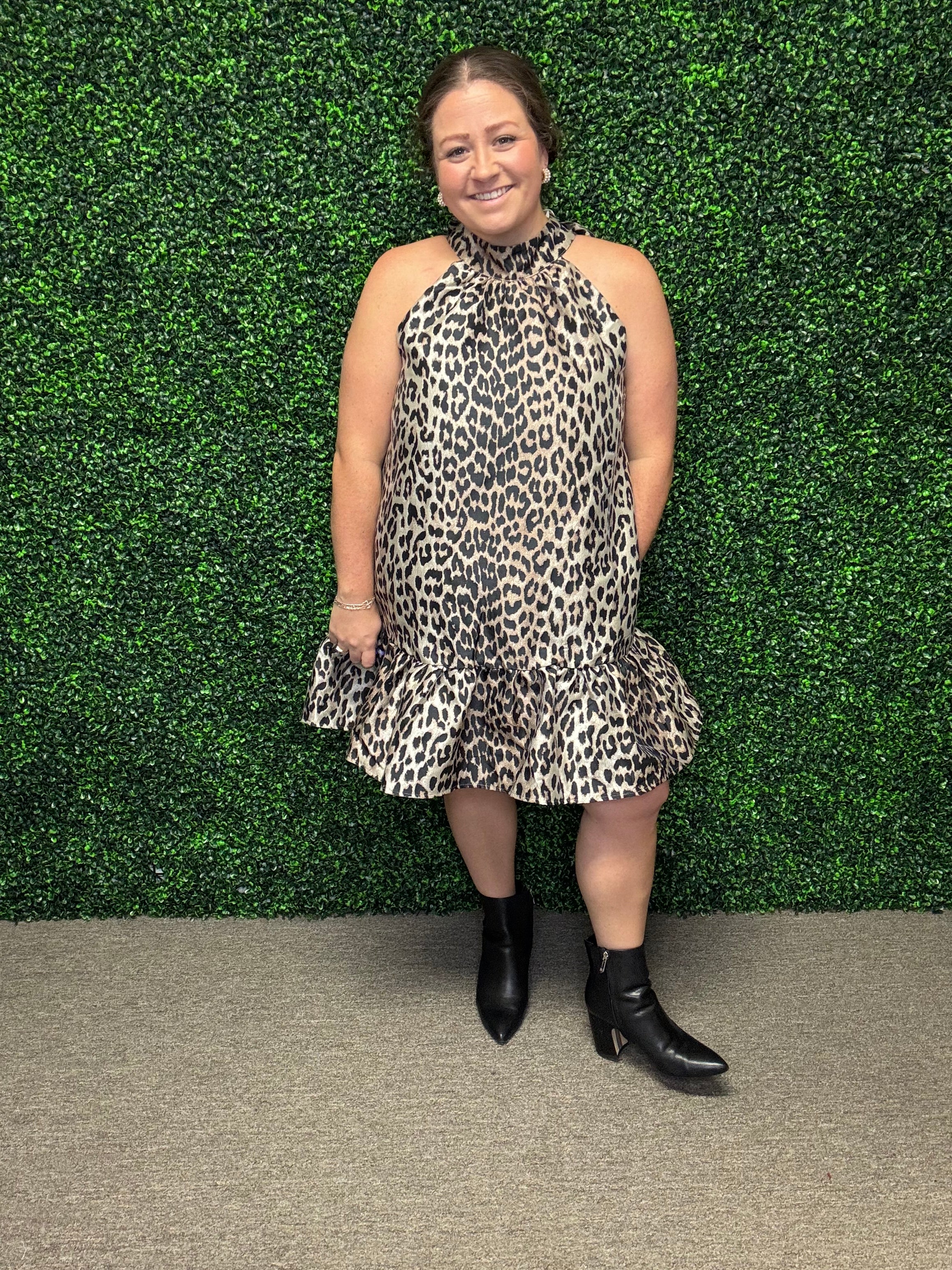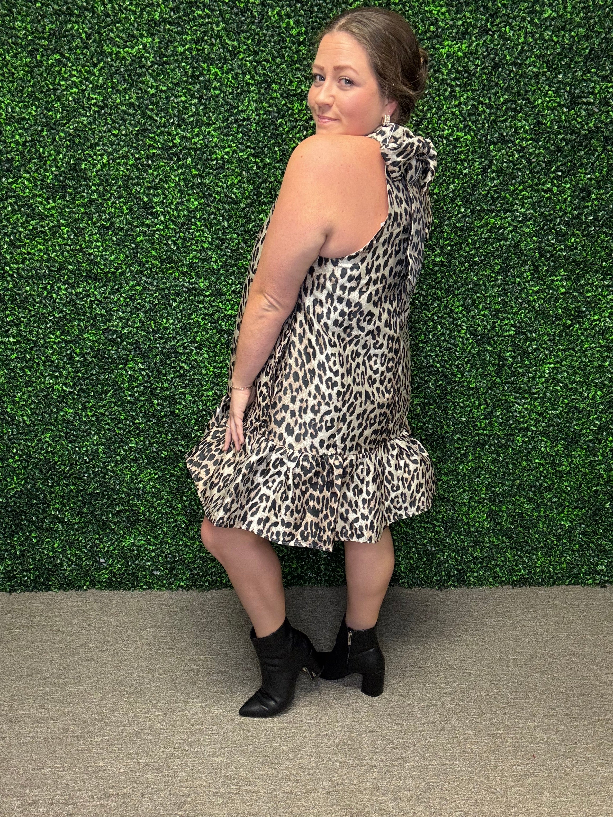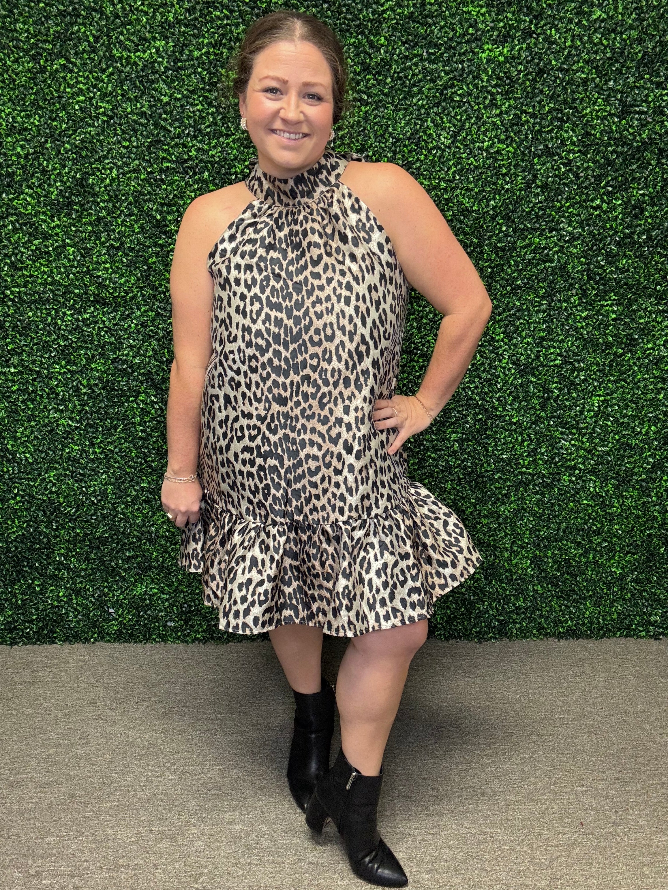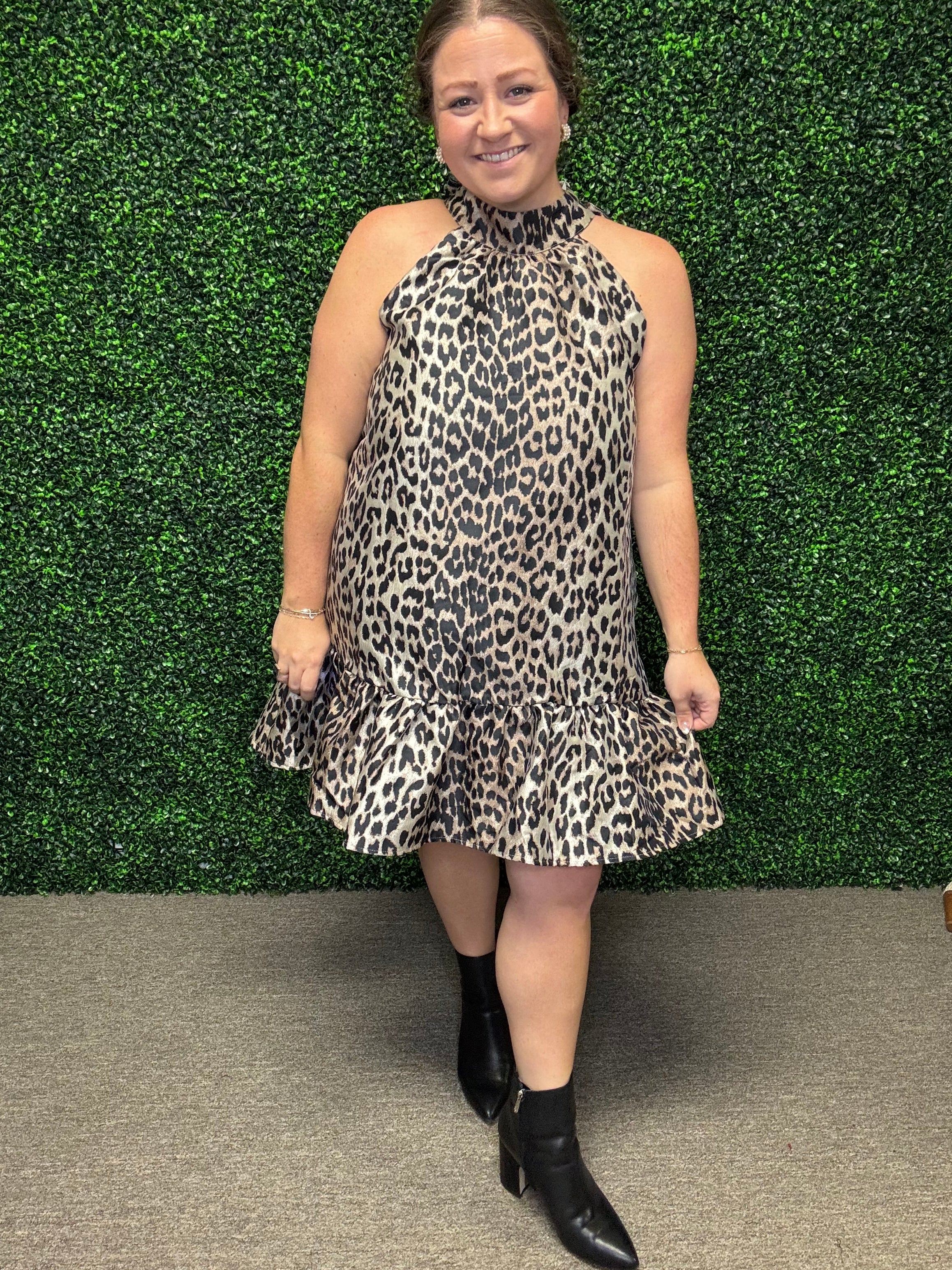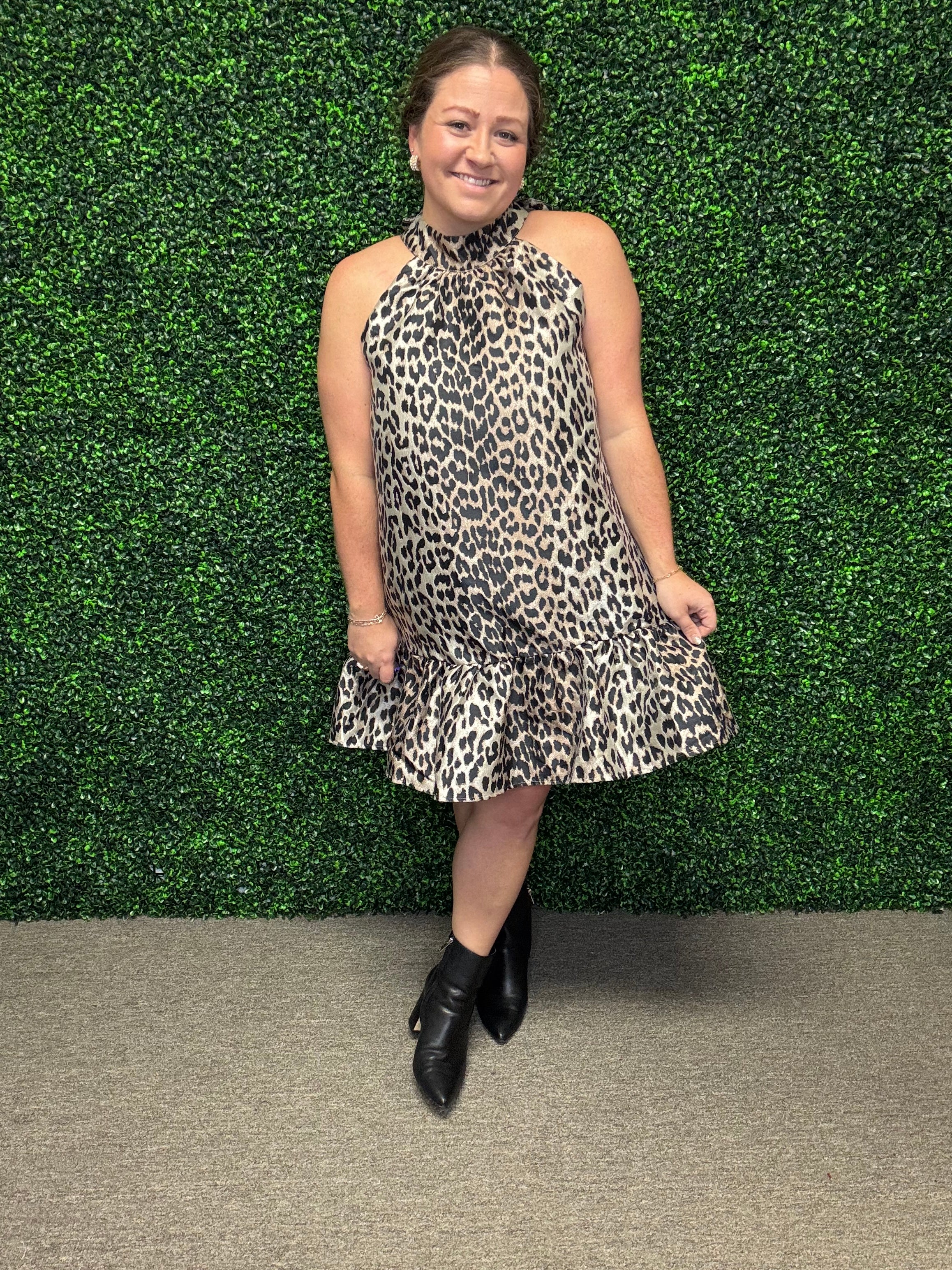 Pair this fun and flirty leopard halter mini with strappy heels and statement earrings for a night out, or dress it down with a denim jacket and sandals for a chic daytime look.