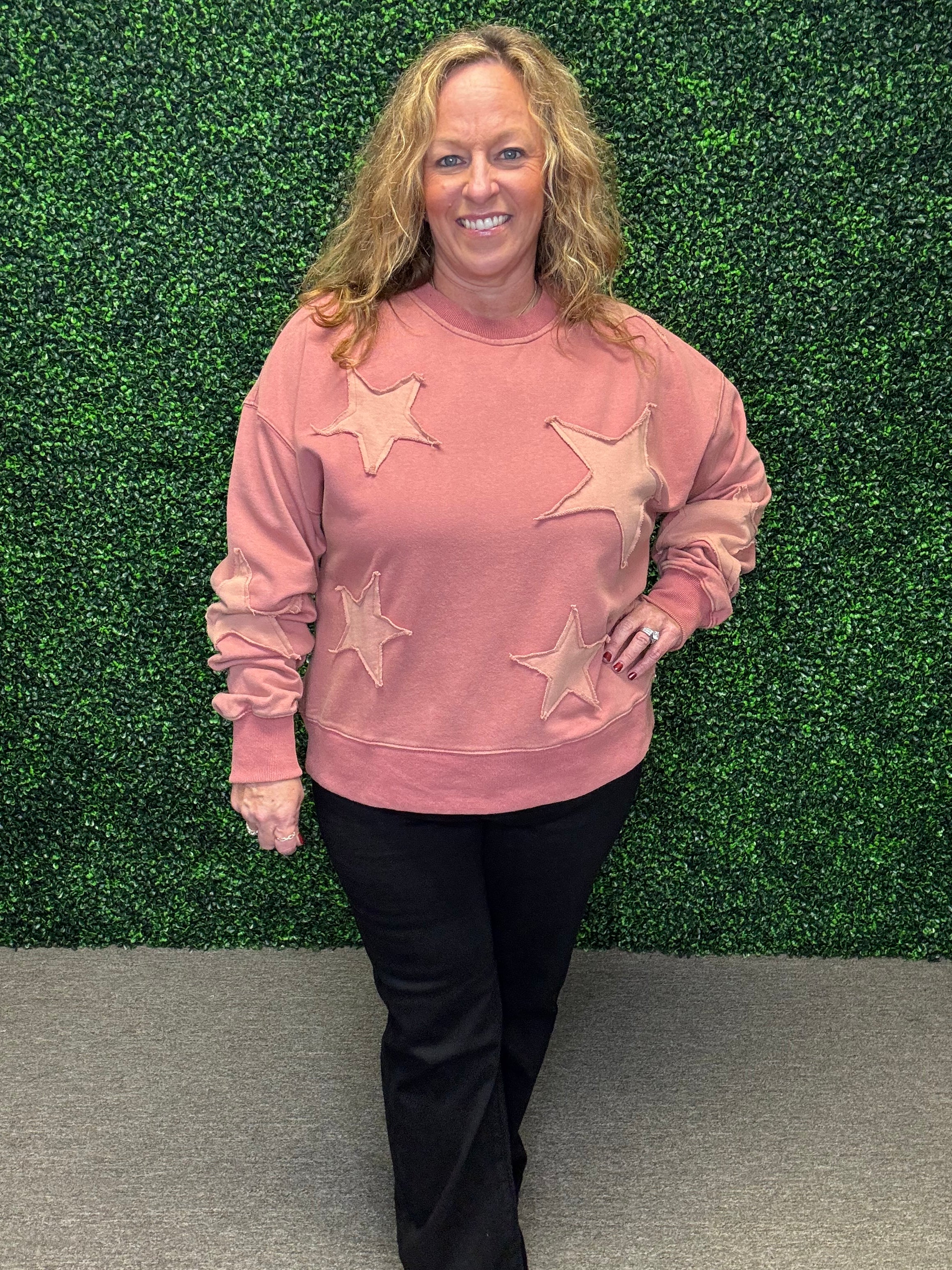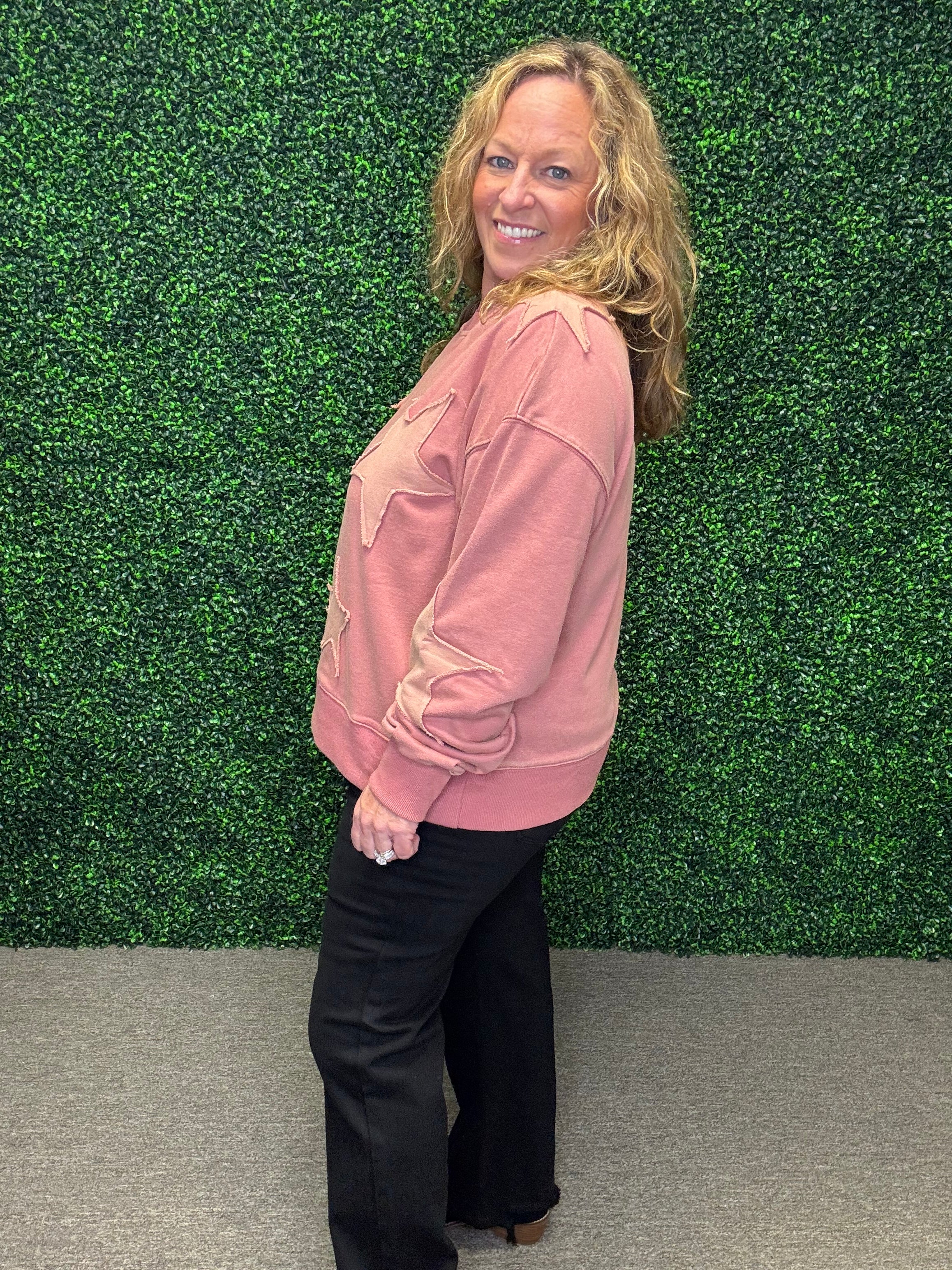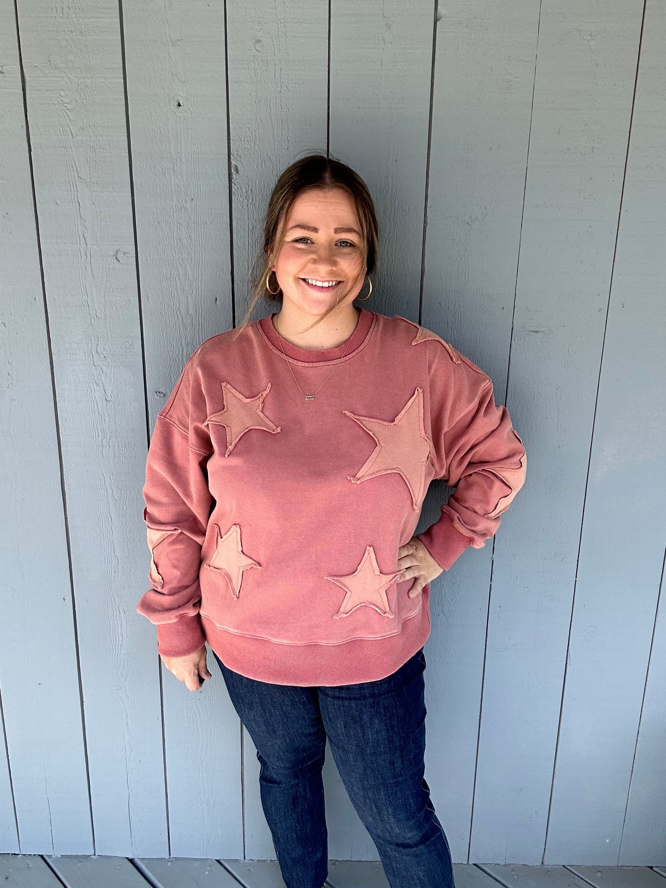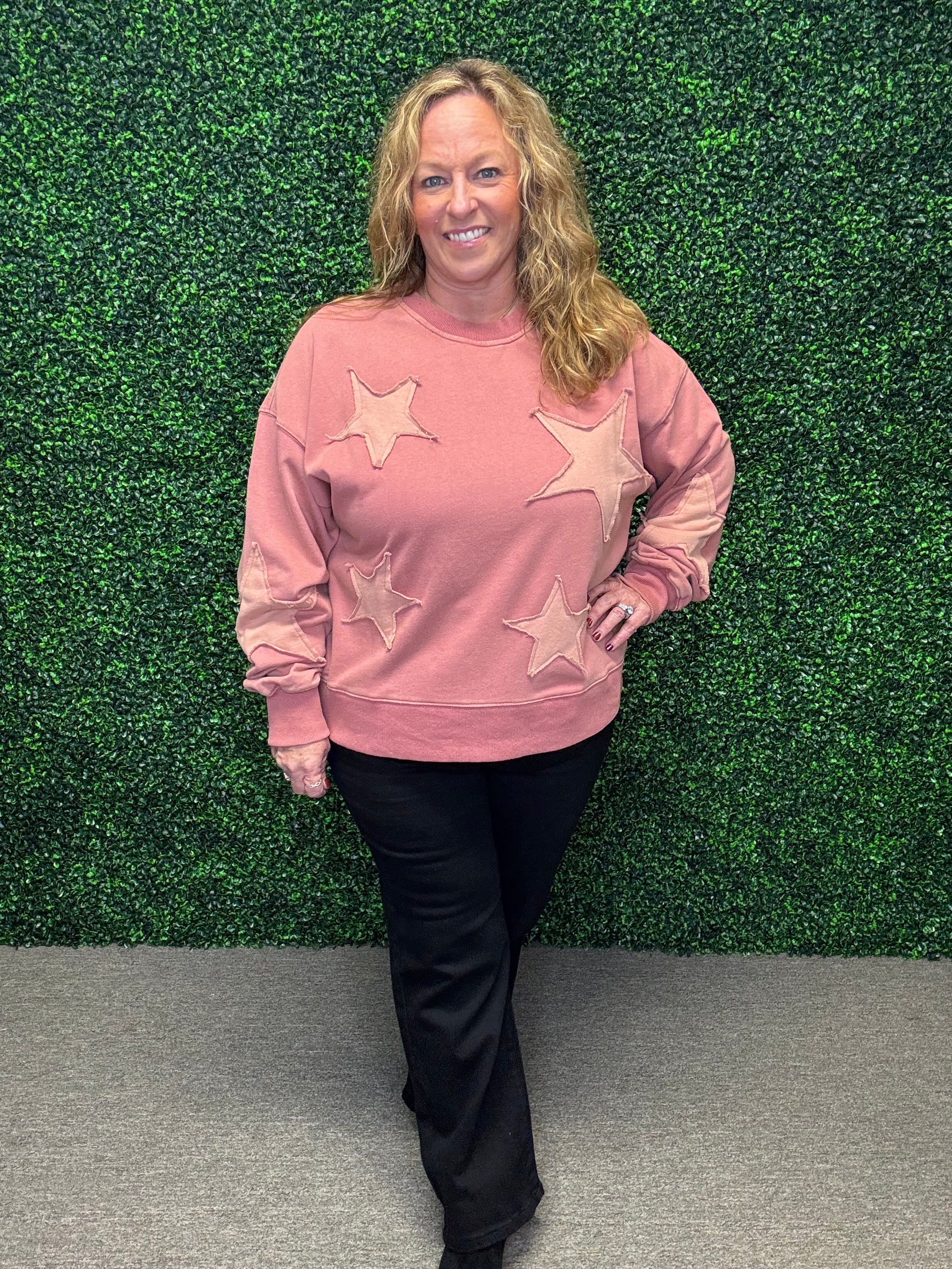 This fabulously cute sweatshirt pullover by White Birch is a new arrival from Fall Market, and it’s a keeper! Made with a heavier cotton-polyester blend, it’s perfect for cooler days. Designed in shades of pink with sewn-on stars across the arms and front, this pullover combines cozy comfort with playful style. The textured collar, cuff sleeves, and bottom trim complete the look, making it a standout piece you’ll love to wear.