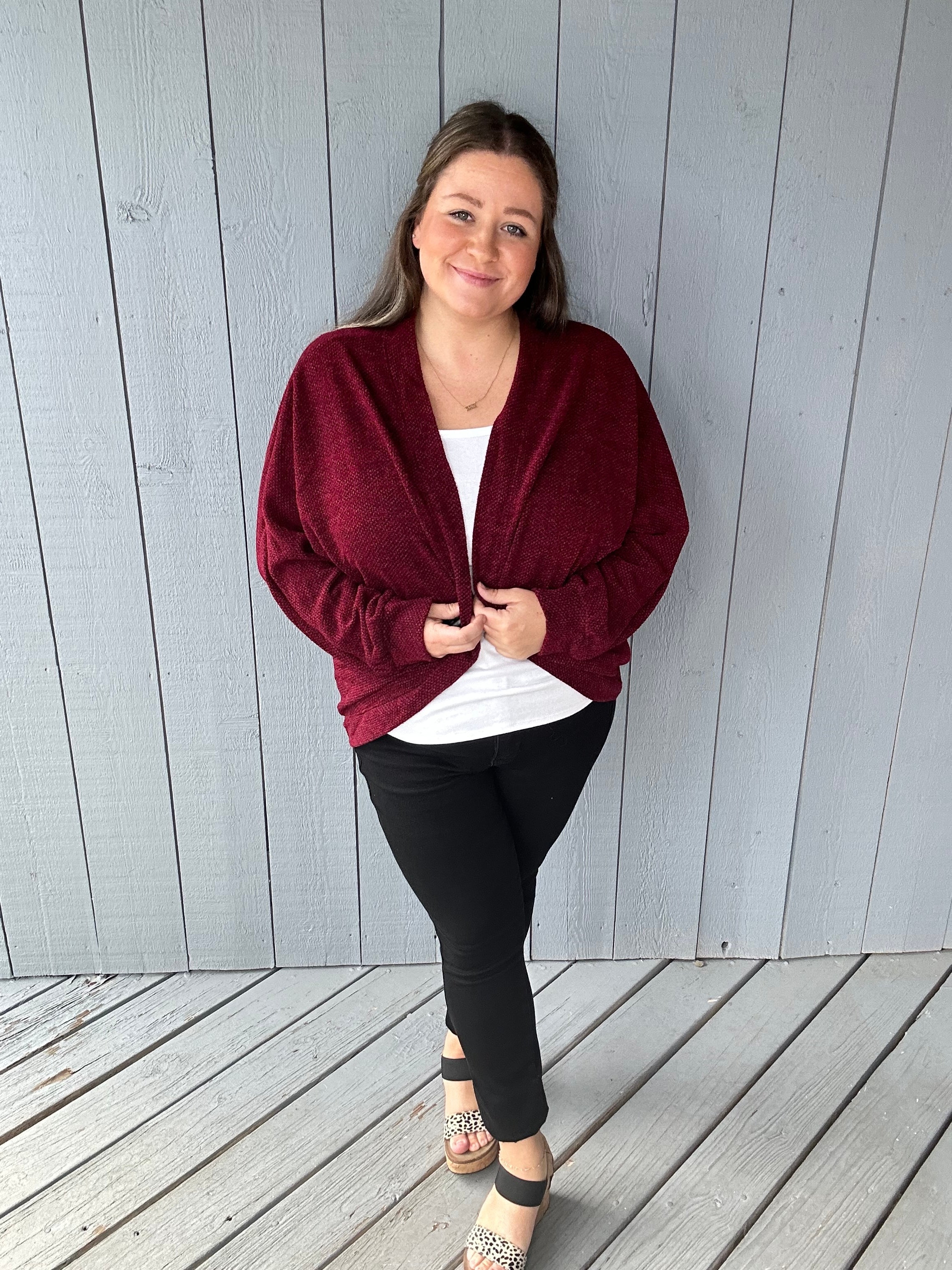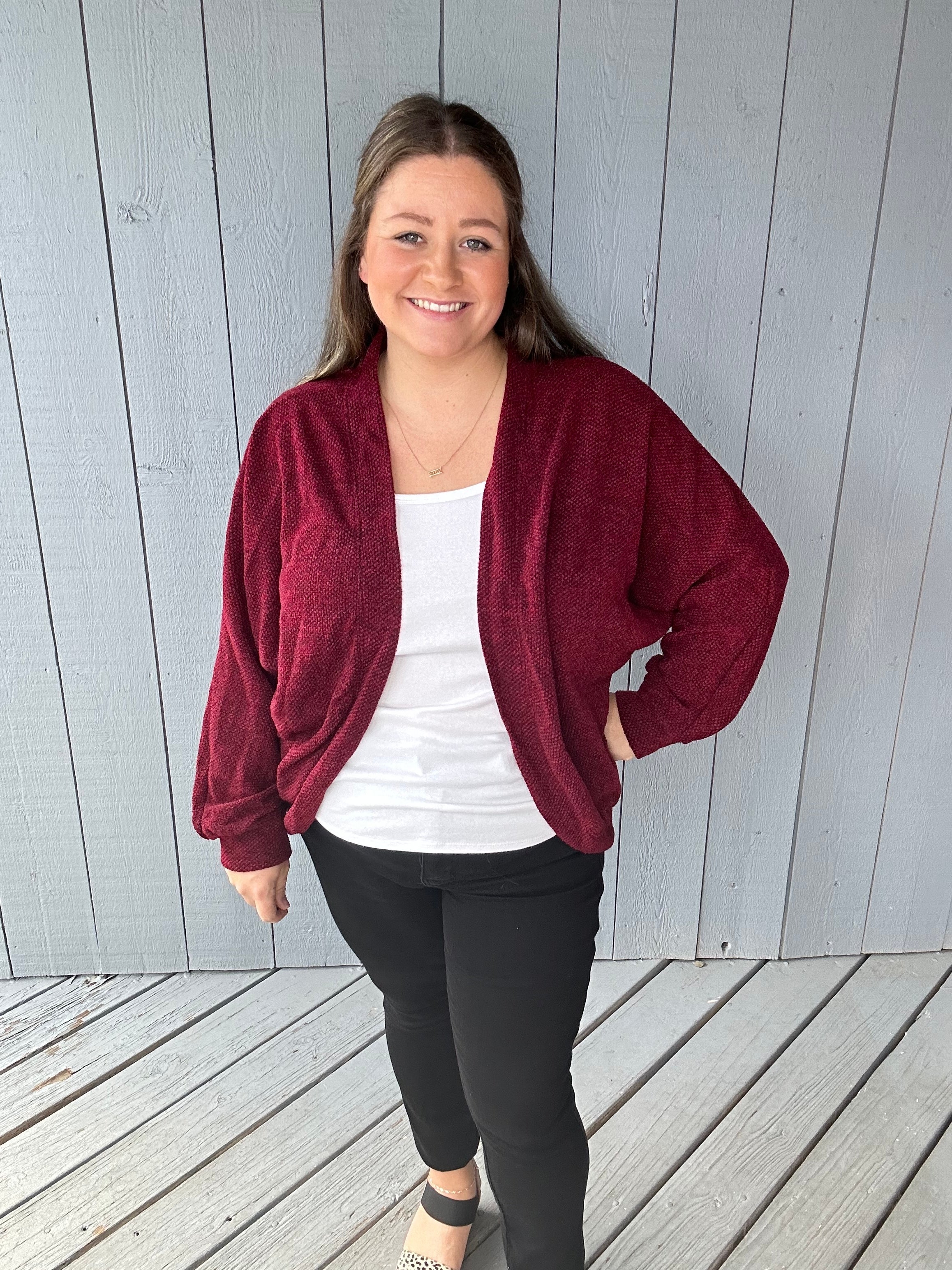 This beauty is a soft jacquard/waffle knit cardigan that you’ll reach for time and time again. Designed with a circle hem, open front, and bracelet-length cuffed sleeves, it’s the perfect lightweight layer for every season. Dress it up or down—this cardigan makes styling effortless and chic.