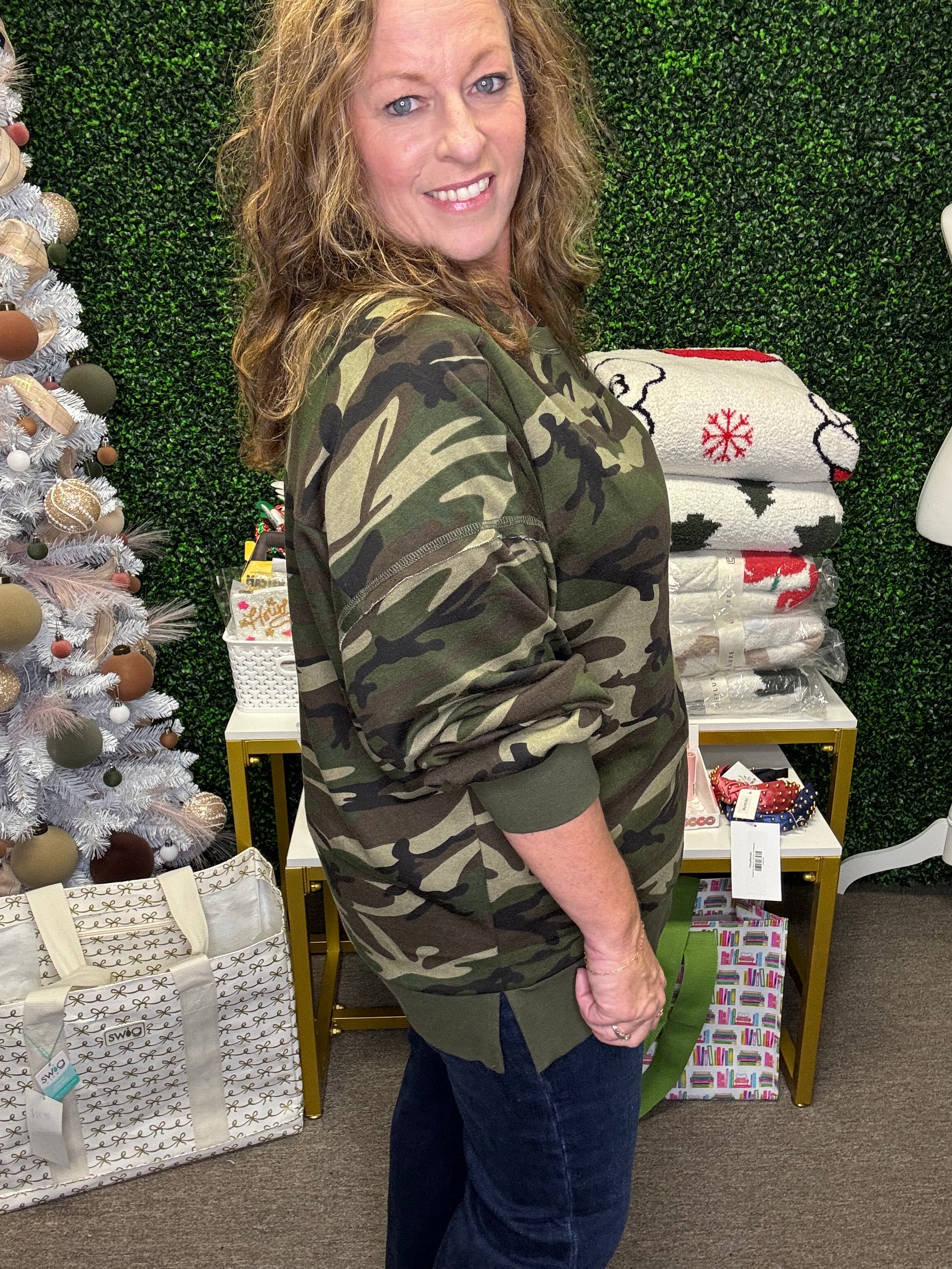 Pair this cozy camo top with your favorite jeans and sneakers for a relaxed weekend outfit, or style it with leggings and boots for an easy, casual-chic fall look.