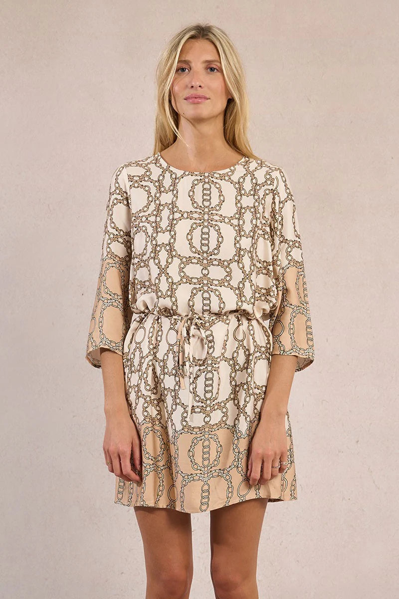 This printed short dress features a soft off-white base with the Diane print for a fresh, feminine look. Designed with mid-length sleeves and a classic round neckline, it offers effortless style and comfort. The elasticated waistband creates a flattering shape while keeping the fit easy and relaxed, making it perfect for everyday wear or casual outings.