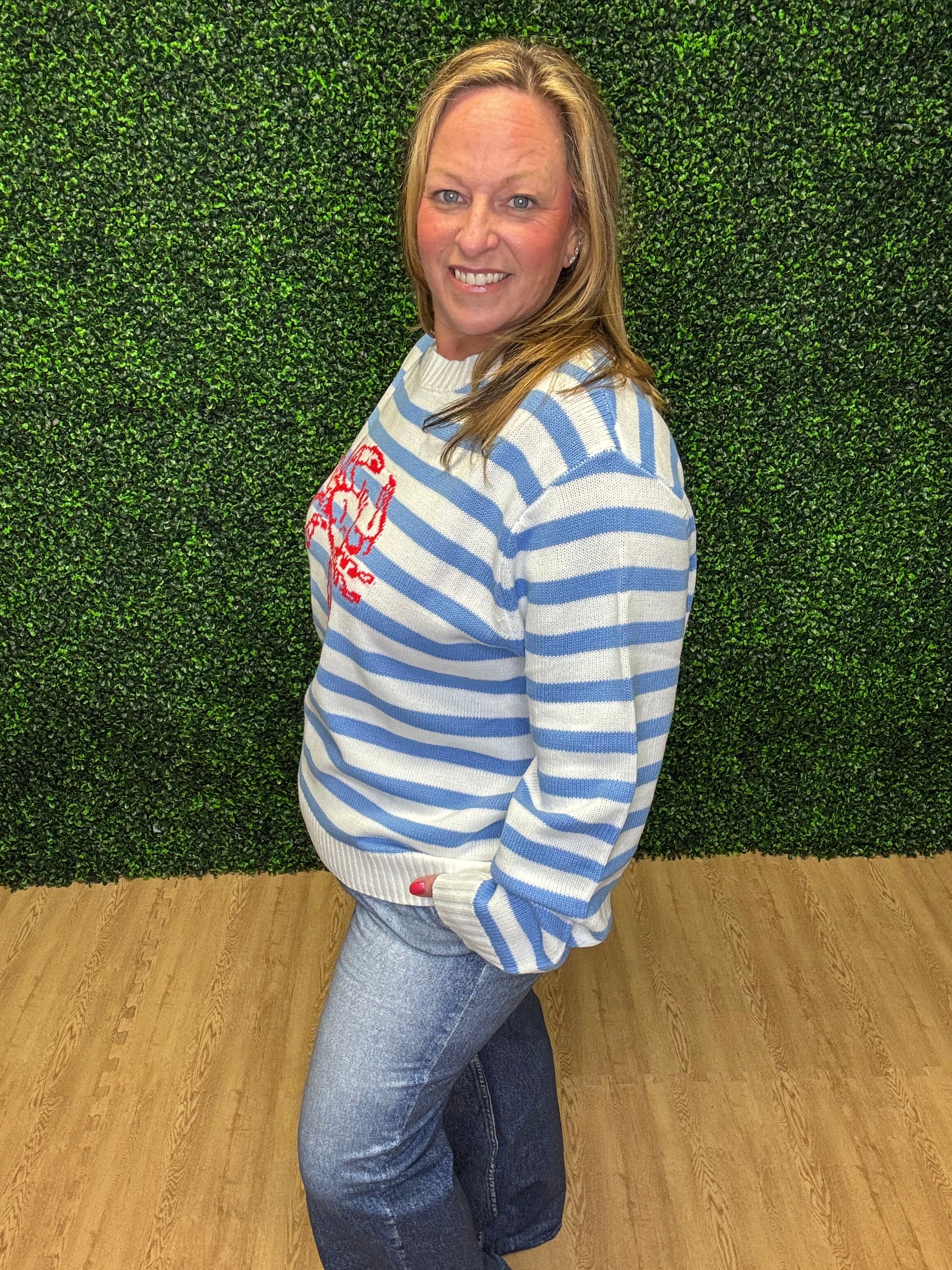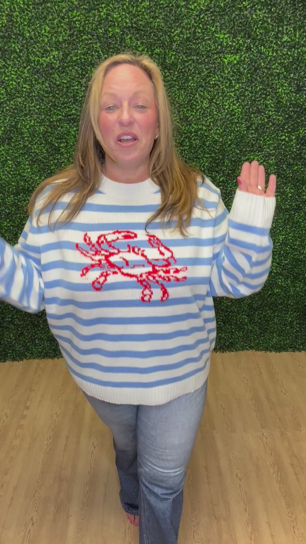 Bring a little coastal charm to your everyday style with our Polagram Crab Striped Sweater. The playful crab and stripe design adds a fun seaside vibe, while the soft knit fabric keeps you cozy and comfortable all day long. It’s one of those pieces you’ll find yourself reaching for again and again.