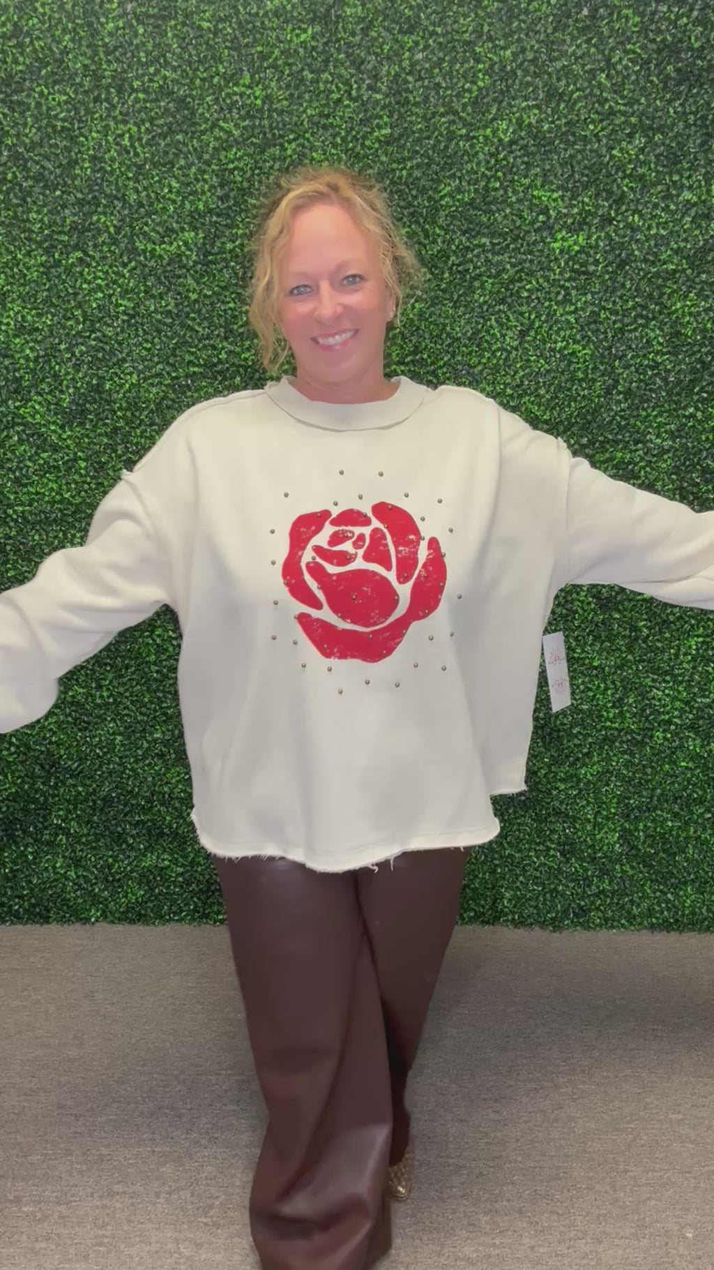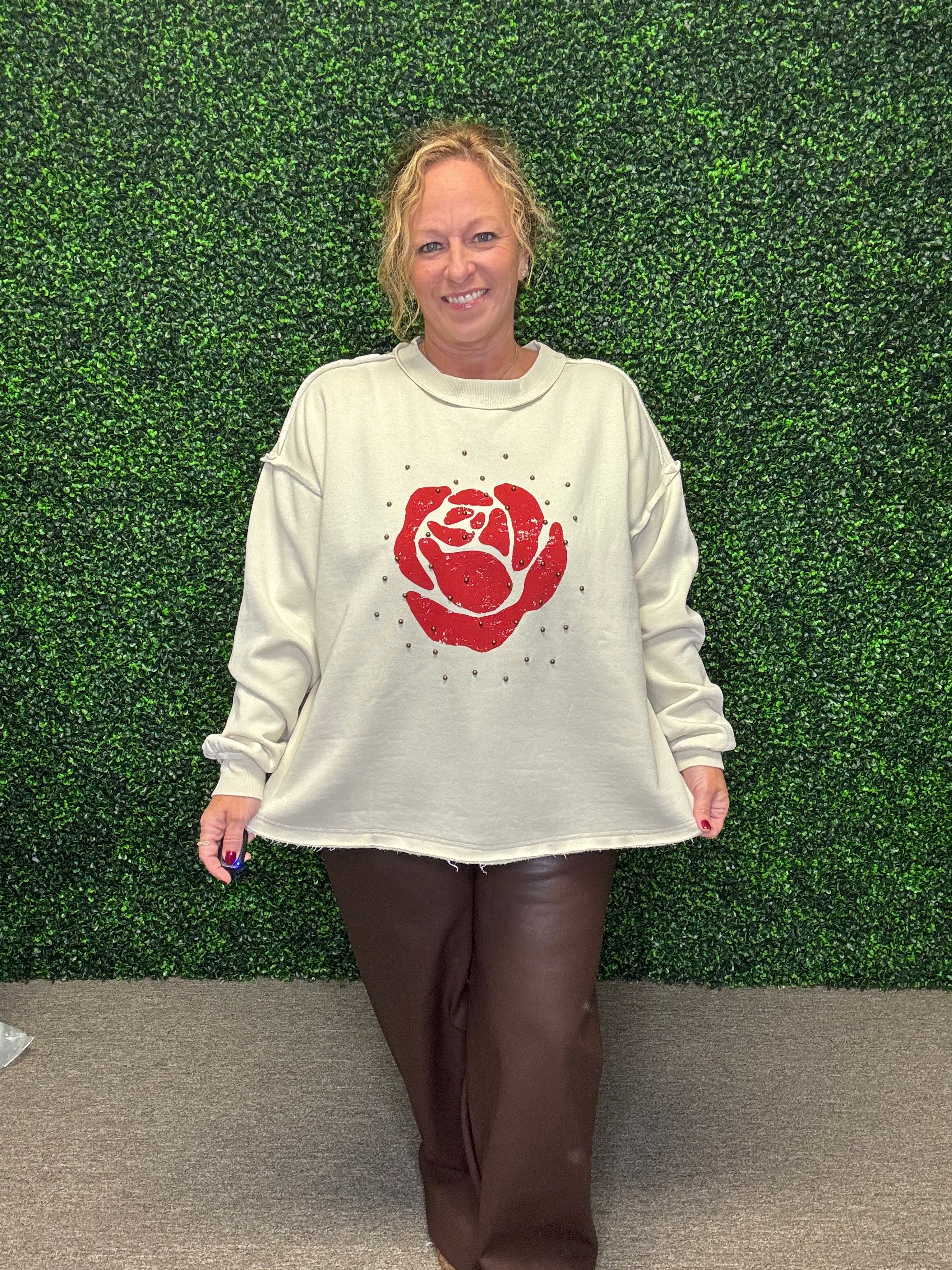 Pair the Rose Studded Sweatshirt with black denim and ankle boots for a chic casual look, or layer it over a collared shirt with faux leather leggings for an elevated, fashion-forward edge.