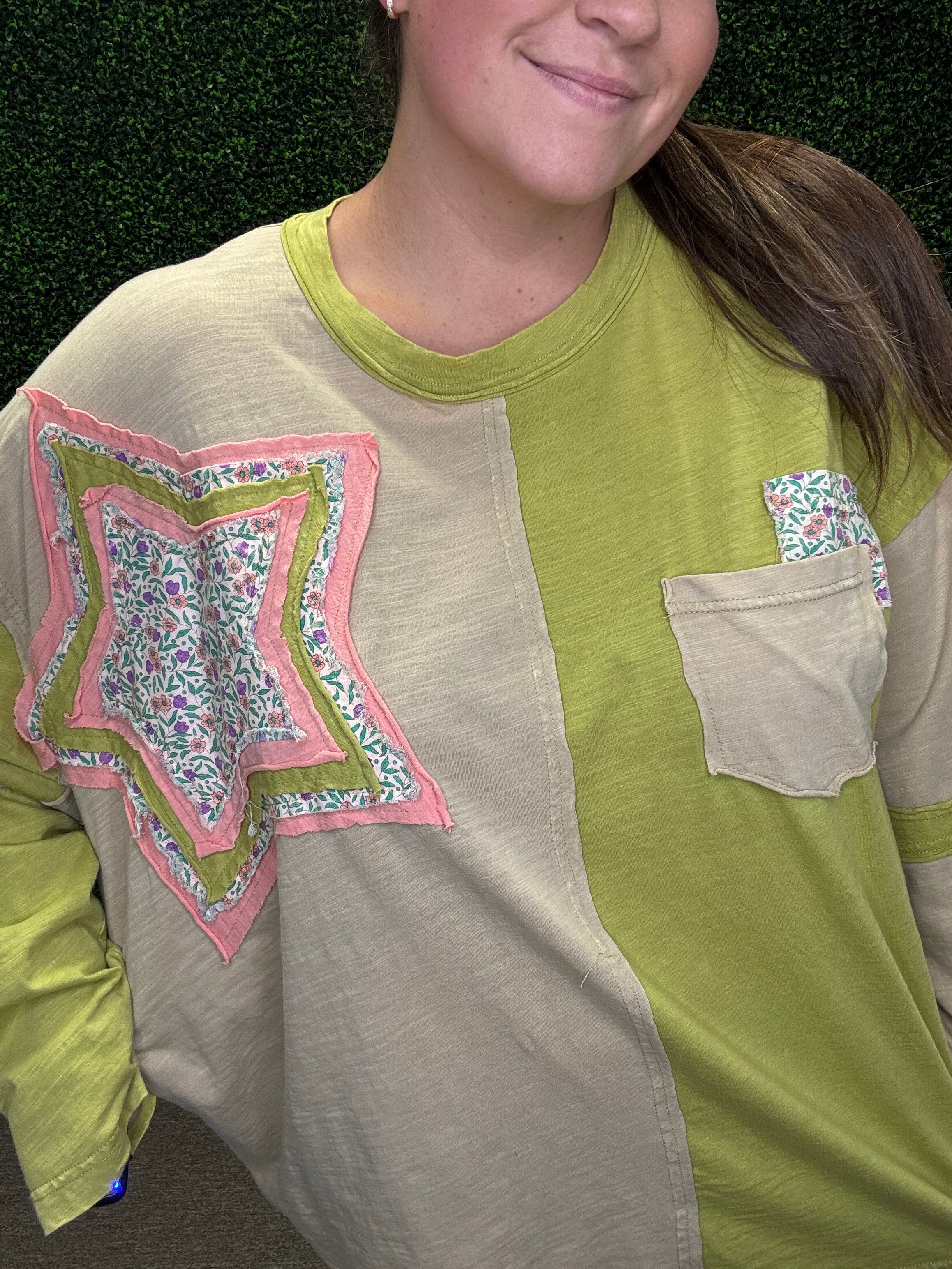A casual favorite with a playful twist! This new Easel top brings together soft, lightweight cotton with an eye-catching colorblock design and a large floral star appliqué for added charm. With its mineral-washed finish and relaxed, boxy fit, it’s the kind of tee you’ll reach for again and again. Perfect with denim, joggers, or layered under jackets, it’s an easy grab-and-go piece that doesn’t sacrifice style.