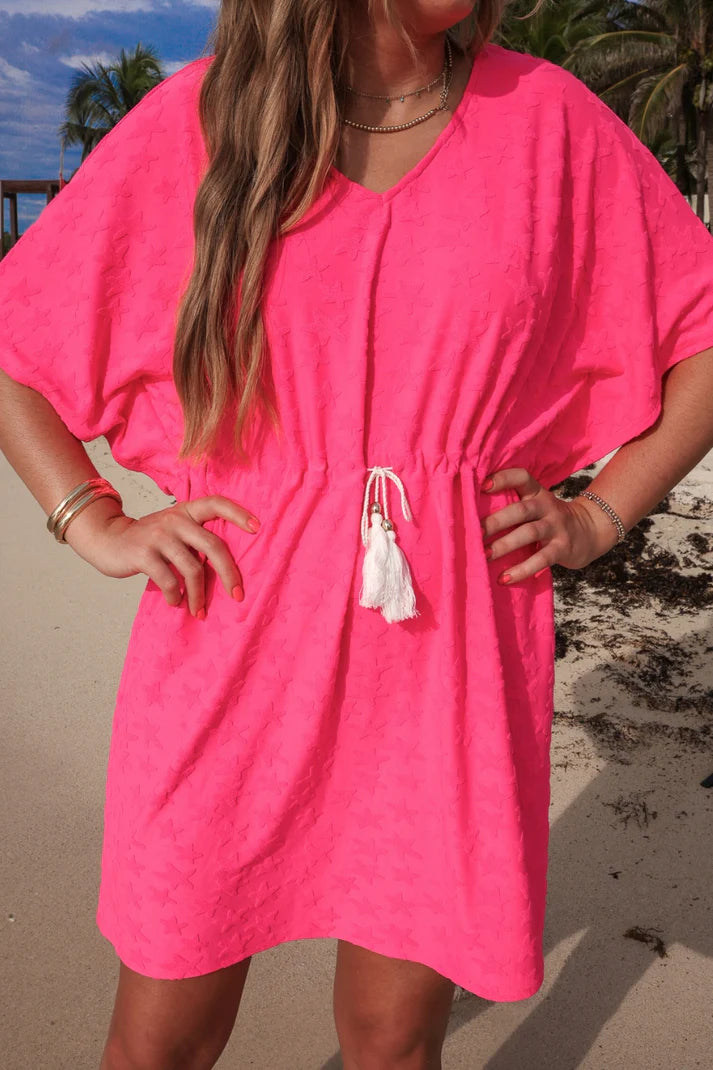 Dive into style with our Underwater Wonders Starfish Coverup. This fun, beach-ready piece features a unique starfish-textured design that instantly brings coastal vibes. An adjustable tassel tie finished with gold bead accents allows you to customize the fit while adding a touch of glam. Lightweight, stretchy, and easy to throw on, this coverup is a must-have addition to your summer wardrobe.