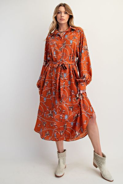 This western print dress is so darn stunning! A top-quality piece by Easel, this silky-feeling dress features a rust background with stars, saddles, boots, hats, and rope prints all over. It buttons down the front, includes a satin tie belt, and feels amazing on. Wear it as a dress or style it open as a kimono — either way, it’s the perfect fall statement piece.