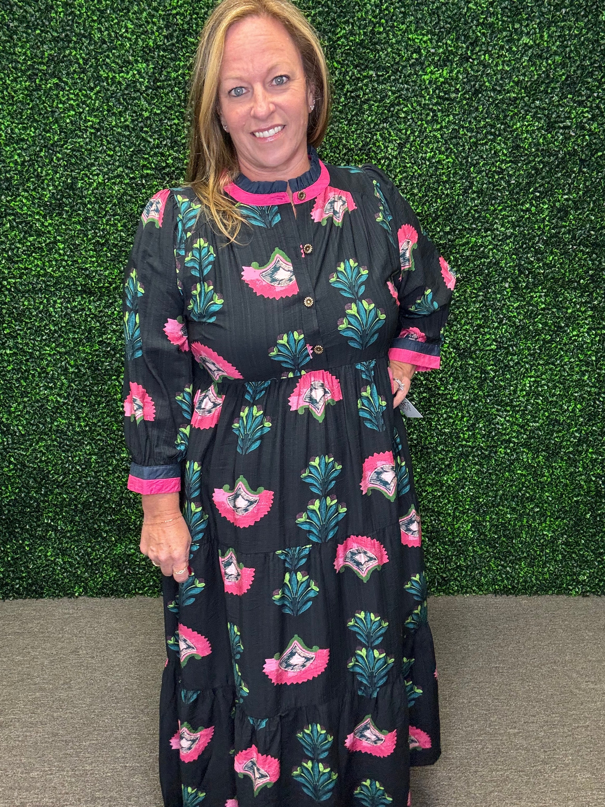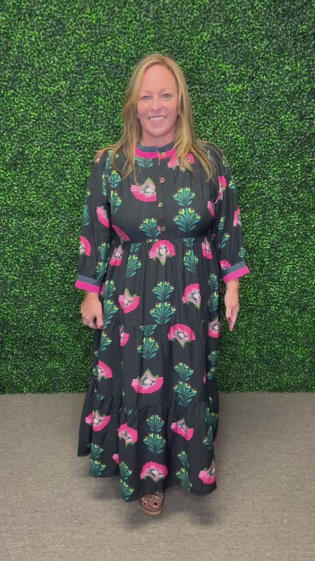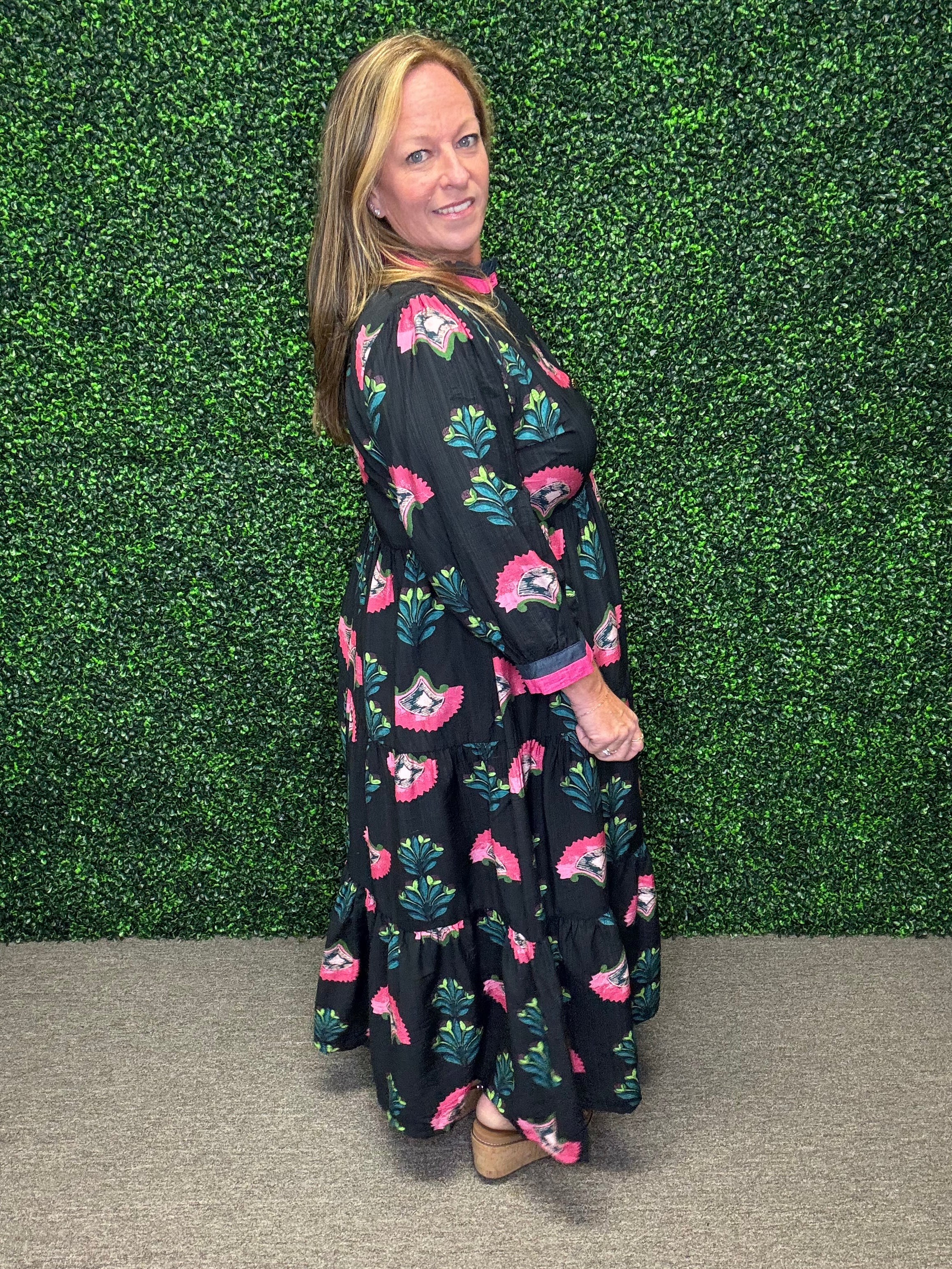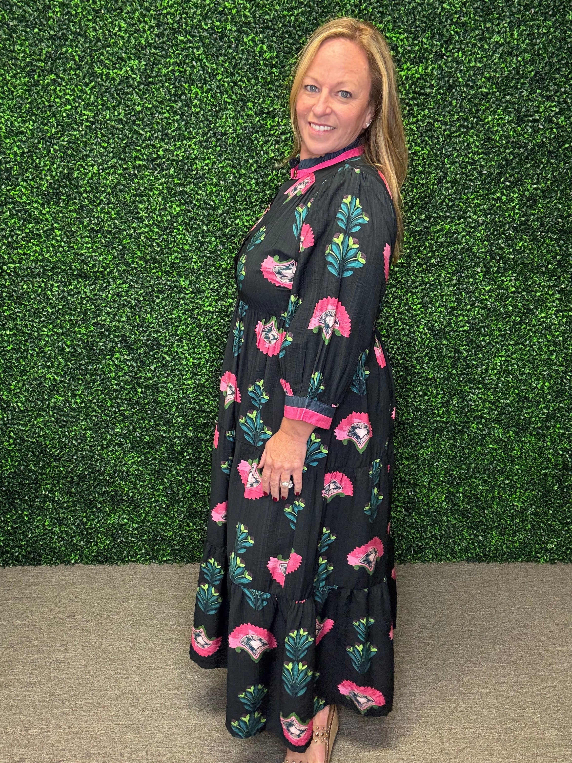 Pair the Garden Grace Midi Dress with ankle boots and a light cardigan for a cozy fall look, or dress it up with gold jewelry and heels for a special occasion. Its flowy silhouette and soft texture make it a year-round favorite for effortless femininity.