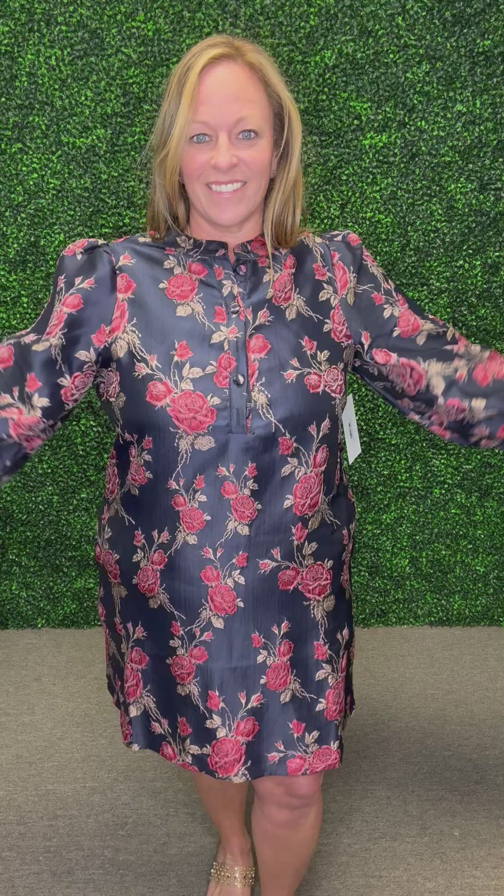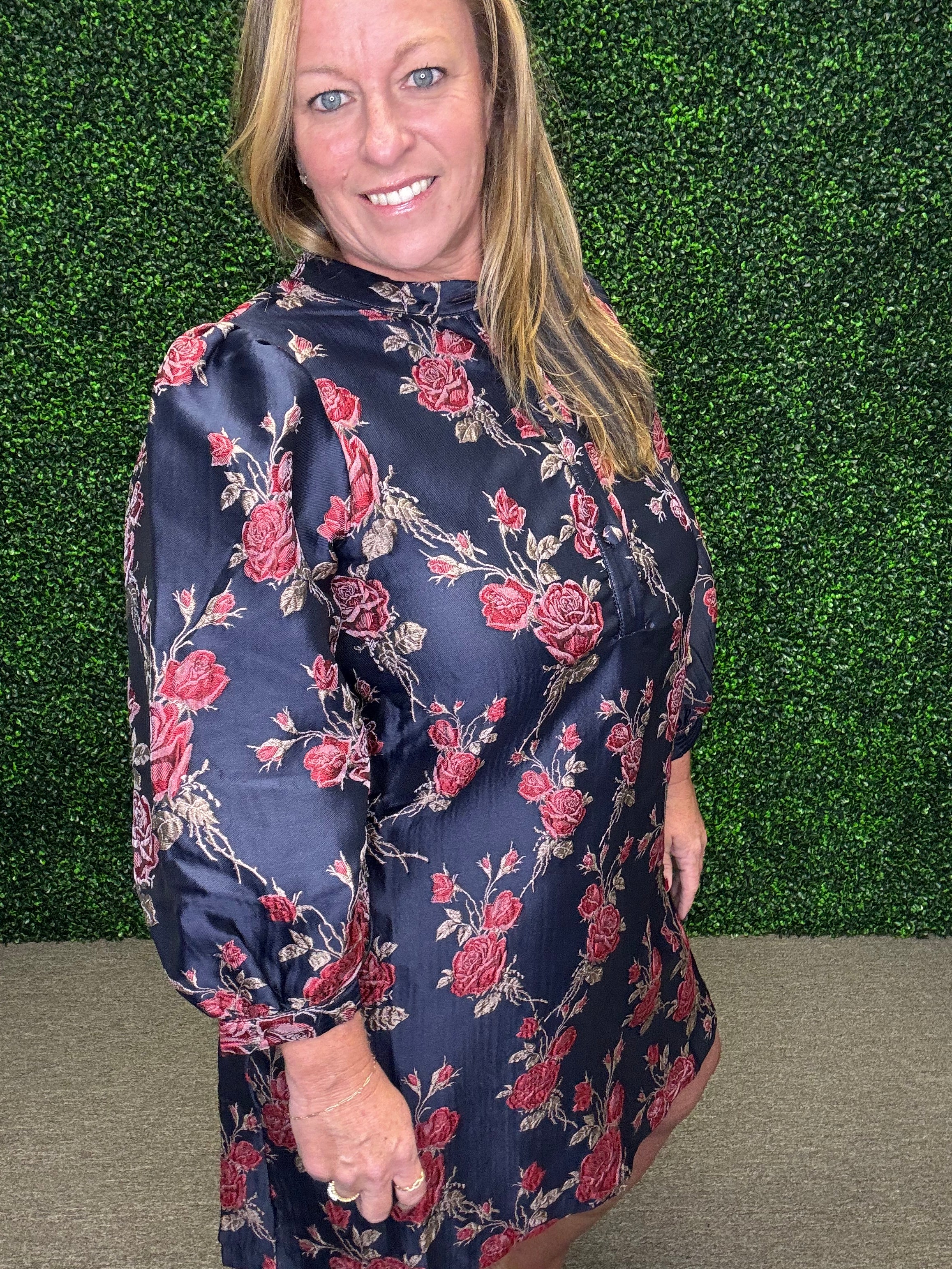 The Meadow Charm Mini Dress brings effortless beauty to your everyday style with its soft floral print and breezy silhouette. Designed with 3/4 sleeves and a covered partial button placket, this woven mini dress combines comfort and charm in one flattering piece. The side pockets add a practical touch, while the lightweight, non-sheer fabric drapes beautifully for a relaxed yet polished look.