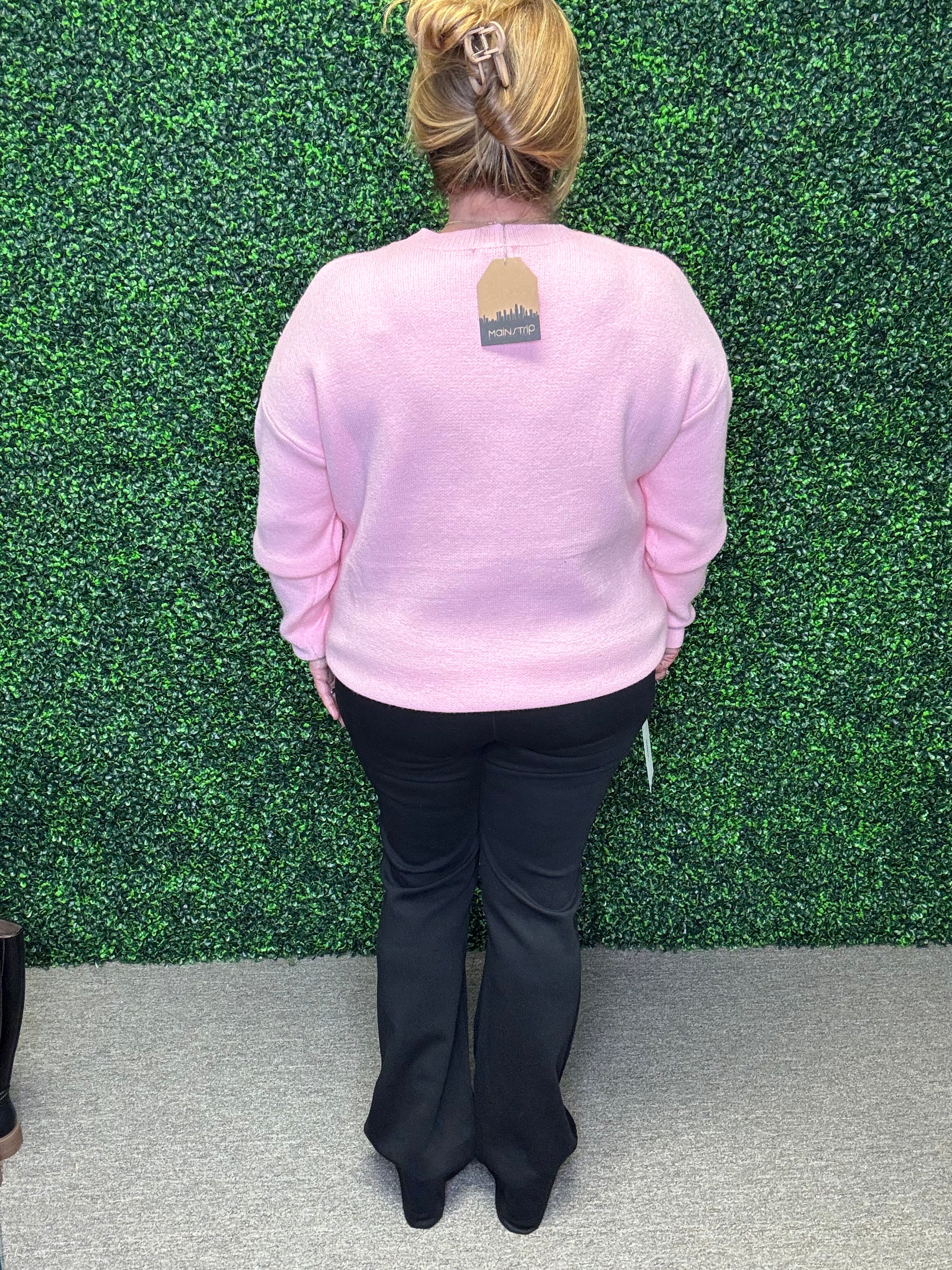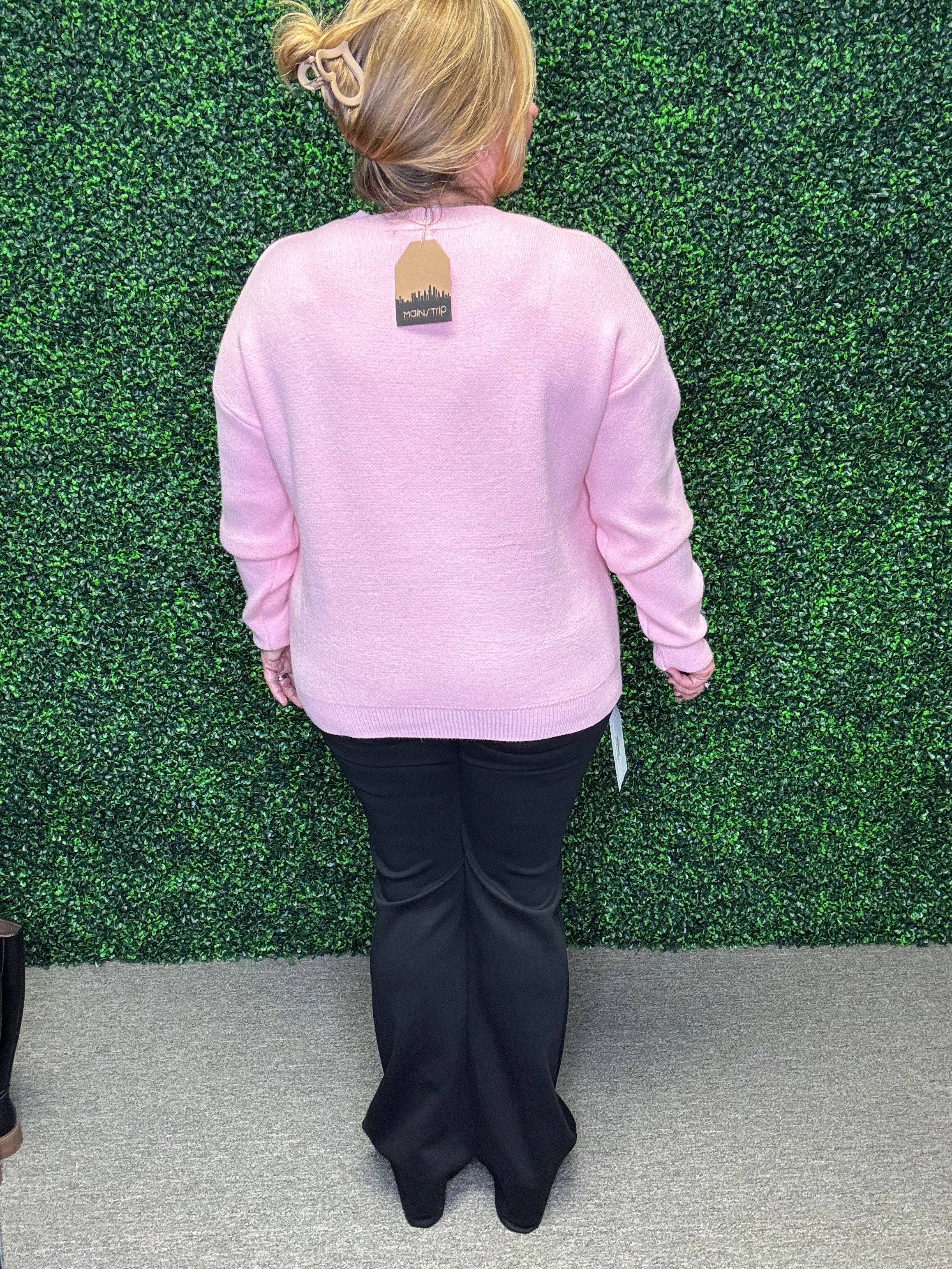 Heavy knit pink sweater with festive flair