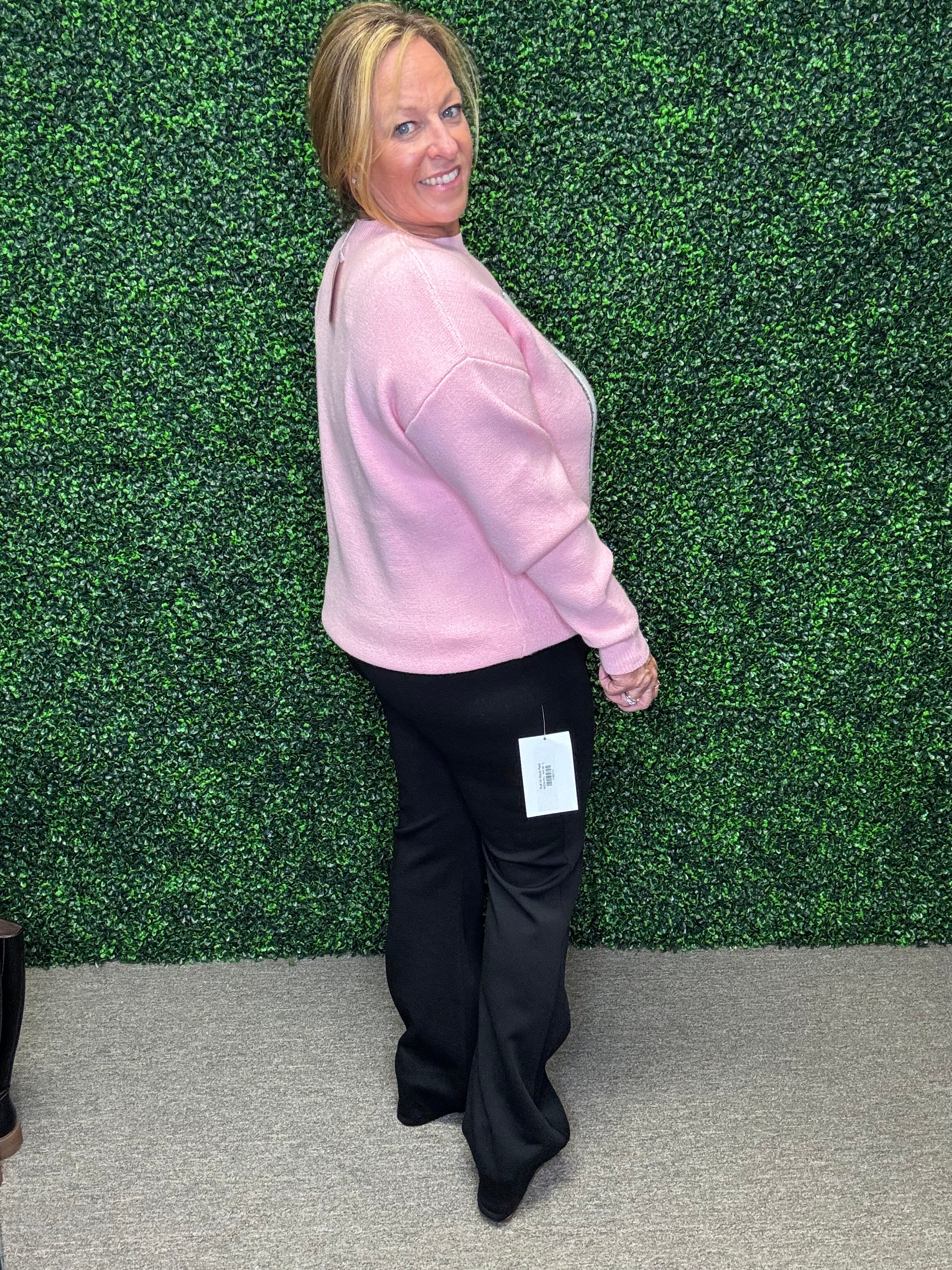 Make a statement this season with our heavy knit pink sweater adorned with dazzling champagne bottle sequined embroidery. Equal parts festive and chic, this playful yet elegant piece is designed to bring joy and a touch of luxury to your wardrobe. Its cozy knit and eye-catching embellishments make it a must-have for holiday gatherings, parties, or anytime you want to shine.