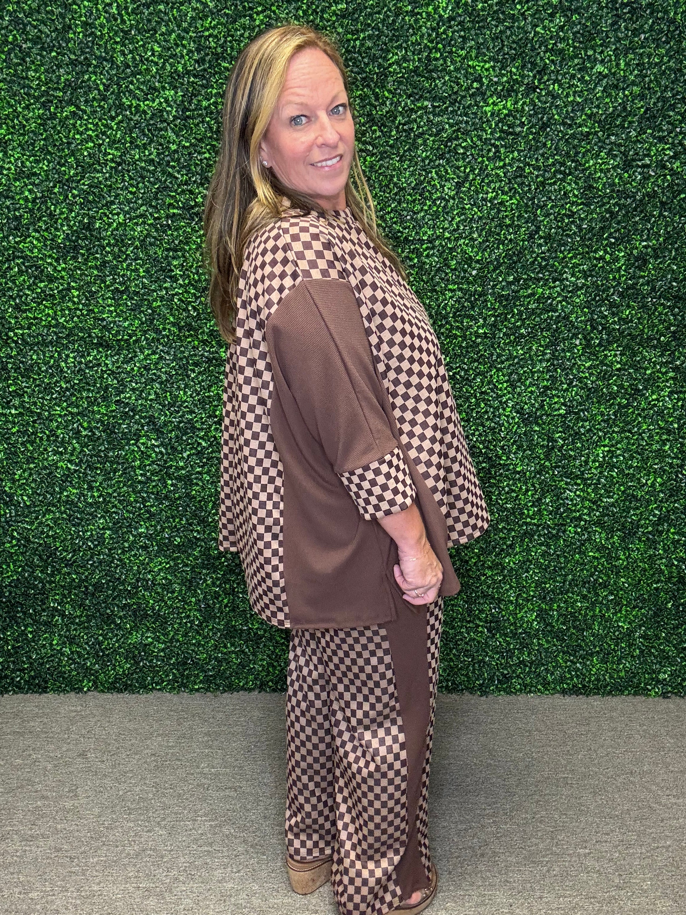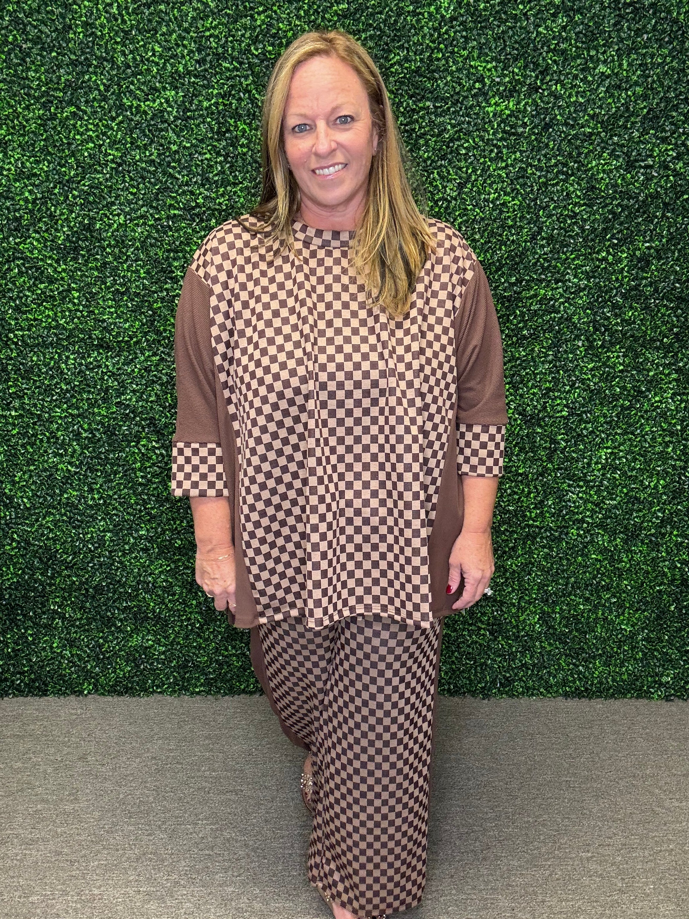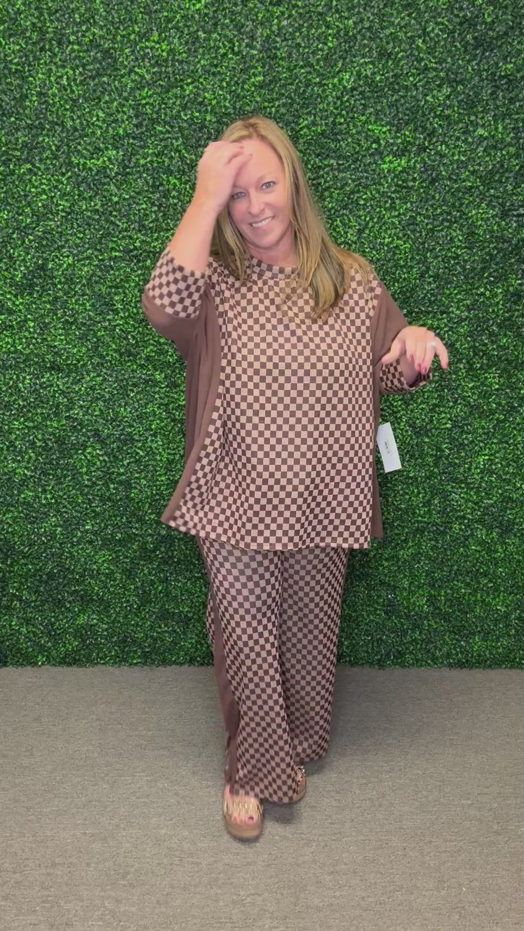 The Checkmate Charm Top brings a modern twist to timeless style with its bold brown checkerboard print and flattering, easy fit. Designed for both comfort and polish, this short-sleeve top features solid contrast banding down the sides that elongates the silhouette and adds a sporty-chic edge. The soft, lightweight fabric offers the perfect amount of stretch, making it ideal for all-day wear. Pair it with the Checkmate Charm Pants (sold separately) for a sleek matching set that transitions effortlessly from casual to elevated.