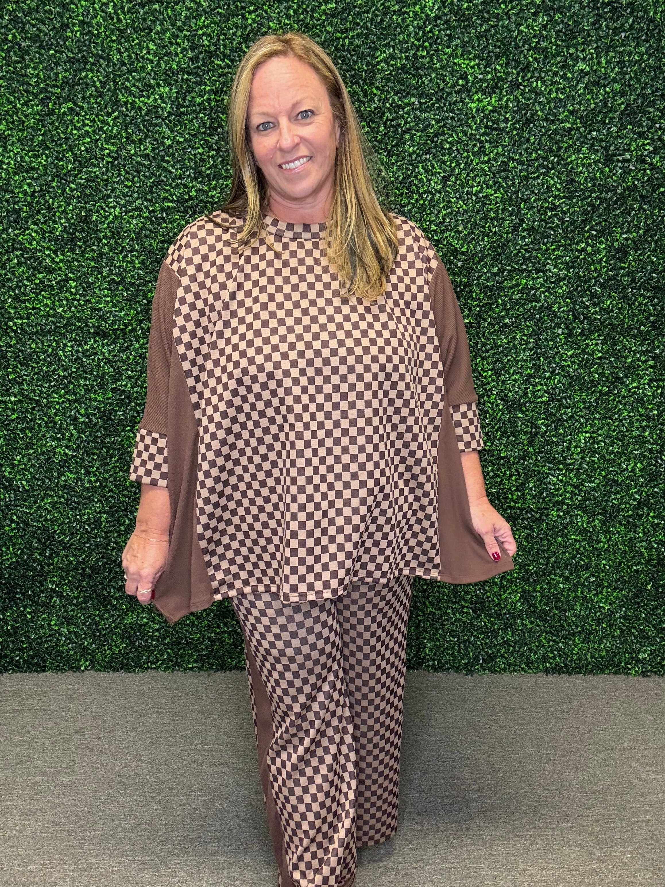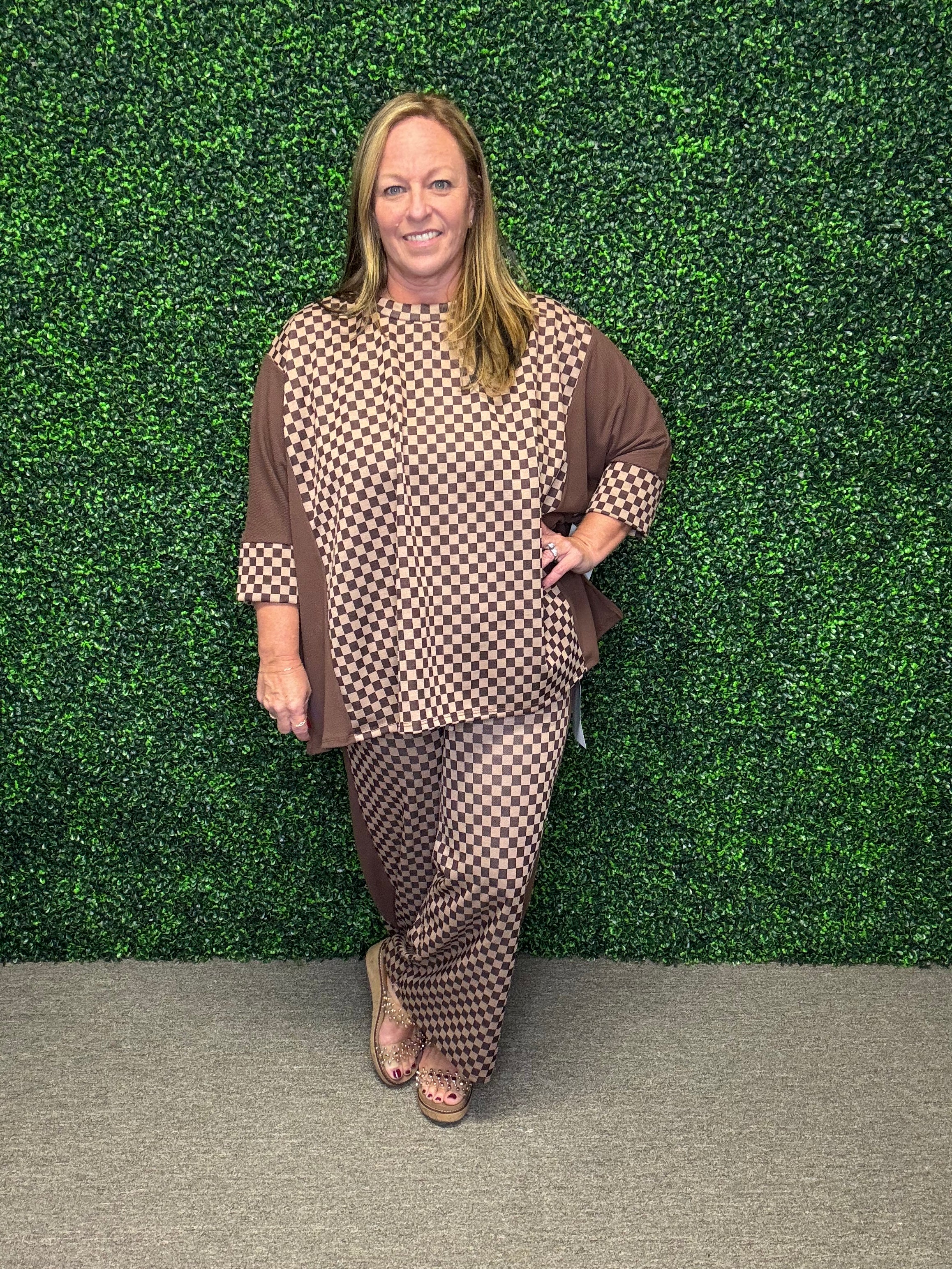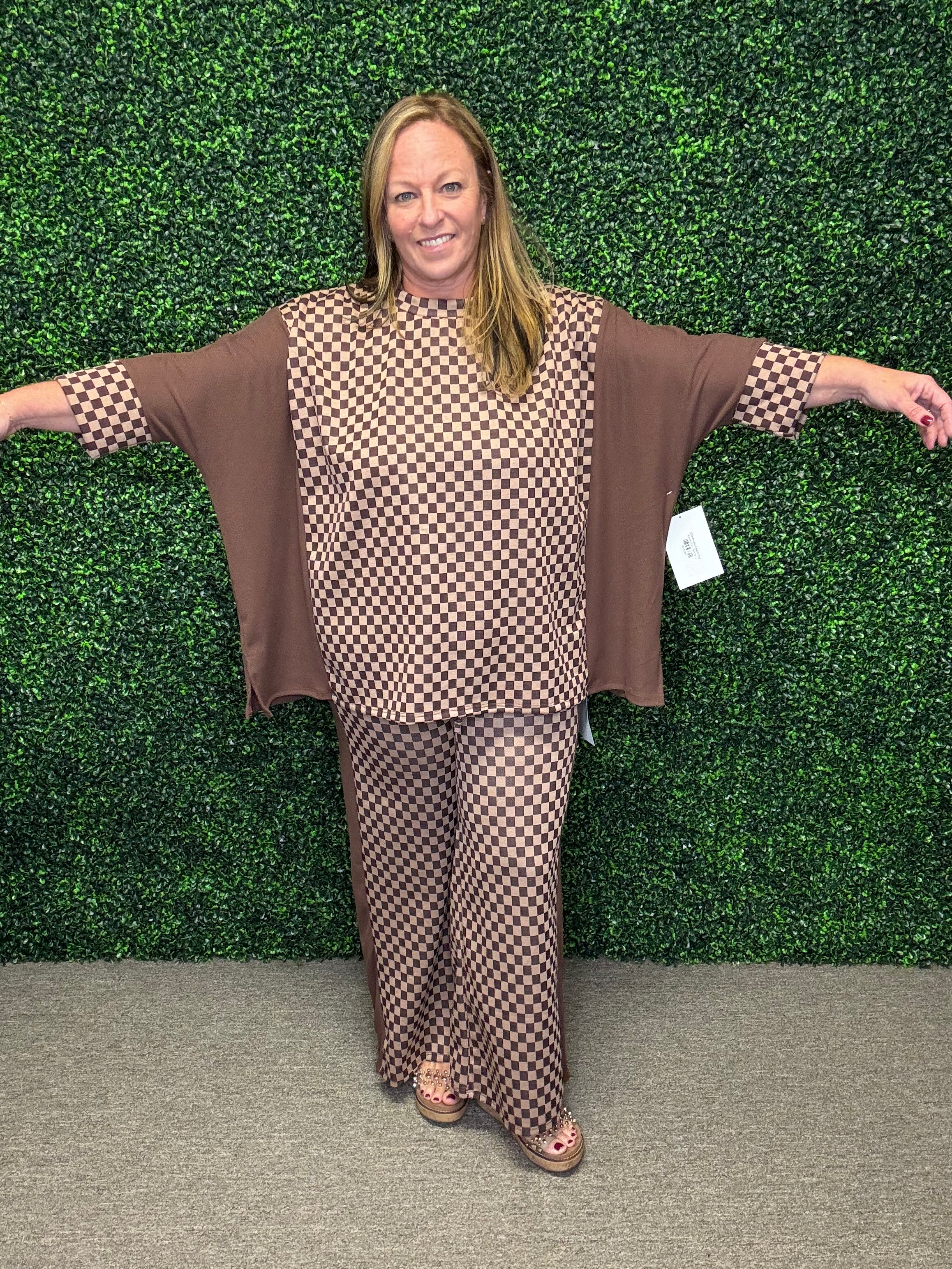 The Checkmate Charm Top brings a modern twist to timeless style with its bold brown checkerboard print and flattering, easy fit. Designed for both comfort and polish, this short-sleeve top features solid contrast banding down the sides that elongates the silhouette and adds a sporty-chic edge. The soft, lightweight fabric offers the perfect amount of stretch, making it ideal for all-day wear. Pair it with the Checkmate Charm Pants (sold separately) for a sleek matching set that transitions effortlessly from casual to elevated.