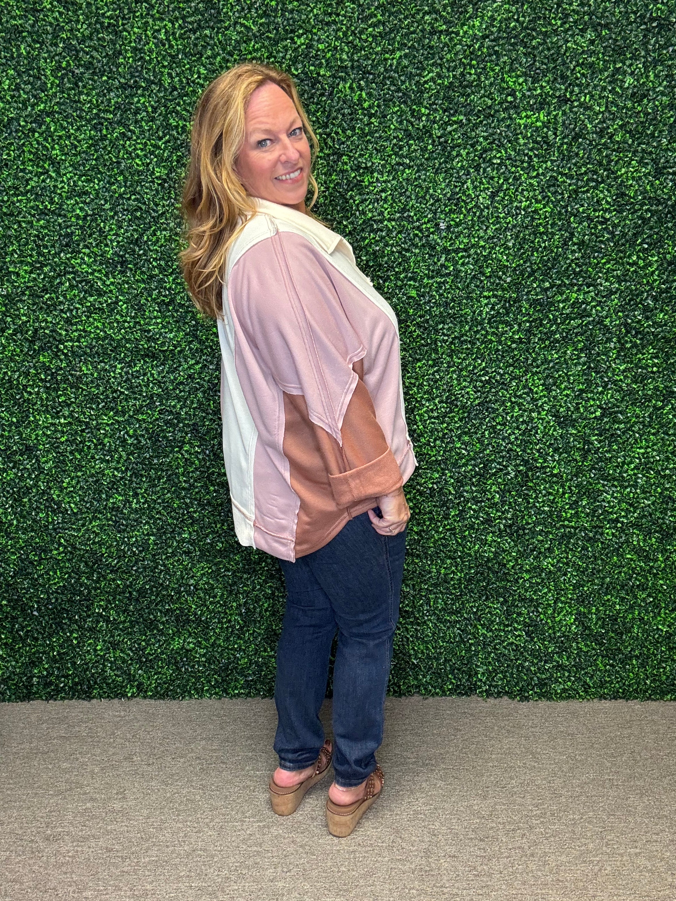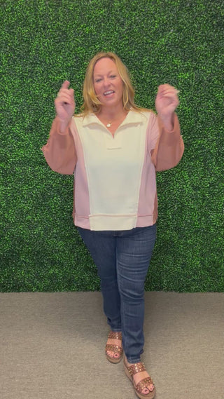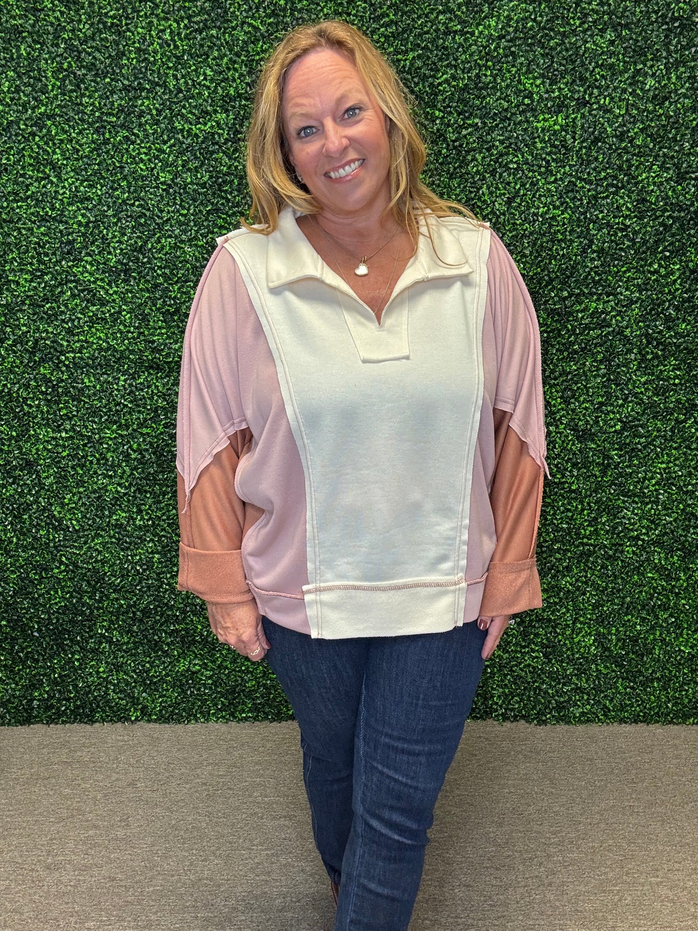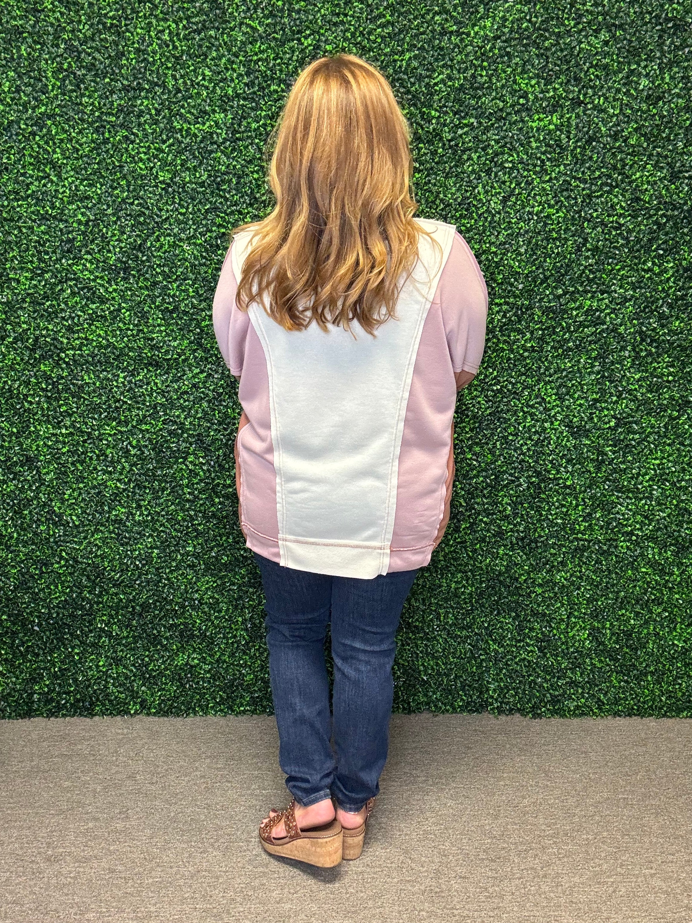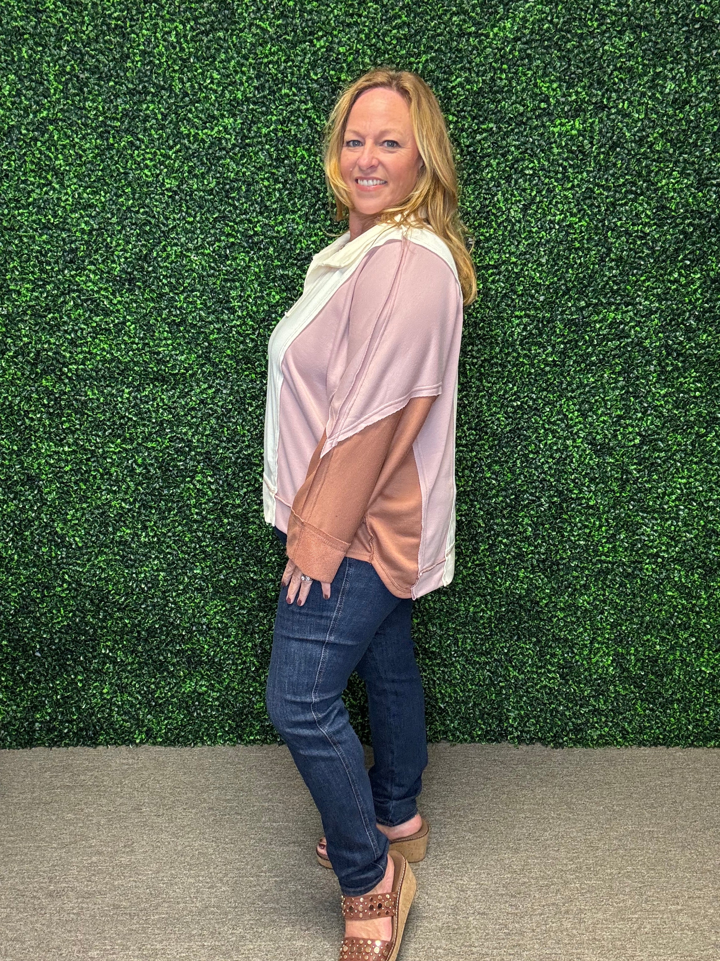 Step into effortless style with this lightweight French terry top. Featuring a chic notched neckline and a modern colorblocked design, it’s a versatile piece that pairs beautifully with jeans, leggings, or casual skirts for laid-back yet polished looks.