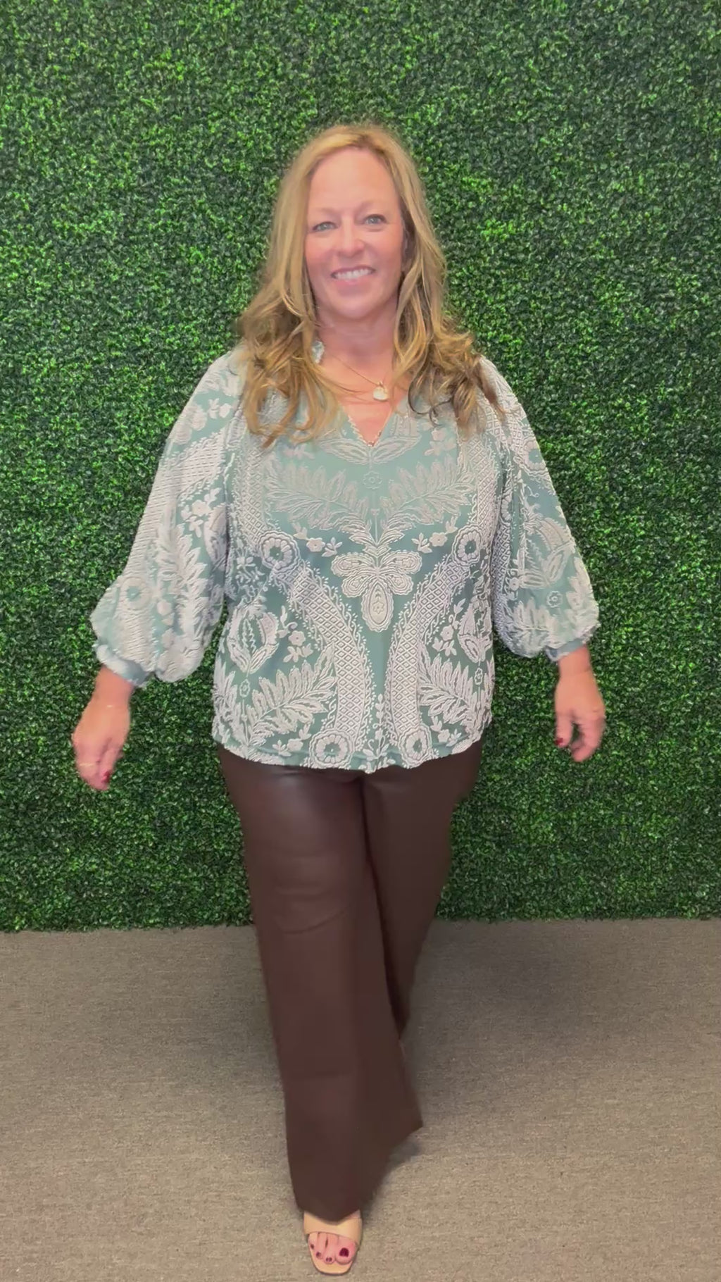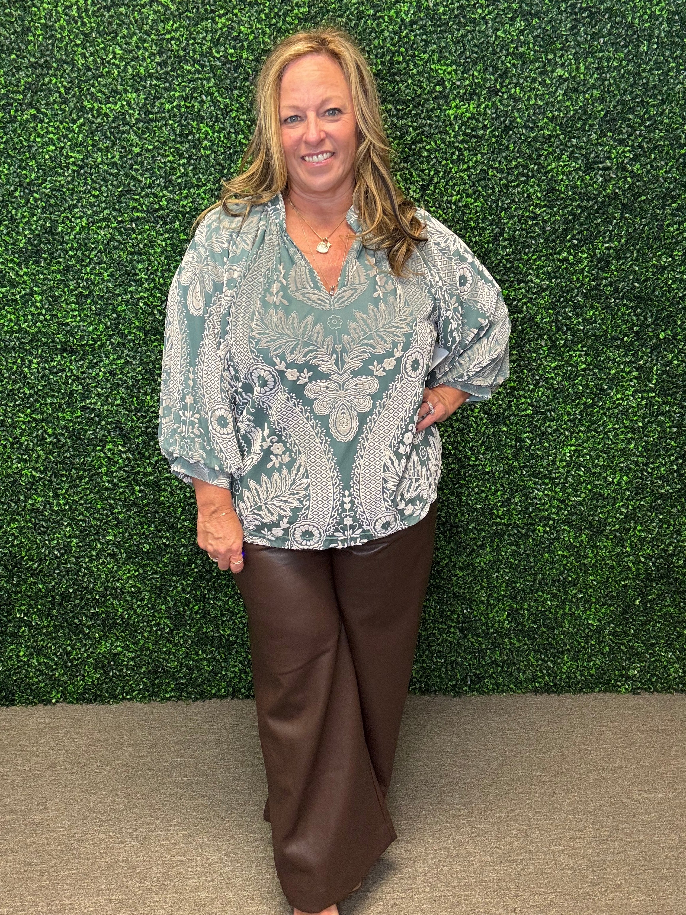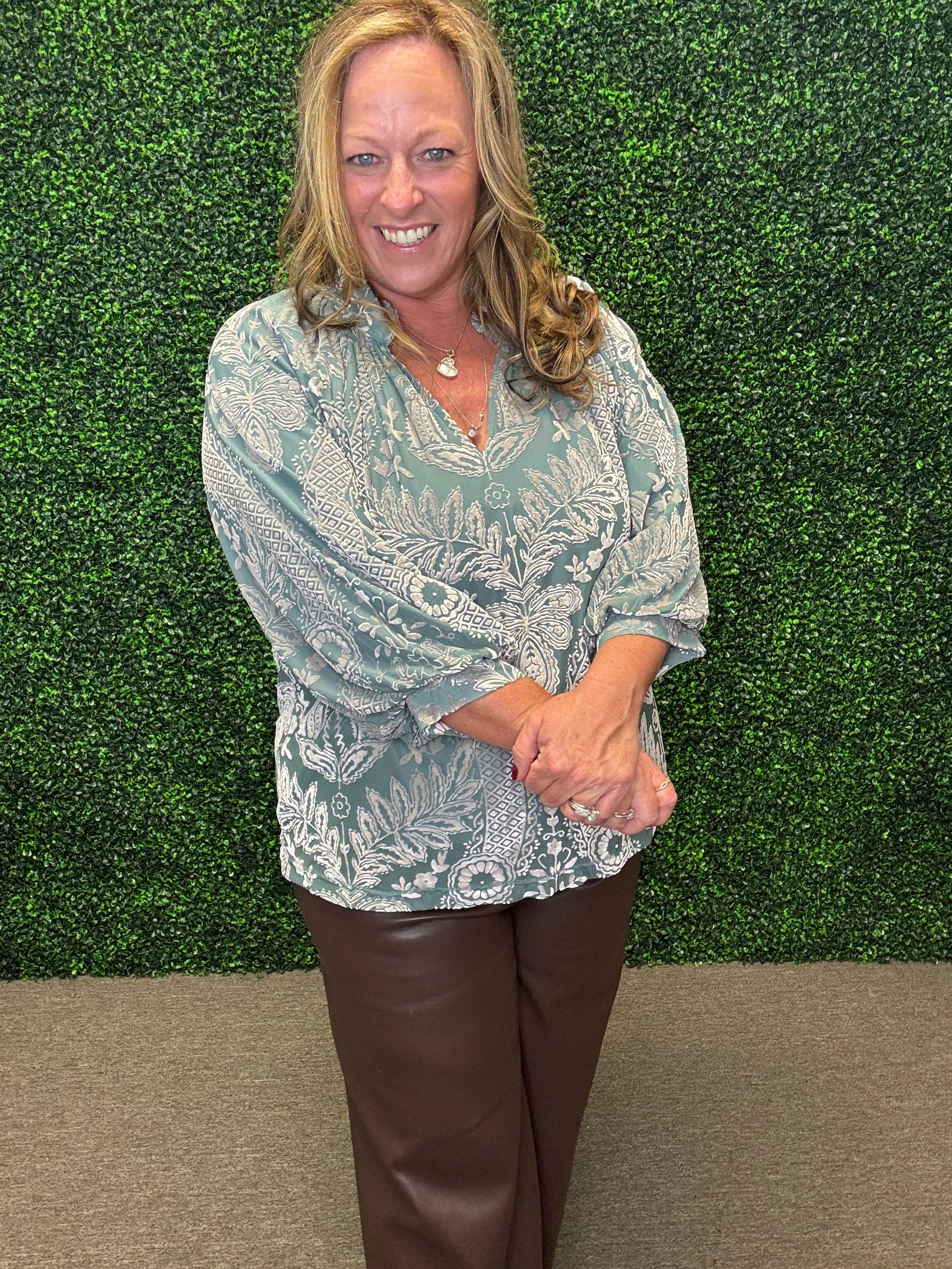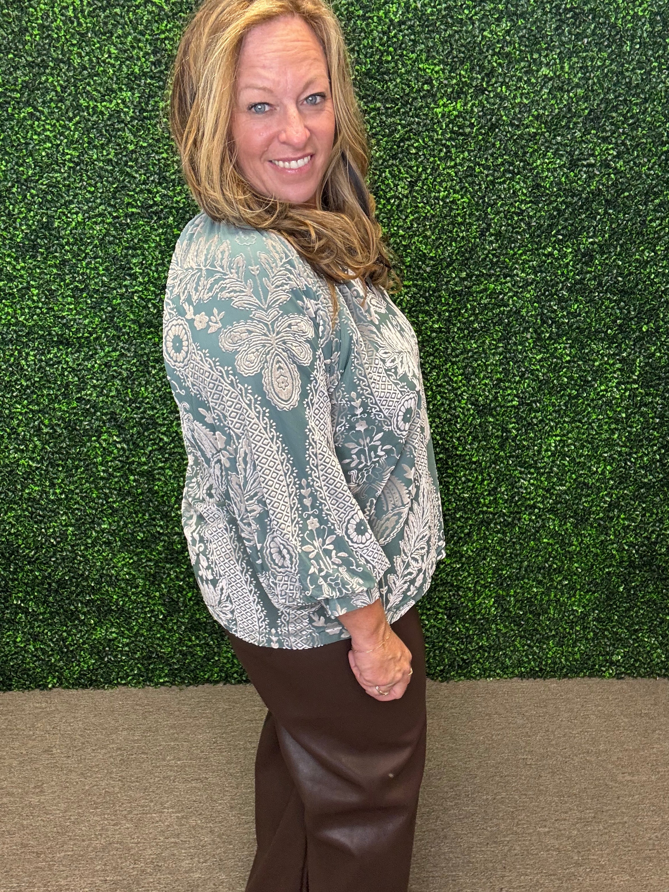 This new top by Umgee has the prefect sheen mixed with some soft velvet in a beautiful print. It will bring a touch of sophistication and texture to your wardrobe and is a damask type velvet print. Its rich fabric and subtle shine make it the perfect piece for elevating both casual and dressy looks.