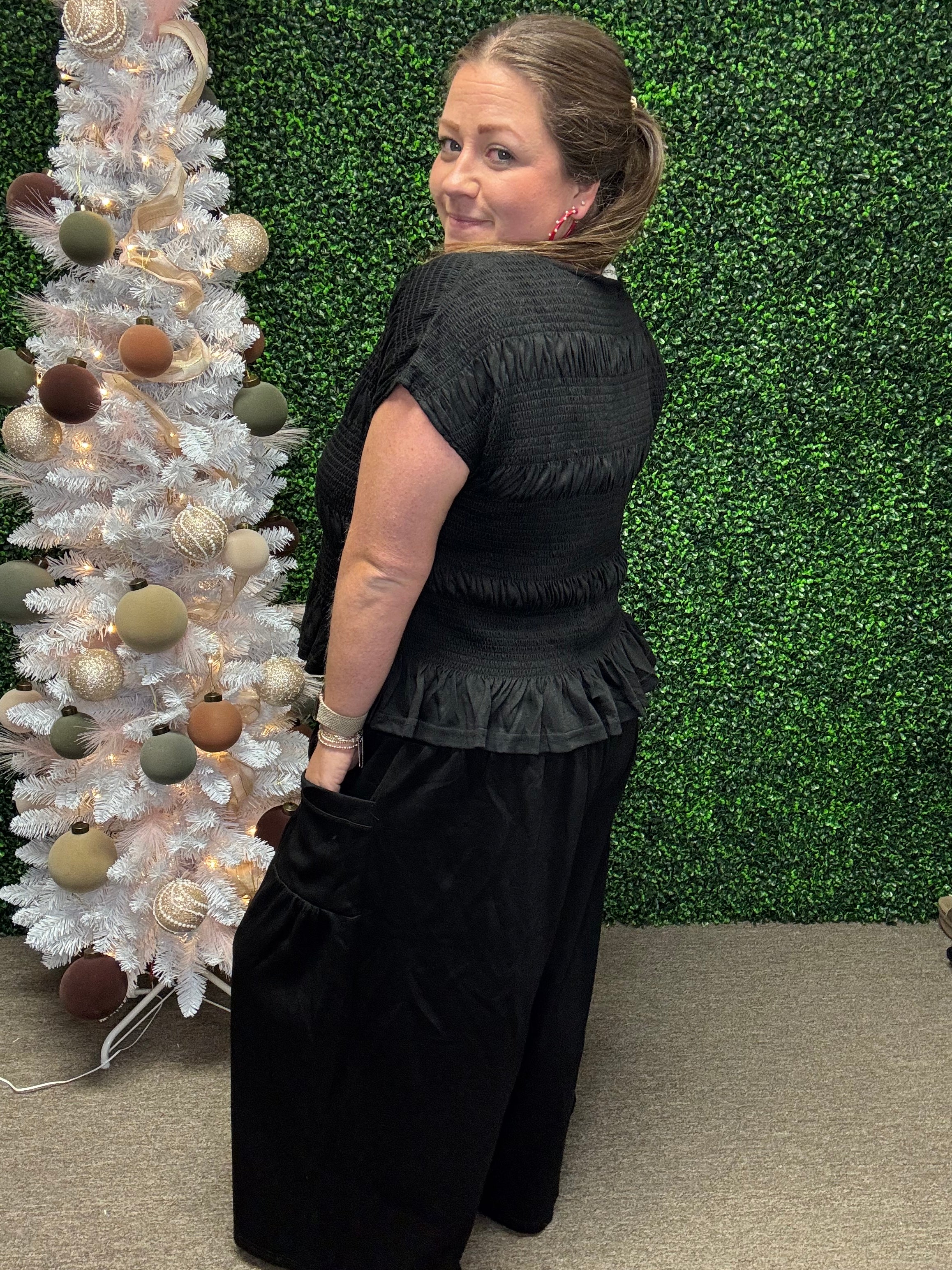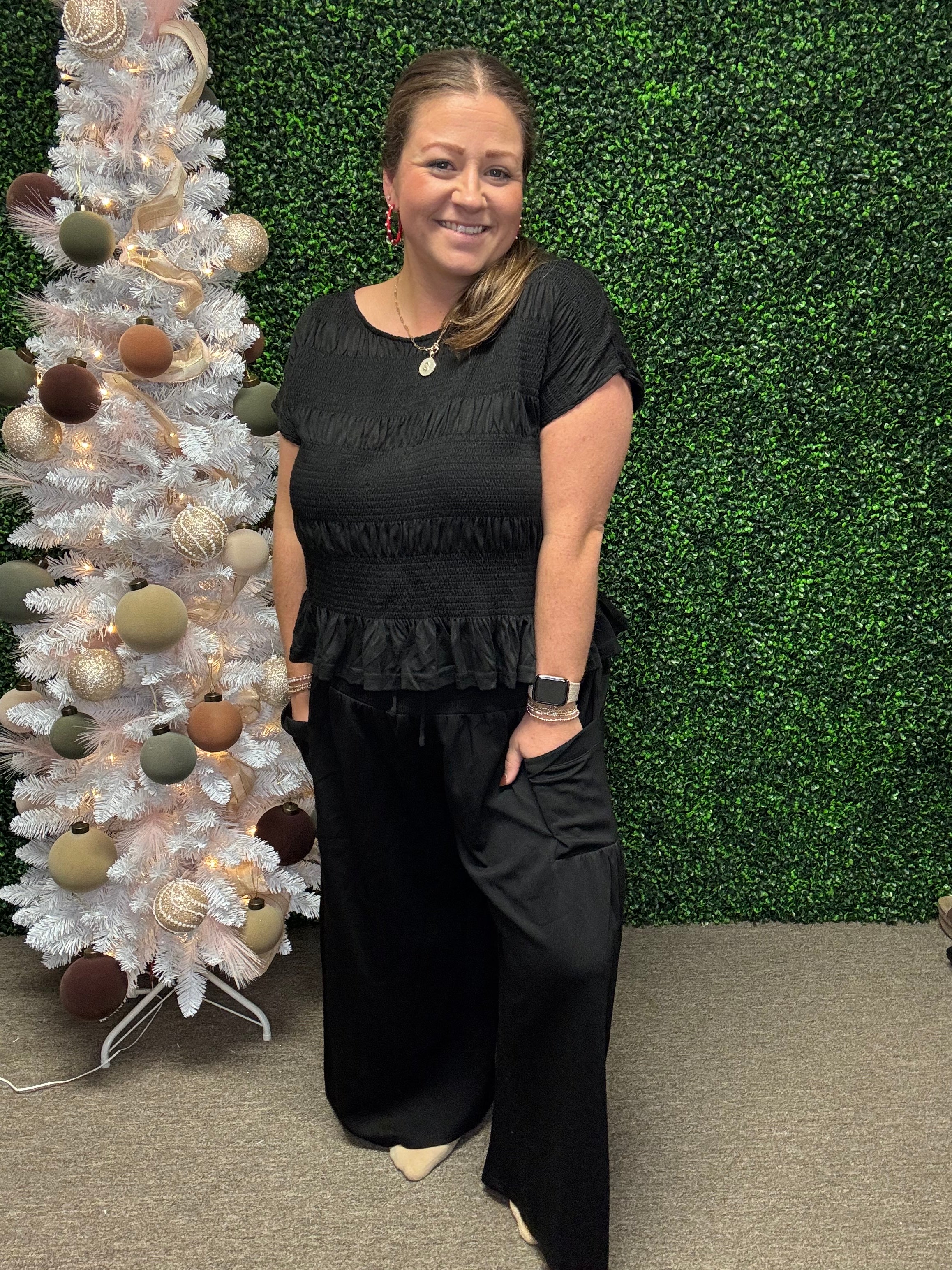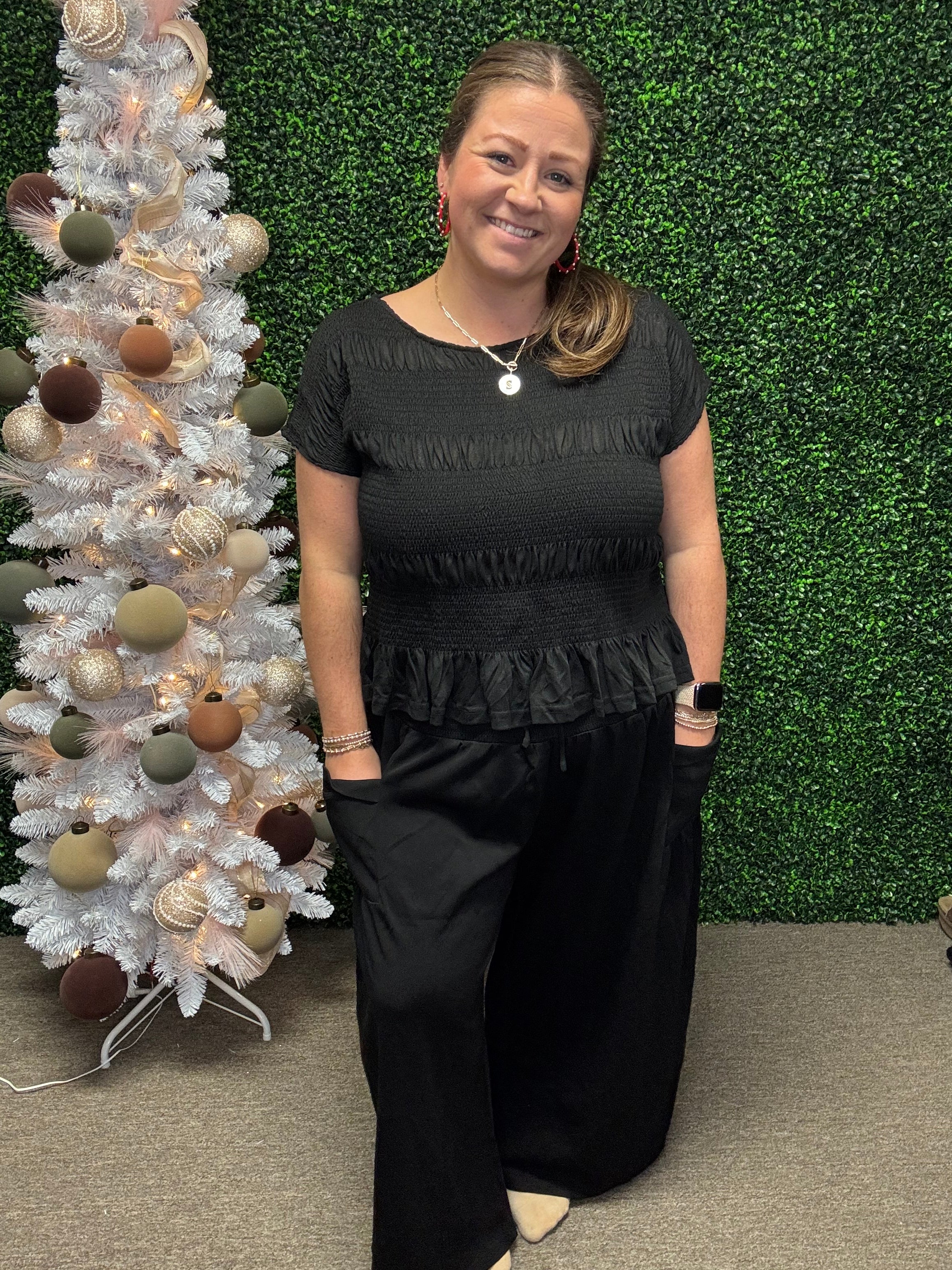 Effortlessly chic and endlessly comfortable, the Davi & Dani Set combines a tiered smocked top with matching wide-leg pants for a look that feels pulled together yet relaxed. The lightweight fabric drapes beautifully, while the smocked details and ruffled accents give it that touch of feminine charm you’ll reach for again and again.