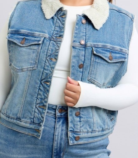 New from Judy Blue! Stay warm and stylish with this cozy shearling-lined denim vest — the perfect mix of classic cool and comfort. Designed with a timeless denim exterior and a soft, plush shearling interior, this vest is ideal for layering through the colder months. The structured silhouette, button-front closure, and functional side buttons give you the flexibility to adjust the fit for your comfort. Whether you're heading out for errands or styling it up for a casual weekend look, this vest delivers effortless charm and warmth.
