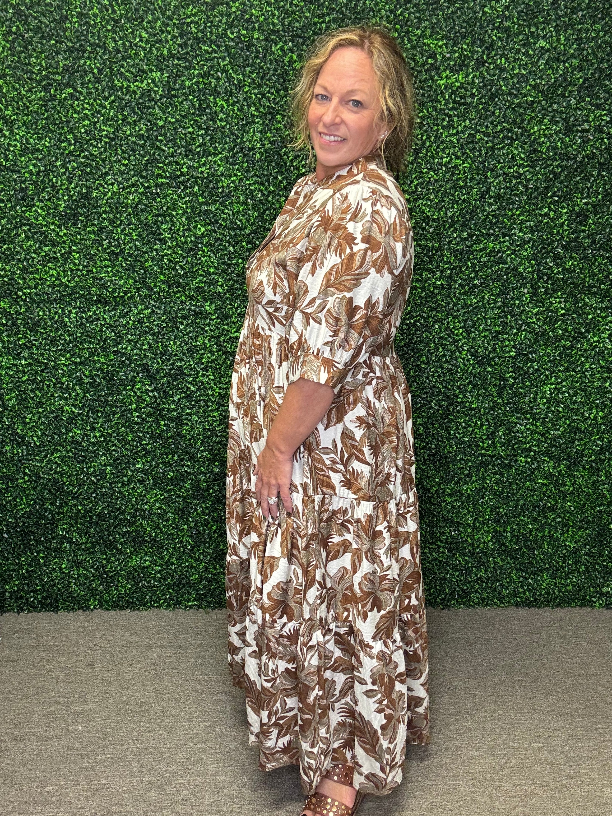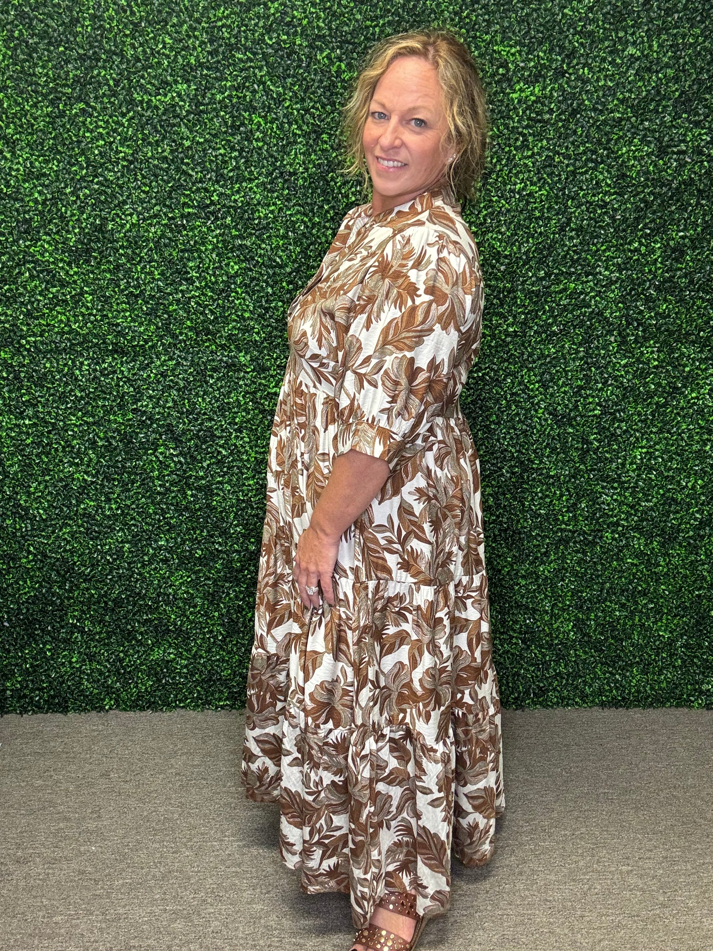 Soft, flowing, and effortlessly bohemian — the Everleaf Midi Dress brings dreamy charm to your wardrobe. With its earthy leaf print, breezy silhouette, and graceful tiers, this dress is made for easy elegance from daytime outings to evening events.