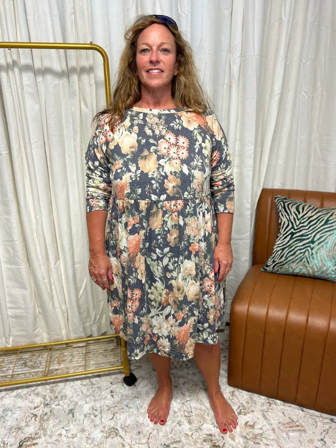Features: lightweight babydoll dress with a rounded neckline and cinching at the natural waistline!