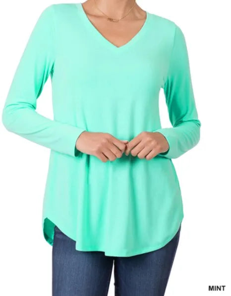 Unleash your playful side with our Long Sleeve V-Neck Round Hem Top! This must-have piece features a flattering v-neck and a unique round hem that adds a touch of quirkiness to any outfit. Perfect for a casual day out or a night on the town. Upgrade your wardrobe now!