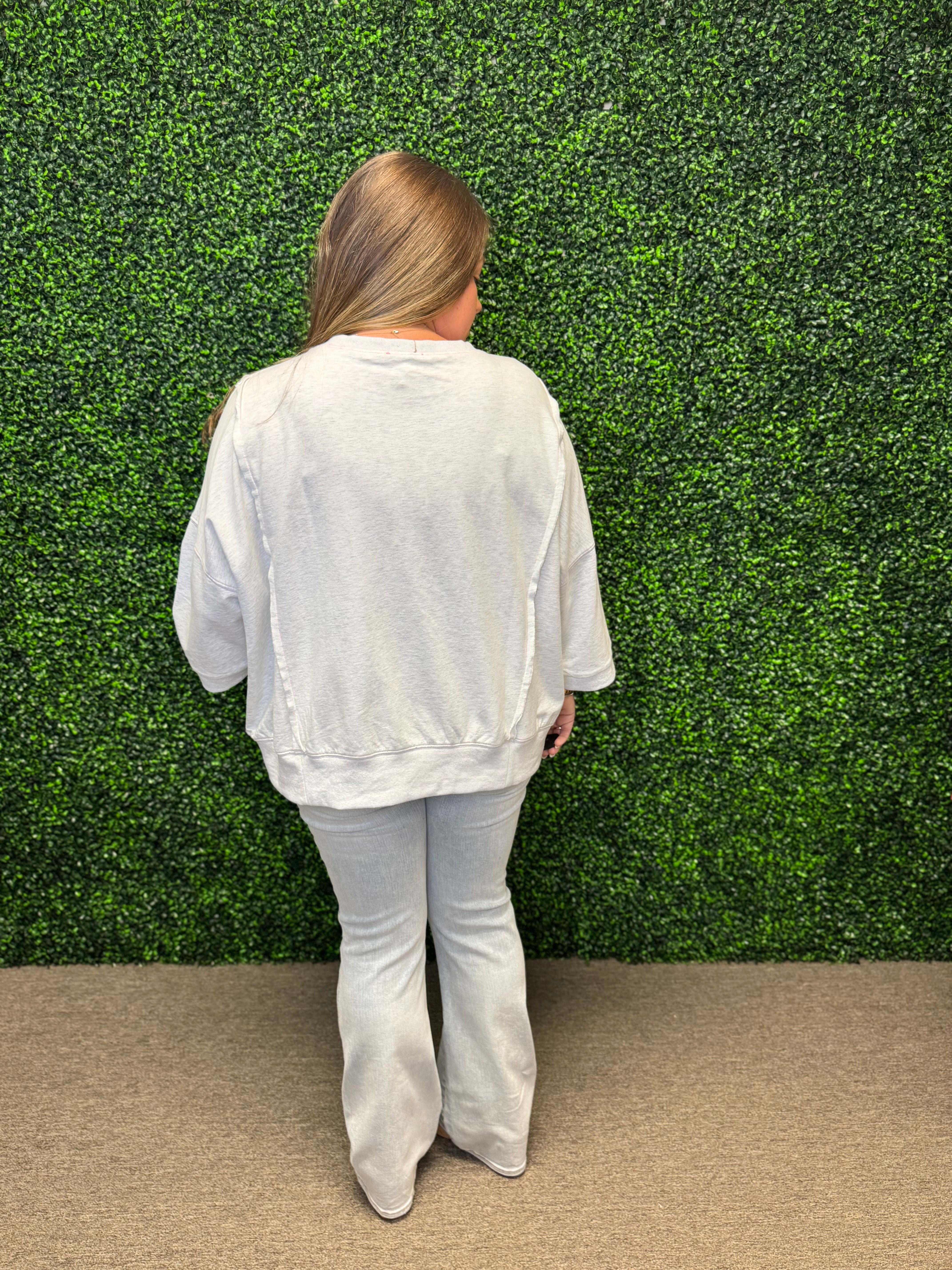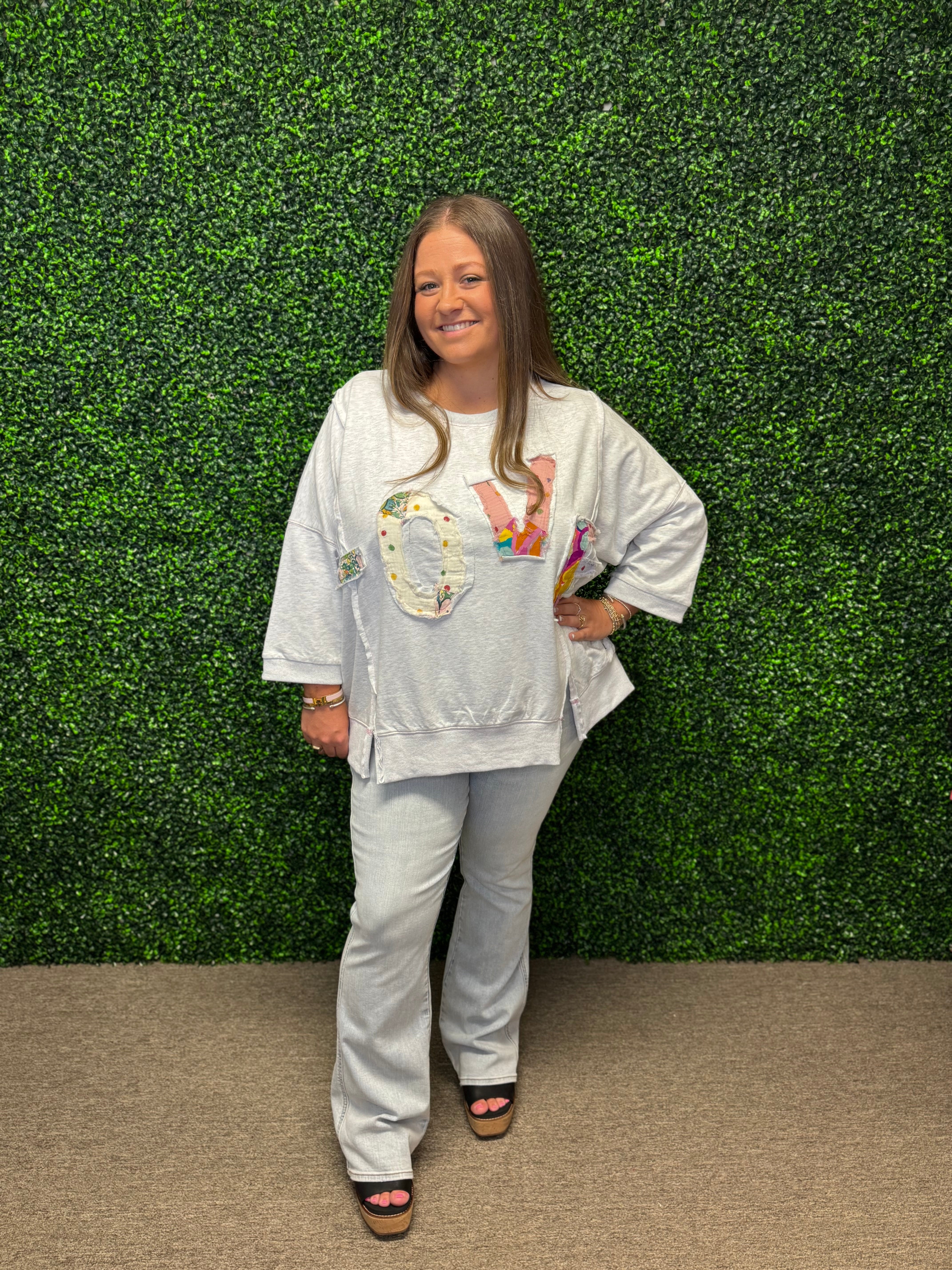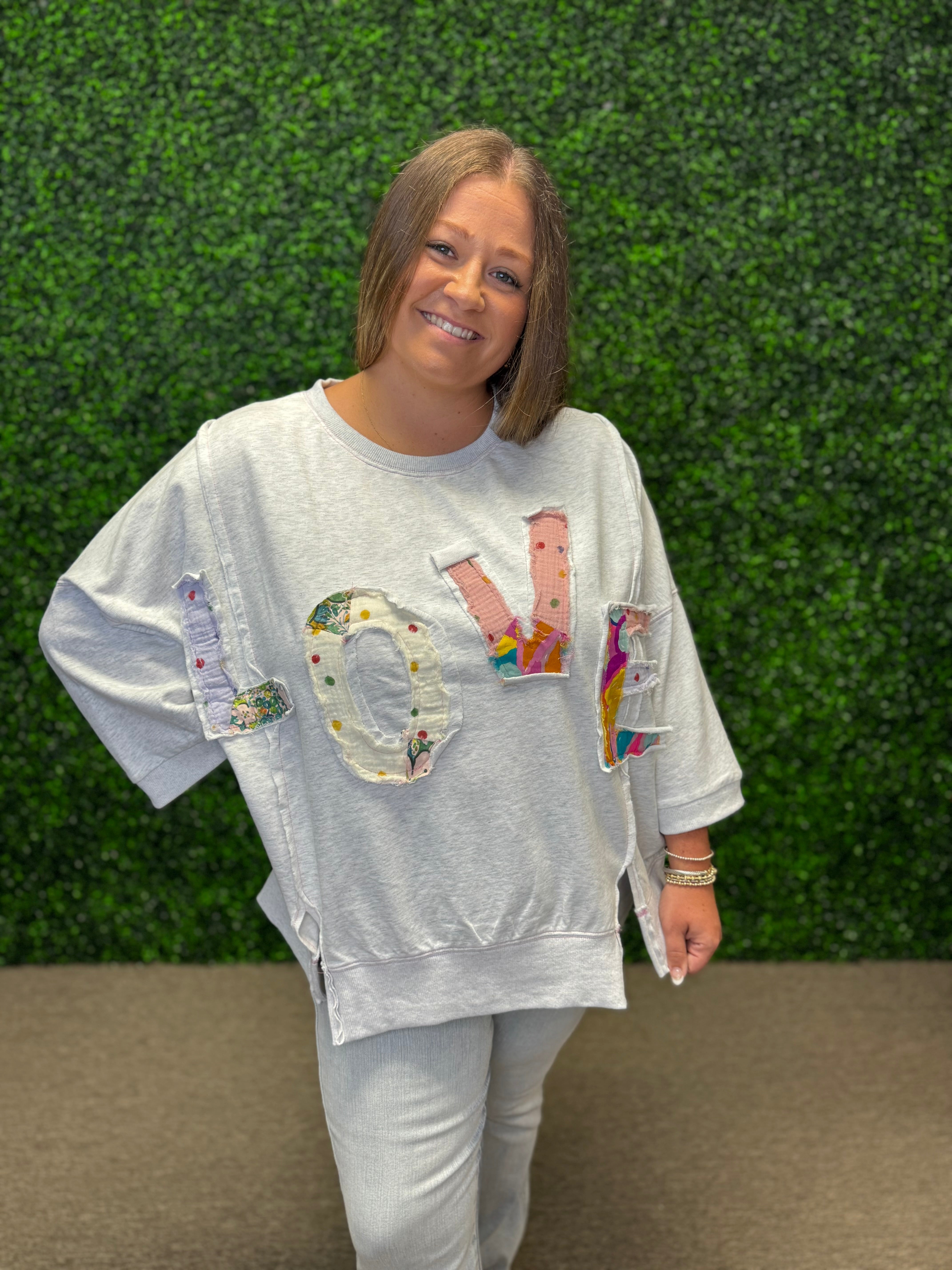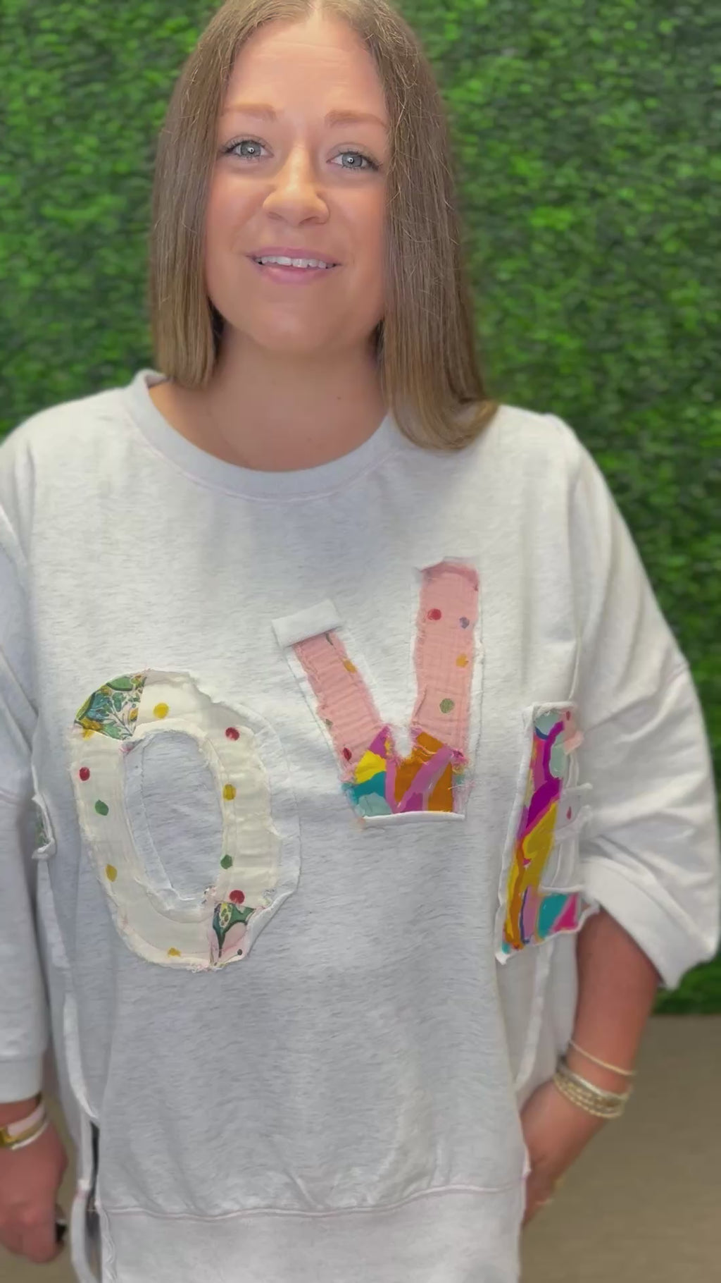 This washed terry knit pullover is full of cozy charm and playful personality! With its mixed print "LOVE" patch front, raw cut seams, and relaxed fit, this top is the perfect blend of casual and unique style. Front slits add a little movement, making it both comfy and flattering for everyday wear.