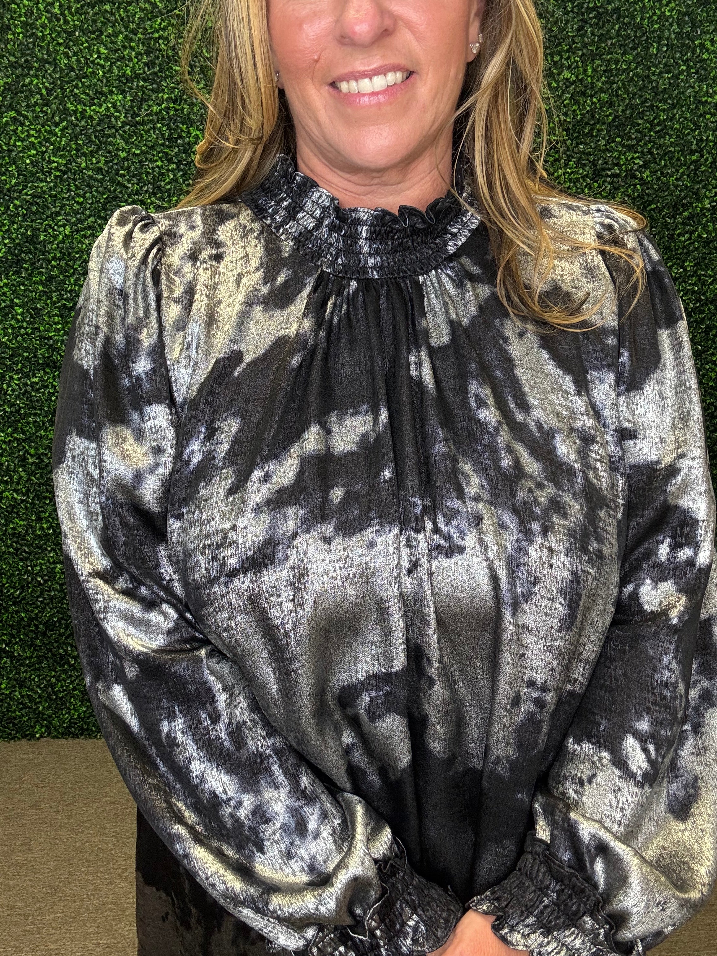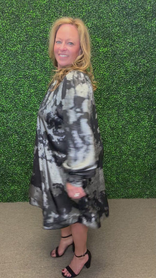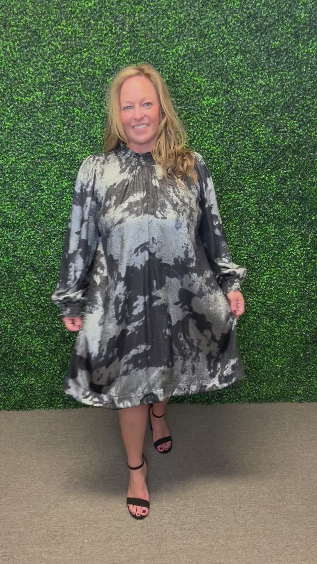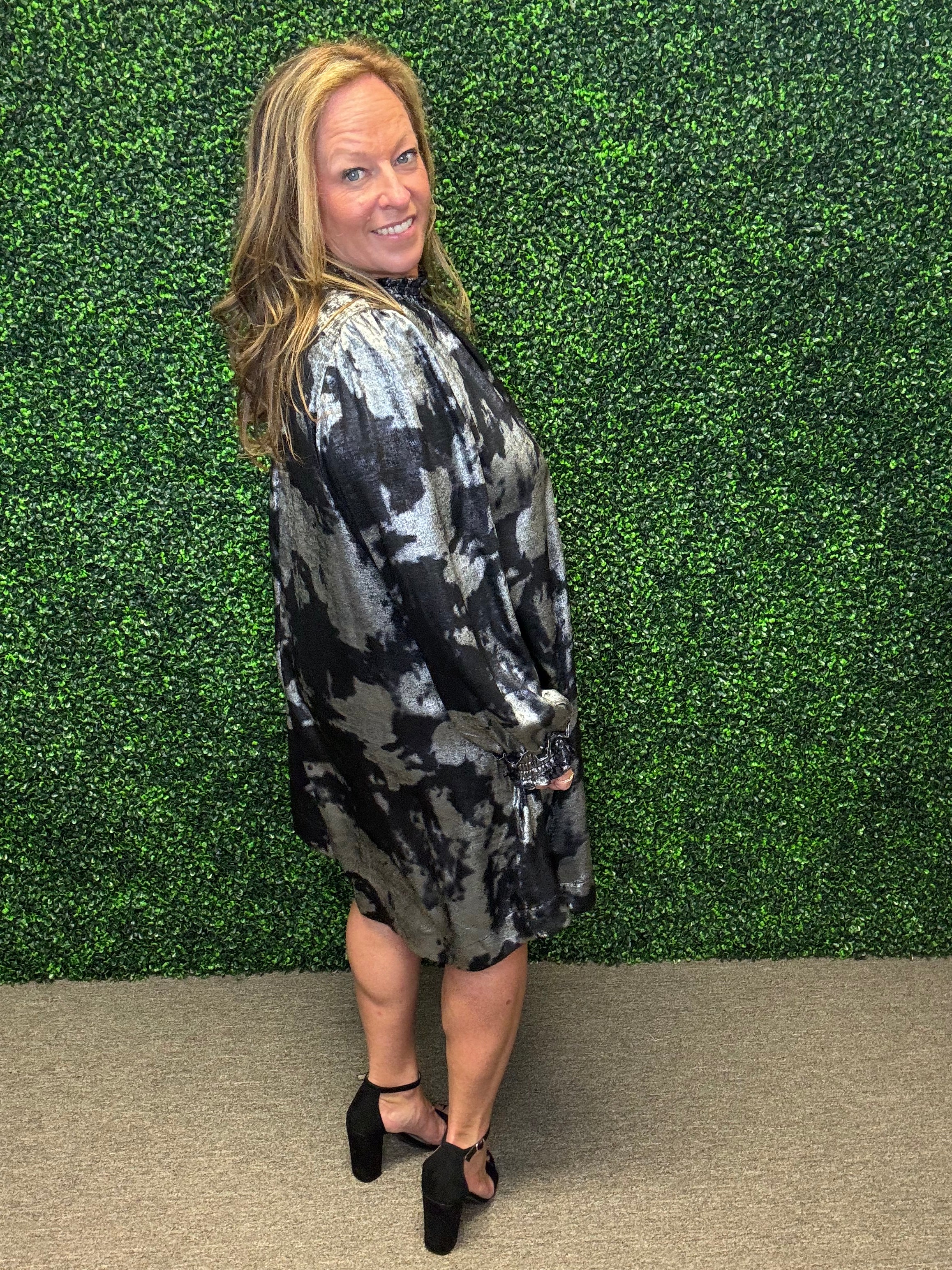 Add instant elegance and a hint of drama to your wardrobe with The Silver Starlight Mini Dress by Umgee. Designed in a striking abstract black and silver print, this metallic beauty brings both comfort and standout style to any occasion. Its soft ruffle-trimmed neckline and flowing silhouette make it an unforgettable piece you’ll reach for season after season.