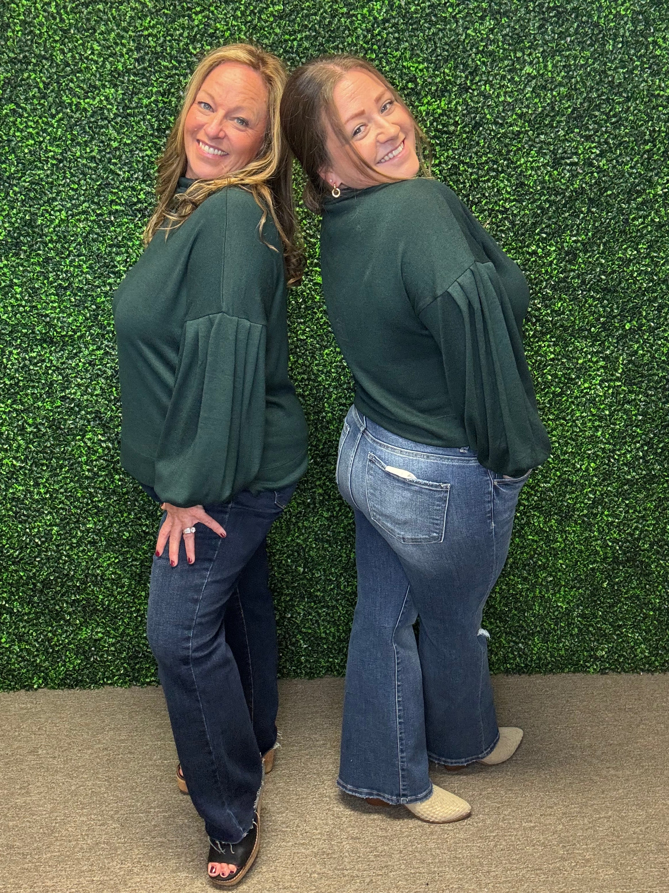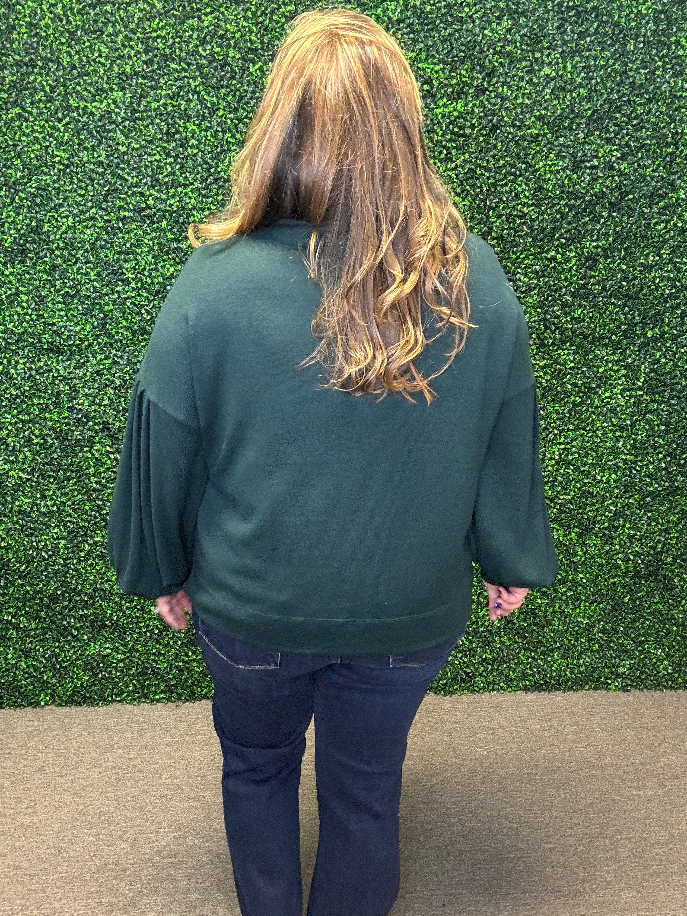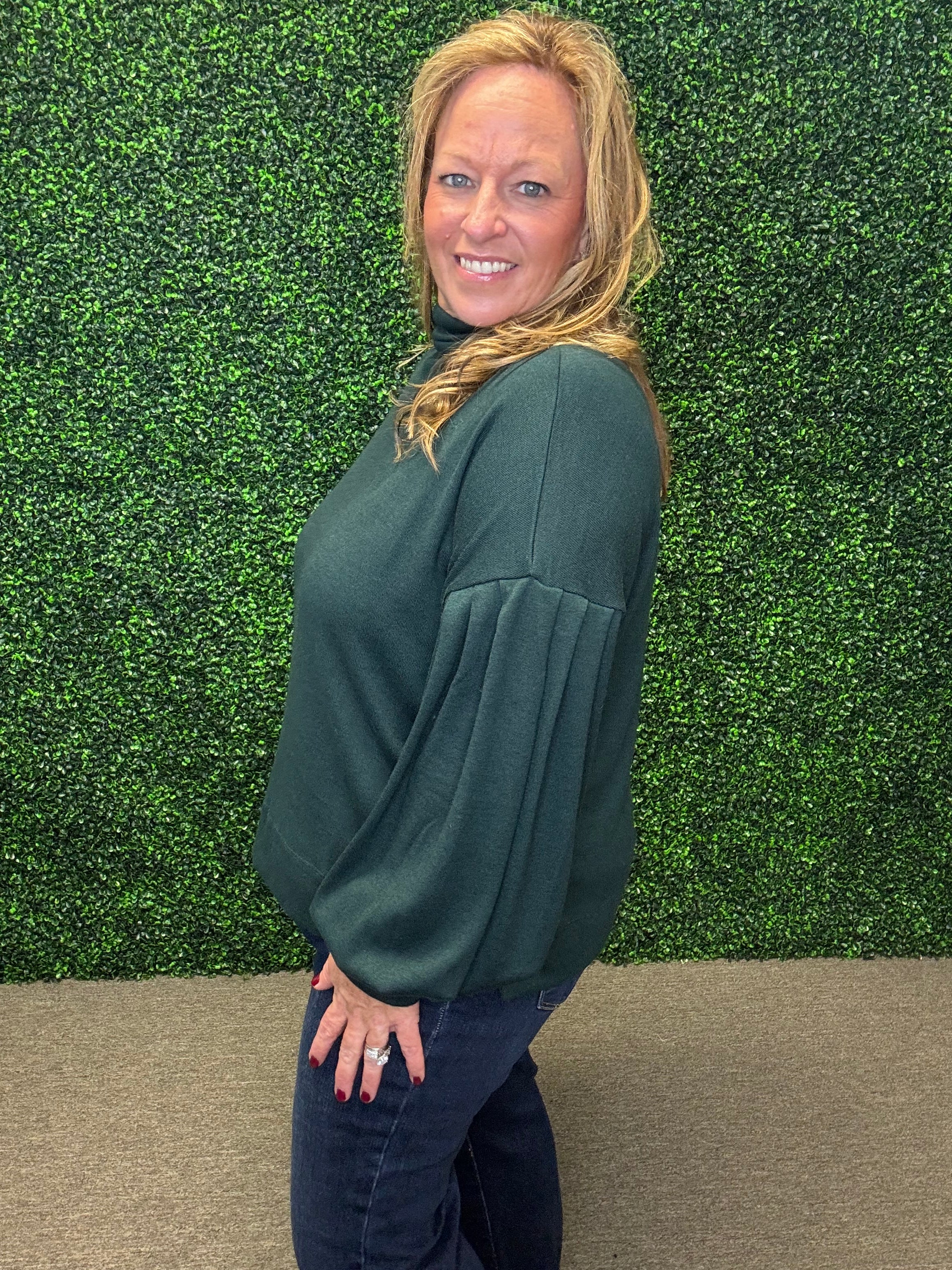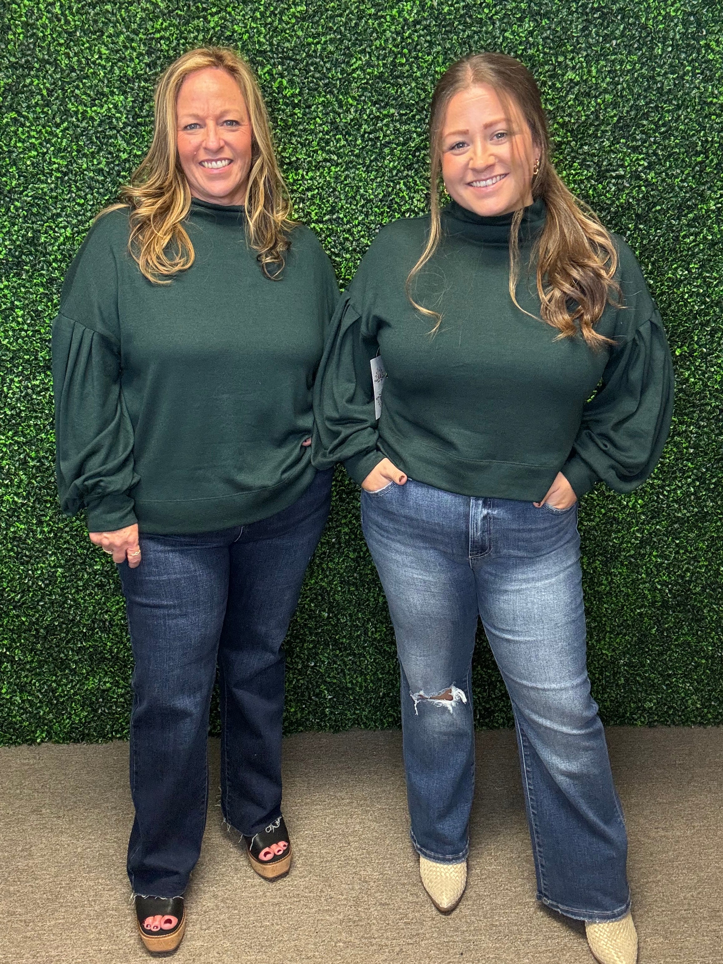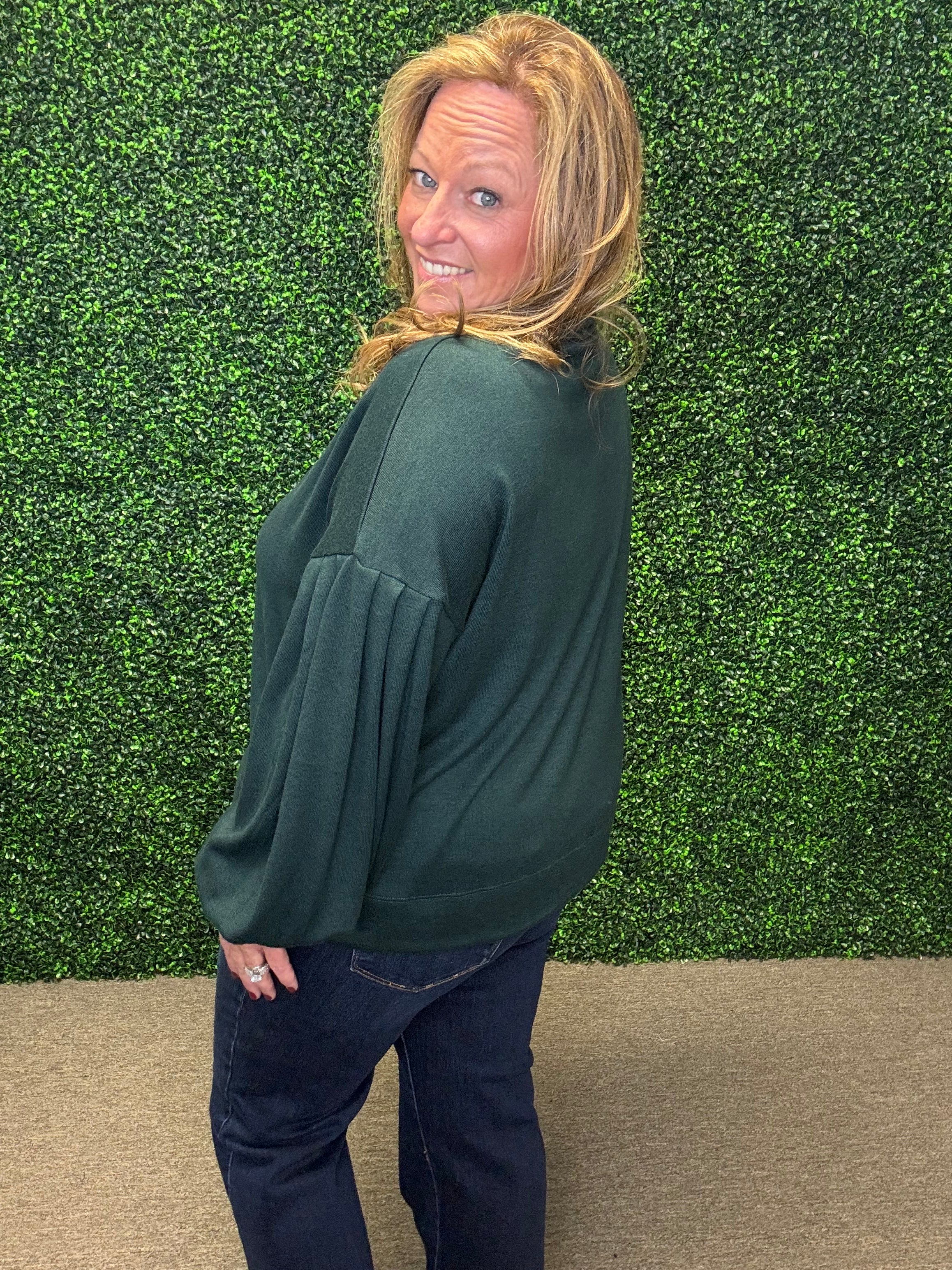 if you were looking for a staple top and a beautiful dark green color, this is going to be your new favorite. This is a classic by Entro with a modern twist, this top is perfect for dressing up or down. Designed with a sleek mock neckline and pleated balloon sleeves, it brings effortless sophistication to your everyday look. The wide cuffs add structure and detail, while the drop shoulder keeps the fit relaxed and comfortable. Made from a medium-weight knit that’s soft and non-sheer, this piece layers beautifully and works on its own with trousers, denim, or skirts.