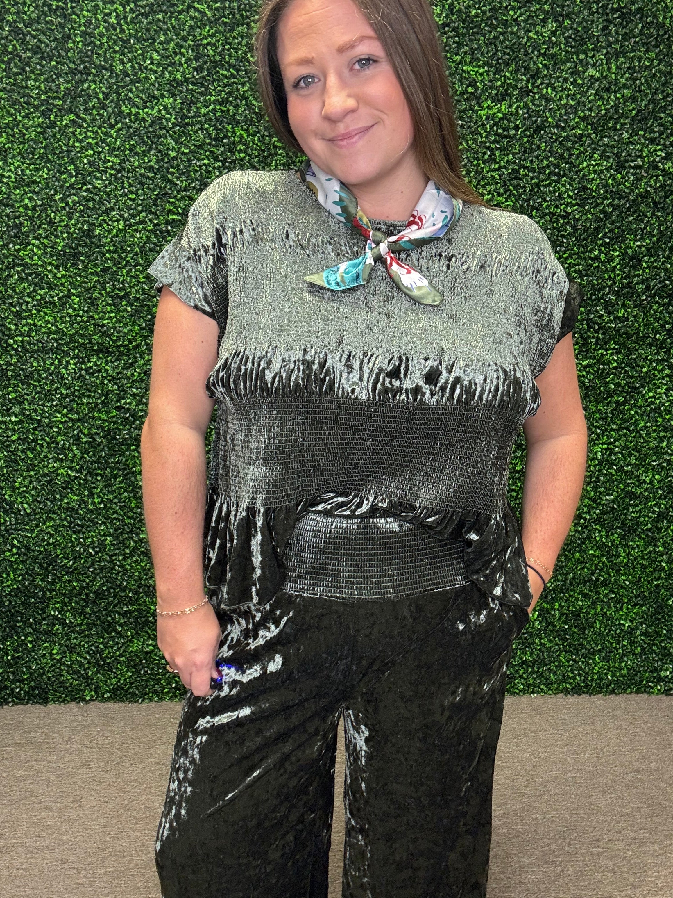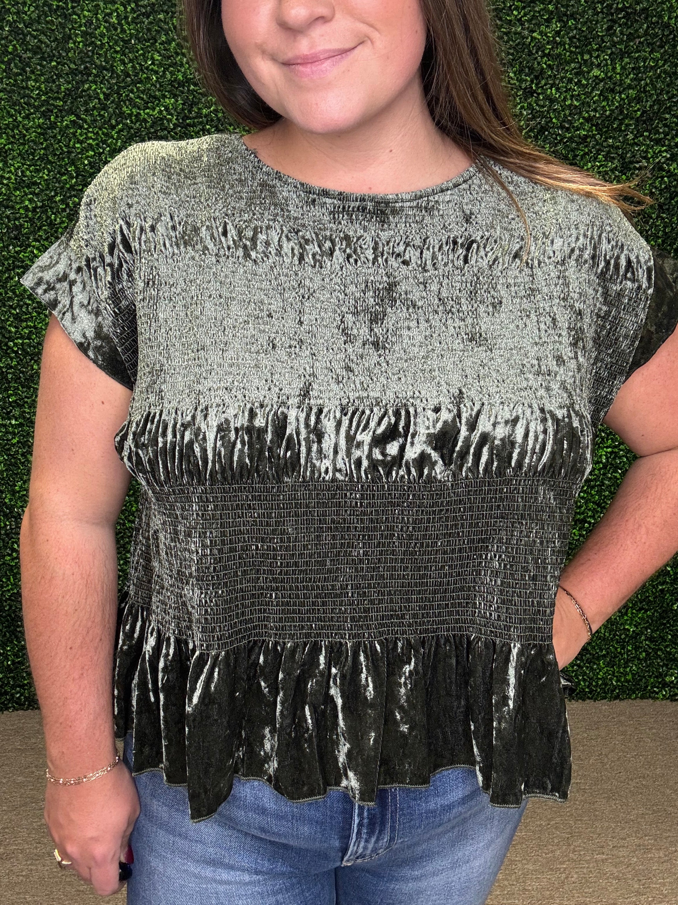 Chic, feminine, and effortlessly flattering — this blouse is a statement piece you’ll love dressing up or down. With its smocked bodice, ruffle hem, and soft velvet finish, it strikes the perfect balance between playful charm and elevated style.