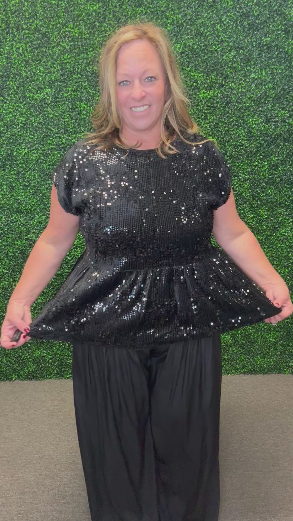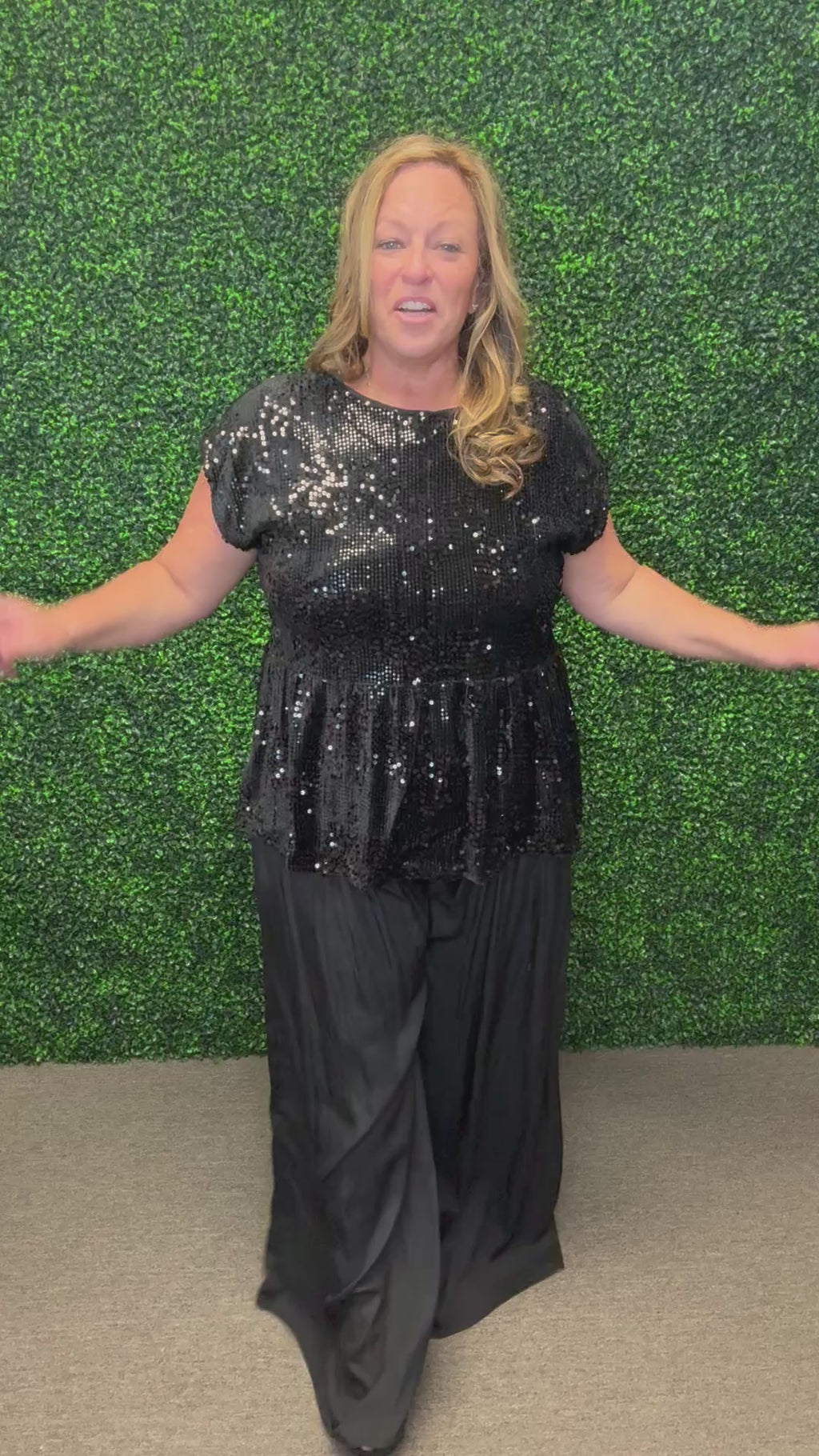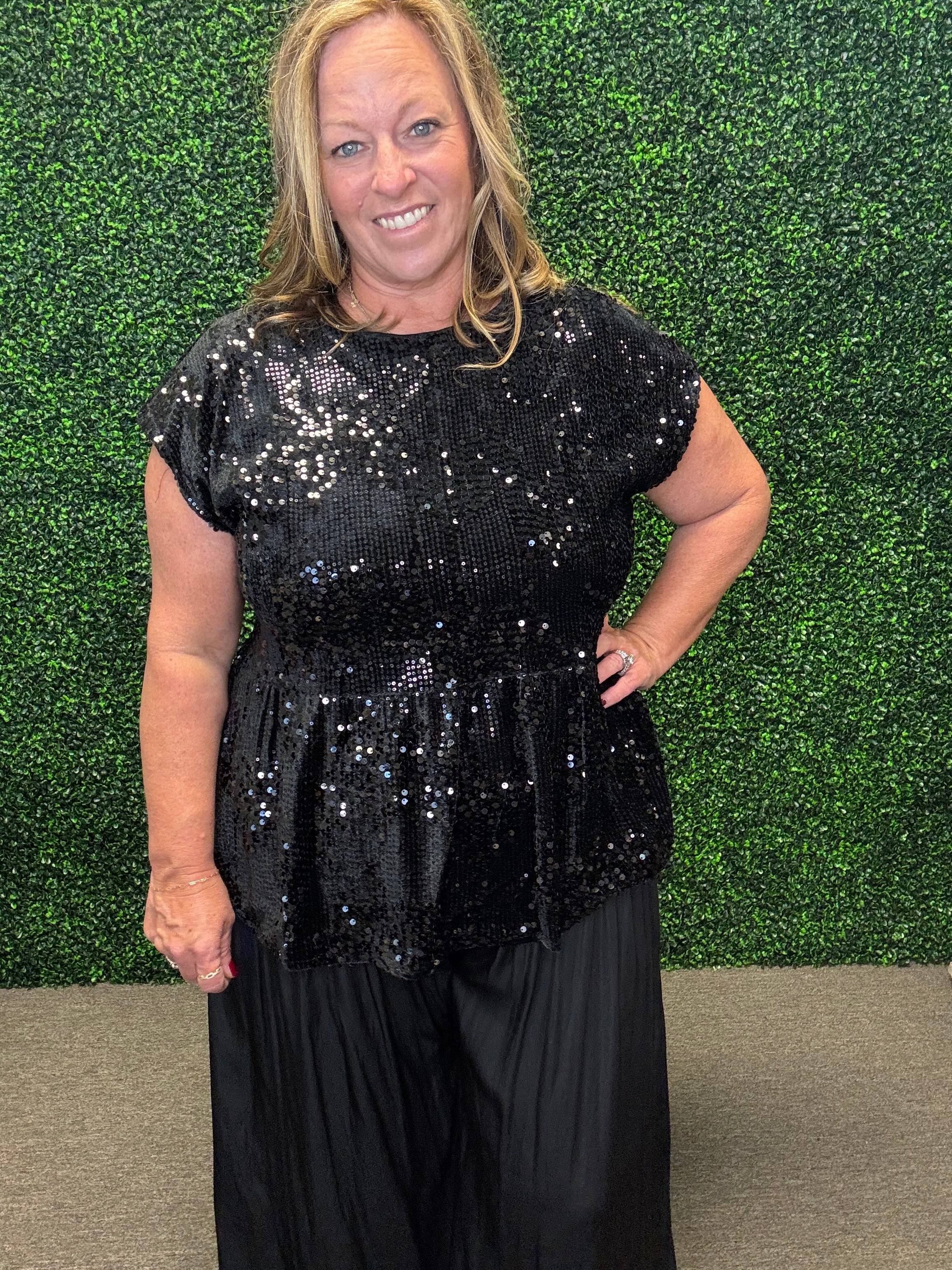 Pair the Sparkle & Bow Sequin Top with sleek black pants or a faux leather mini skirt for an elegant night-out look. Add heels and statement earrings to elevate the sparkle, or tone it down with dark denim and ankle boots for a chic yet relaxed vibe.