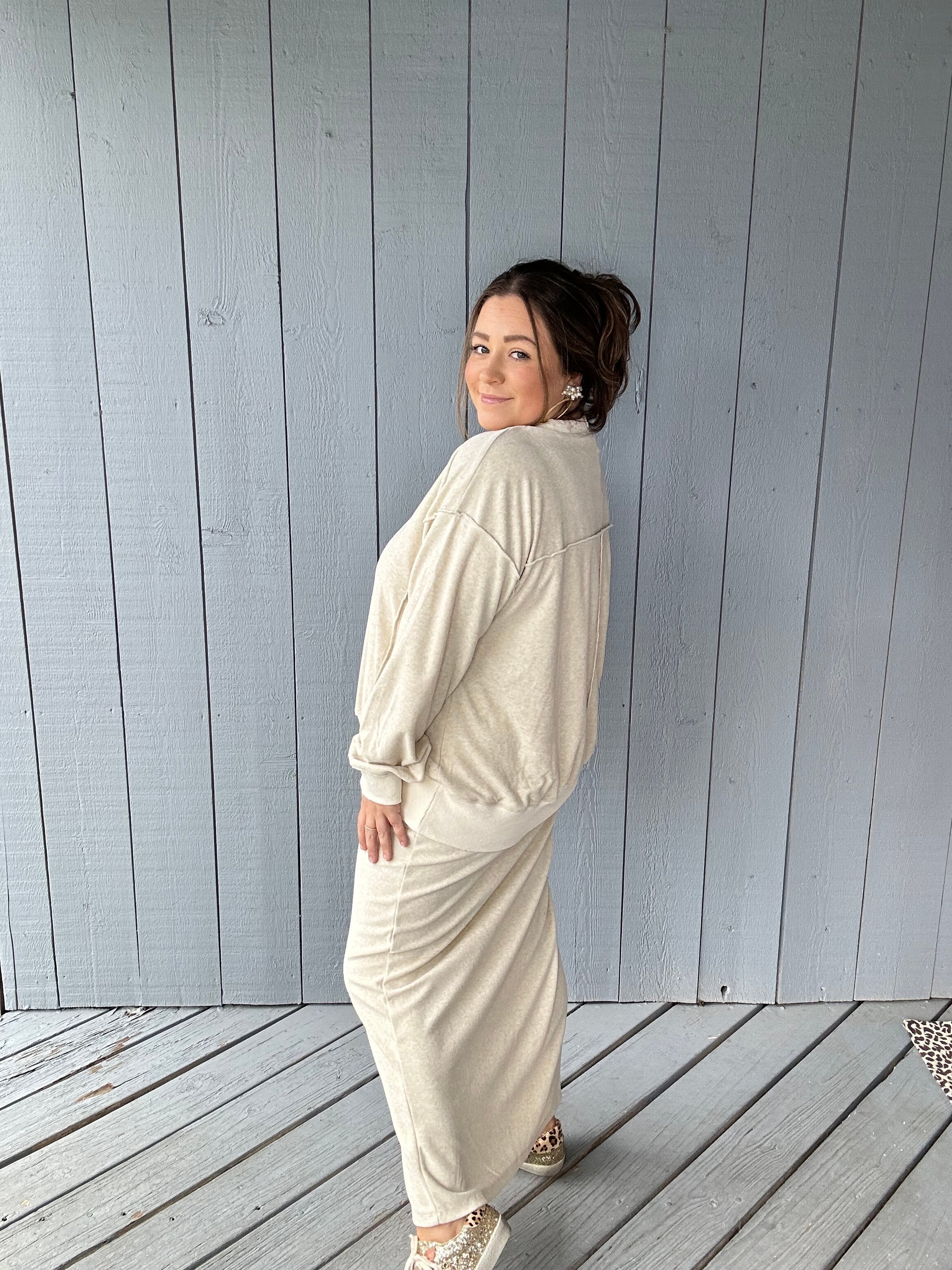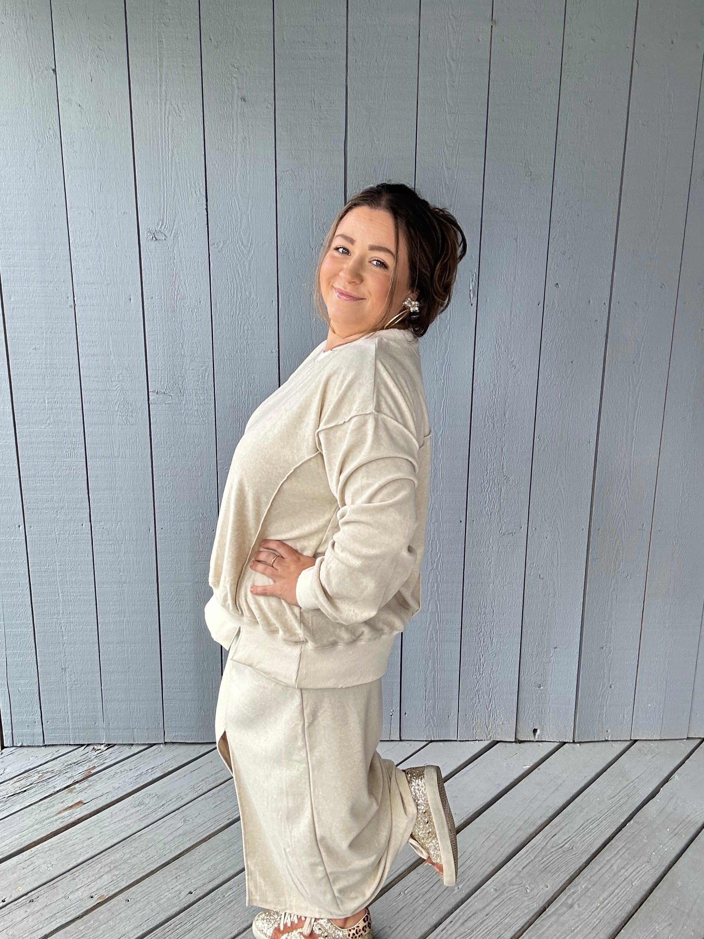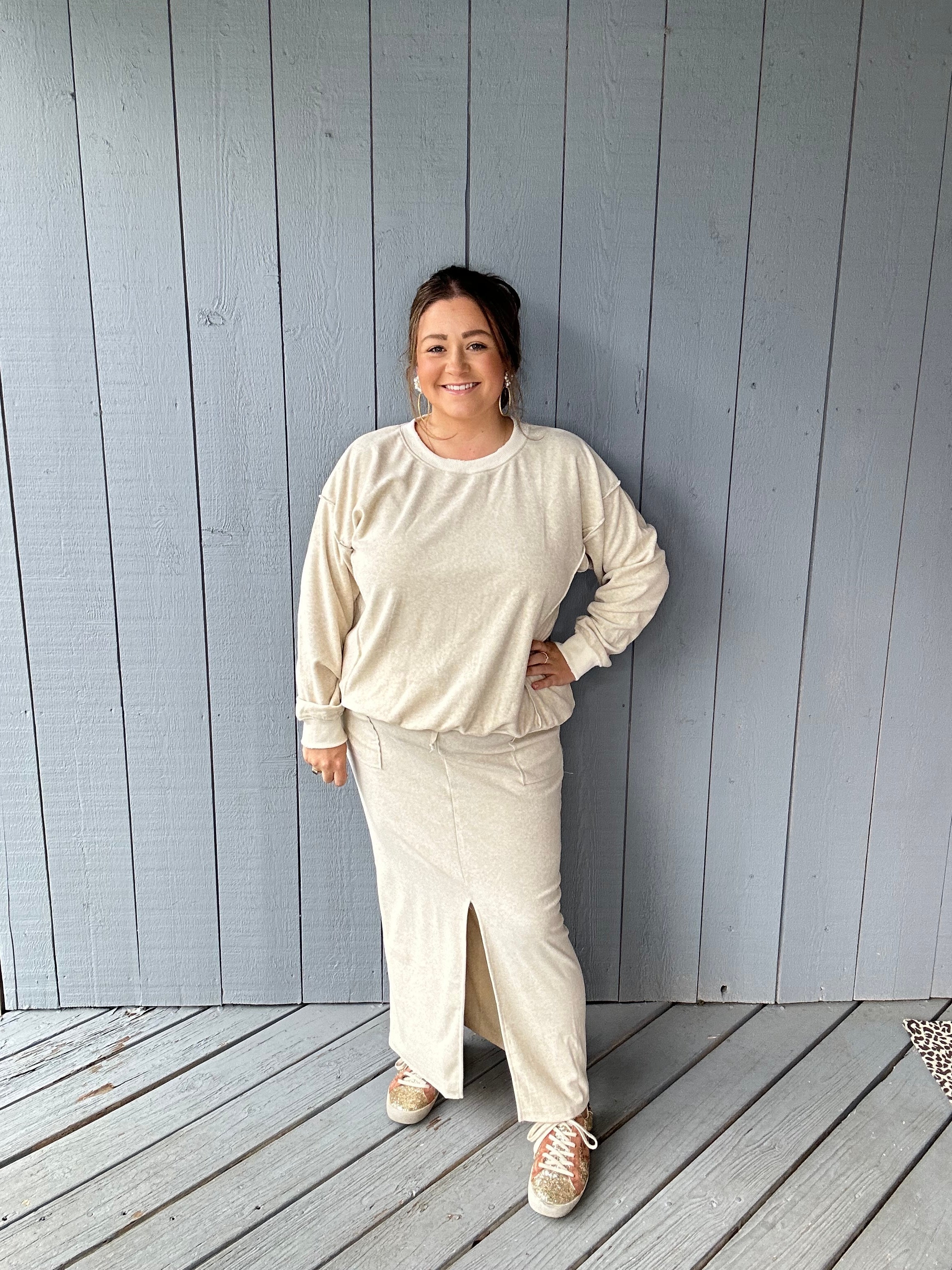 Features: Velour pullover top with side slit hem, velour maxi pull on pencil skirt with a front slit.