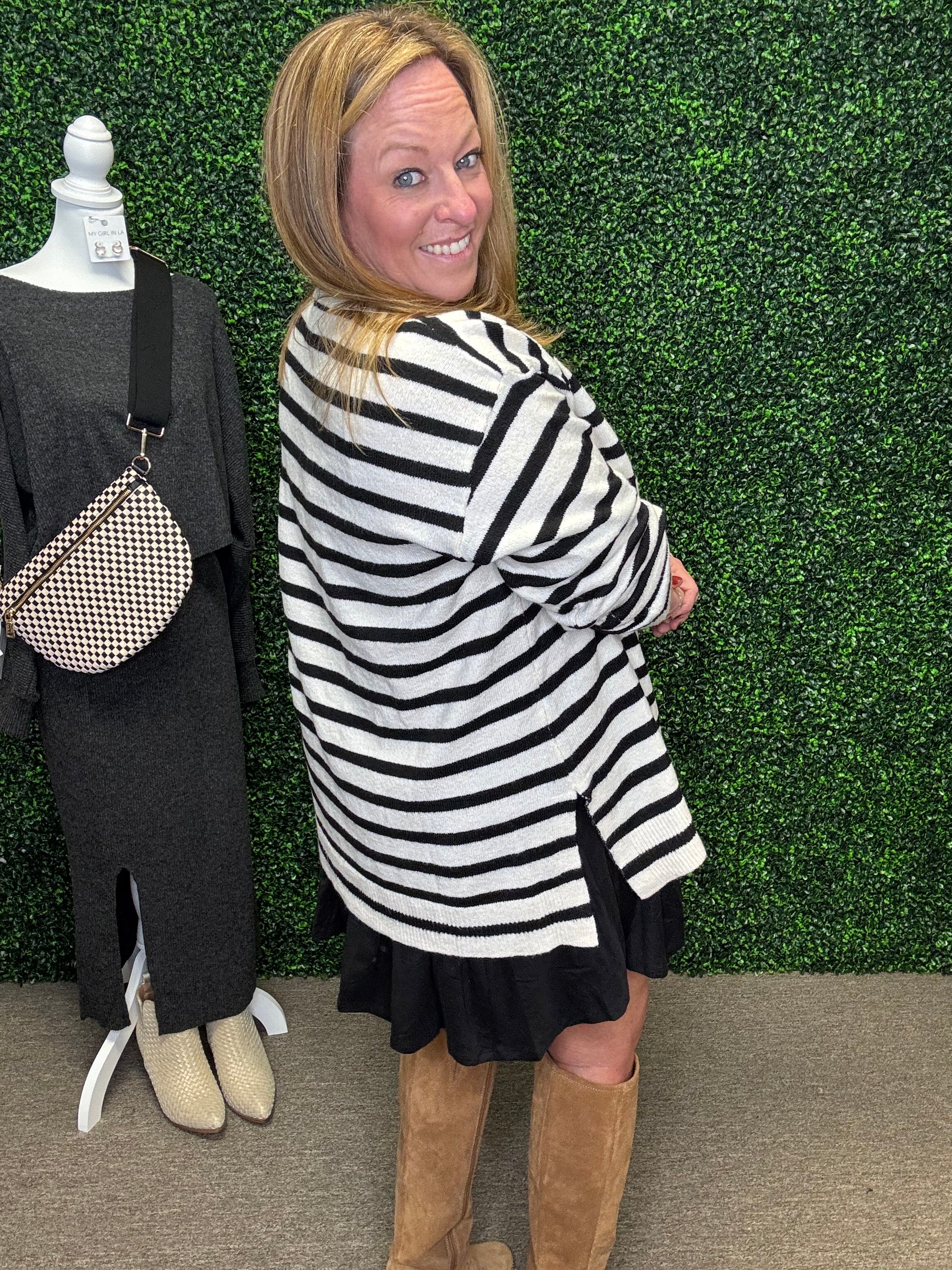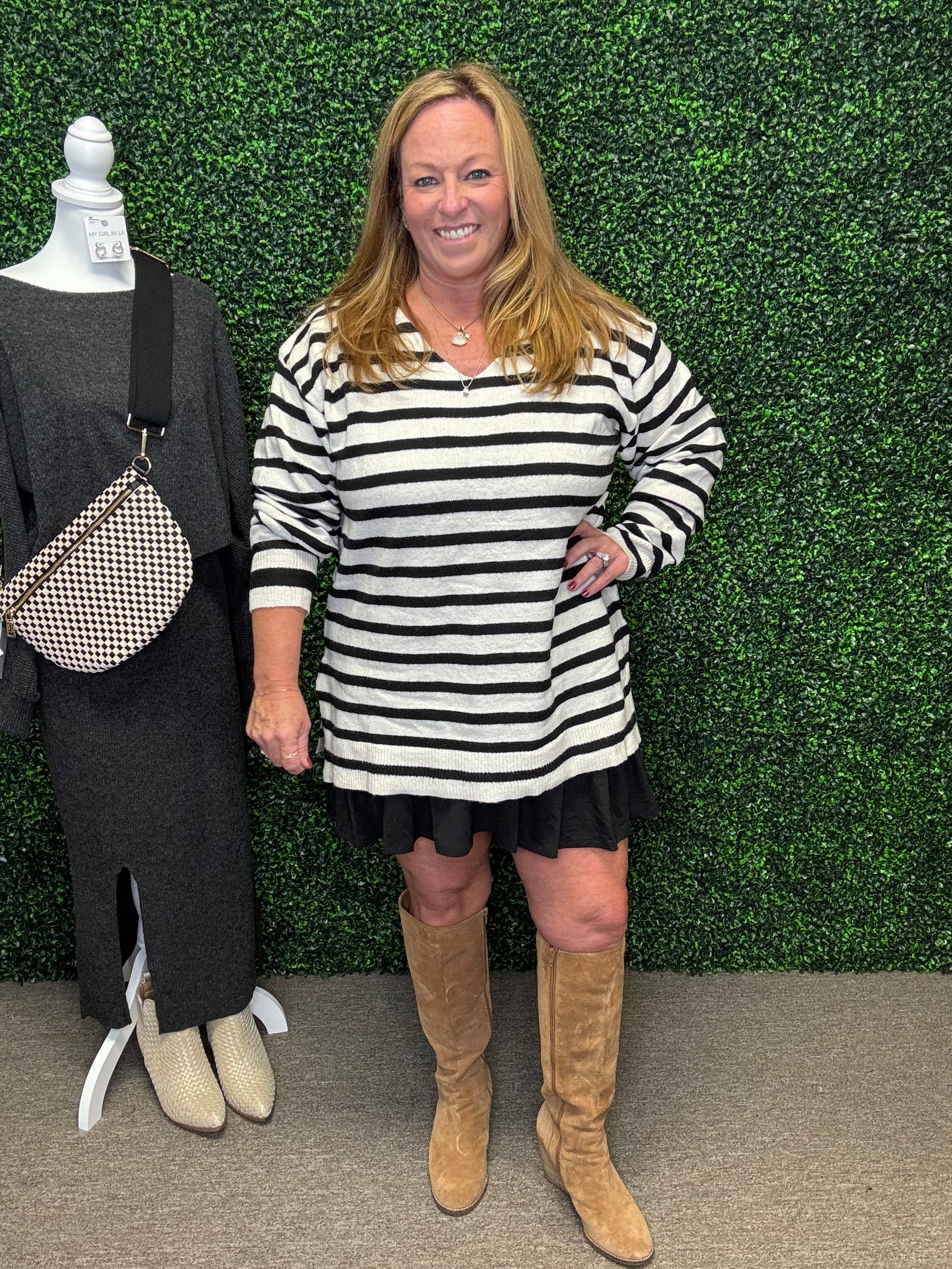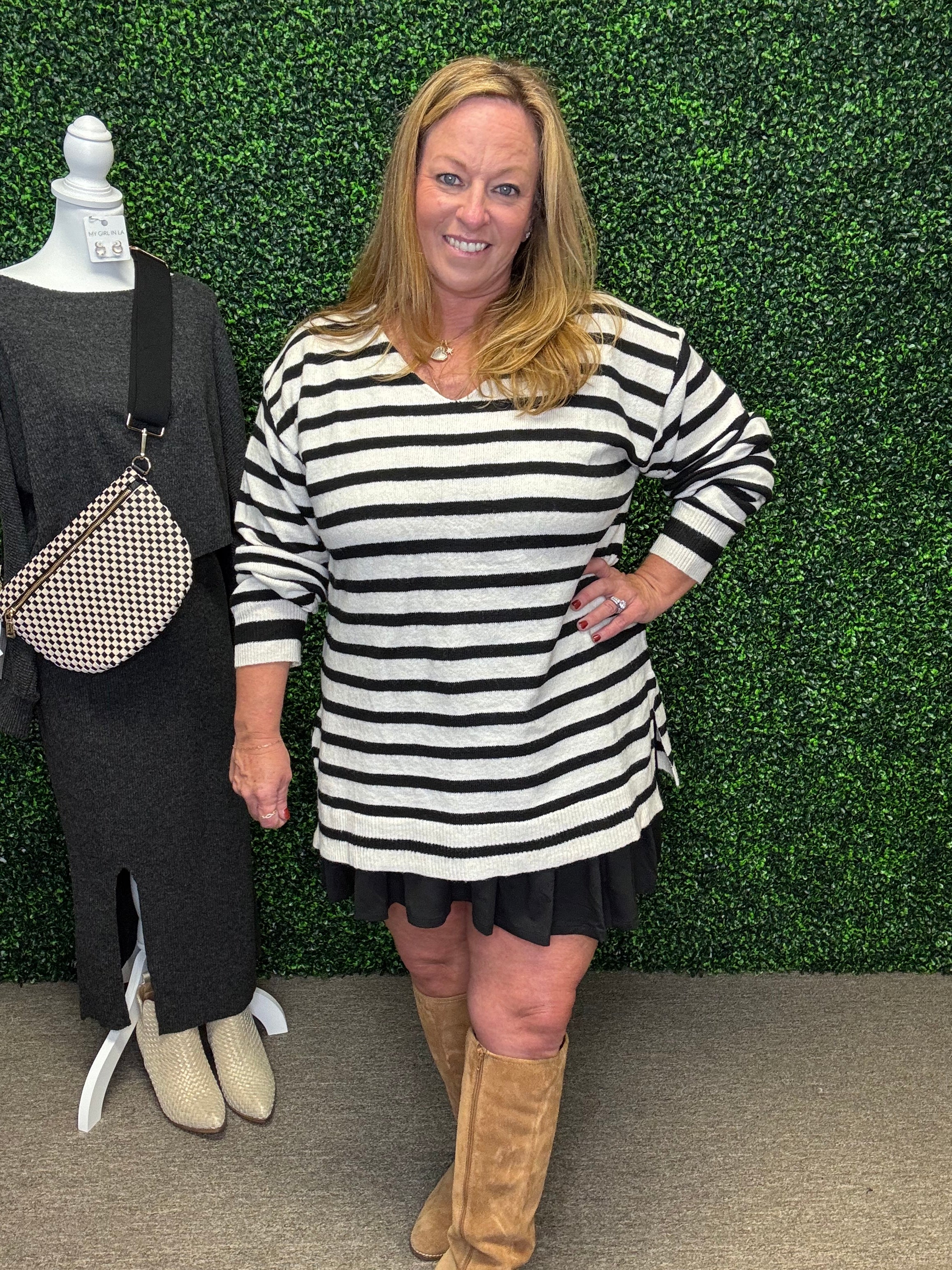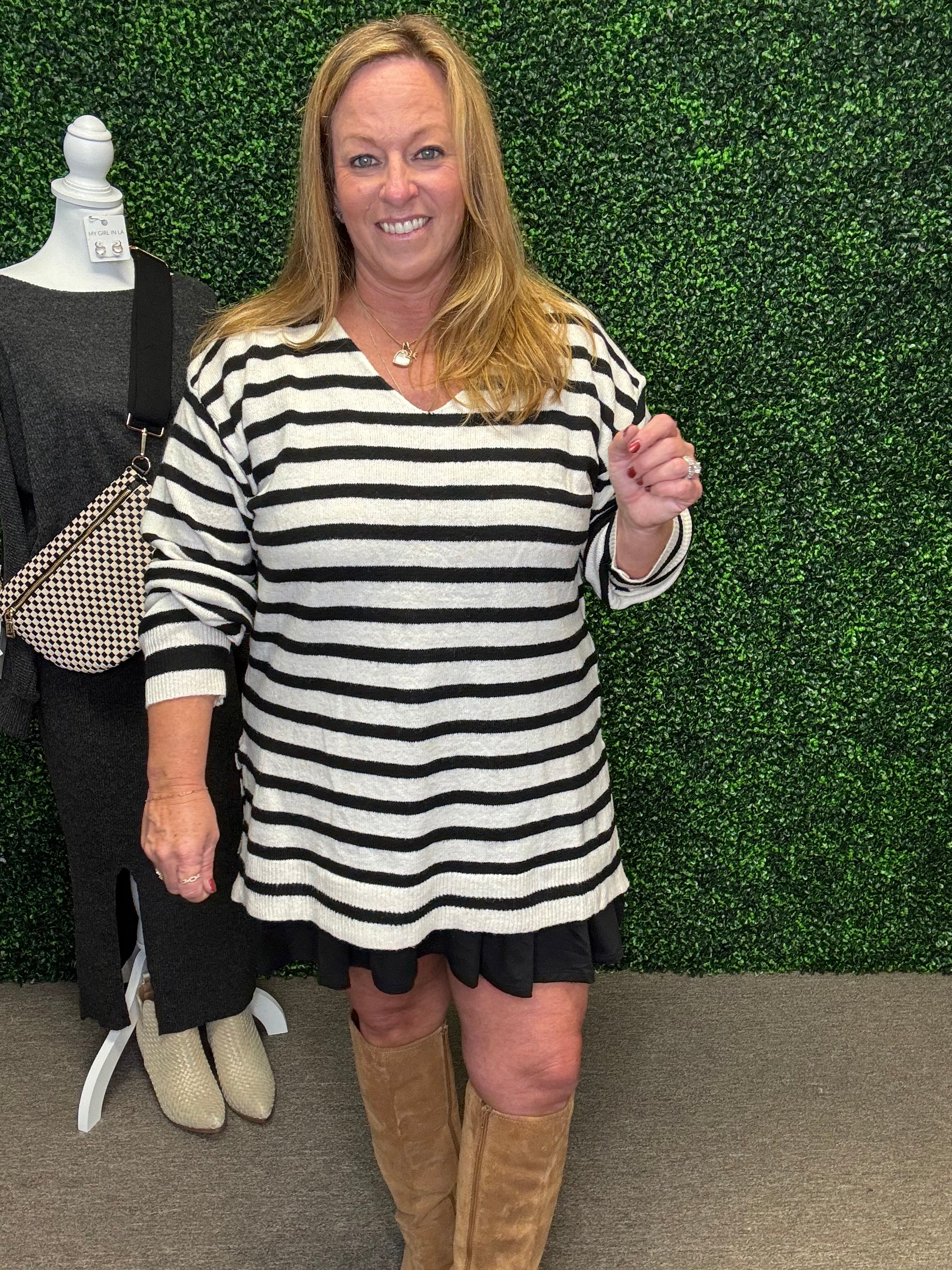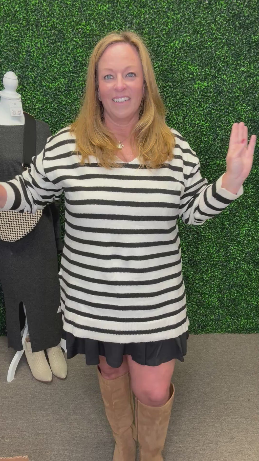 Elevate your everyday with The Stripes of Grace Sweater by Sew In Love—where timeless elegance meets effortless comfort. This black and cream striped beauty features a flattering V-neckline and a tunic-length silhouette that drapes gracefully over the body. With its chic monochrome palette and polished design, this piece brings instant sophistication to any outfit.