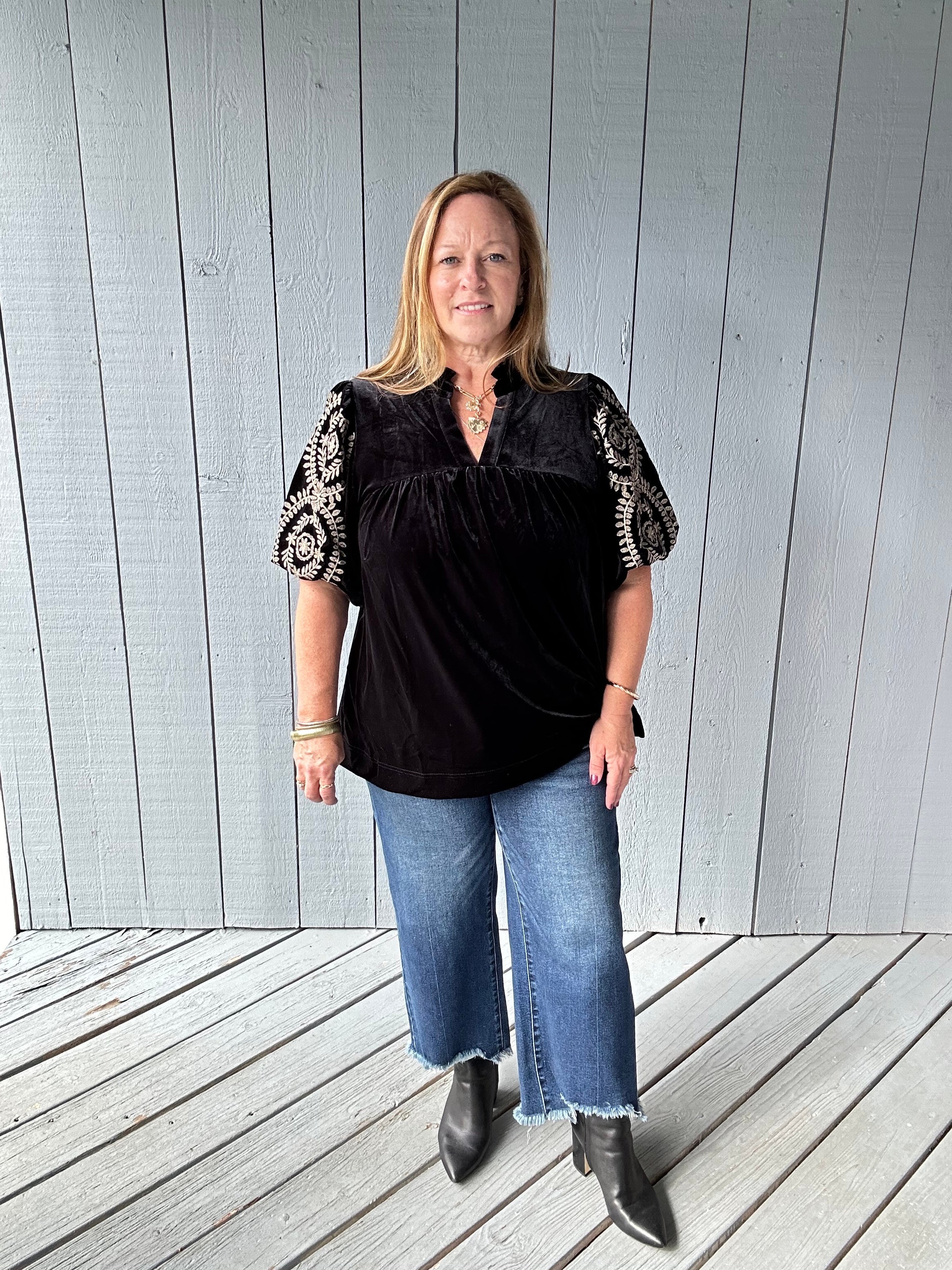 Velvet Embroidered Sleeve Top