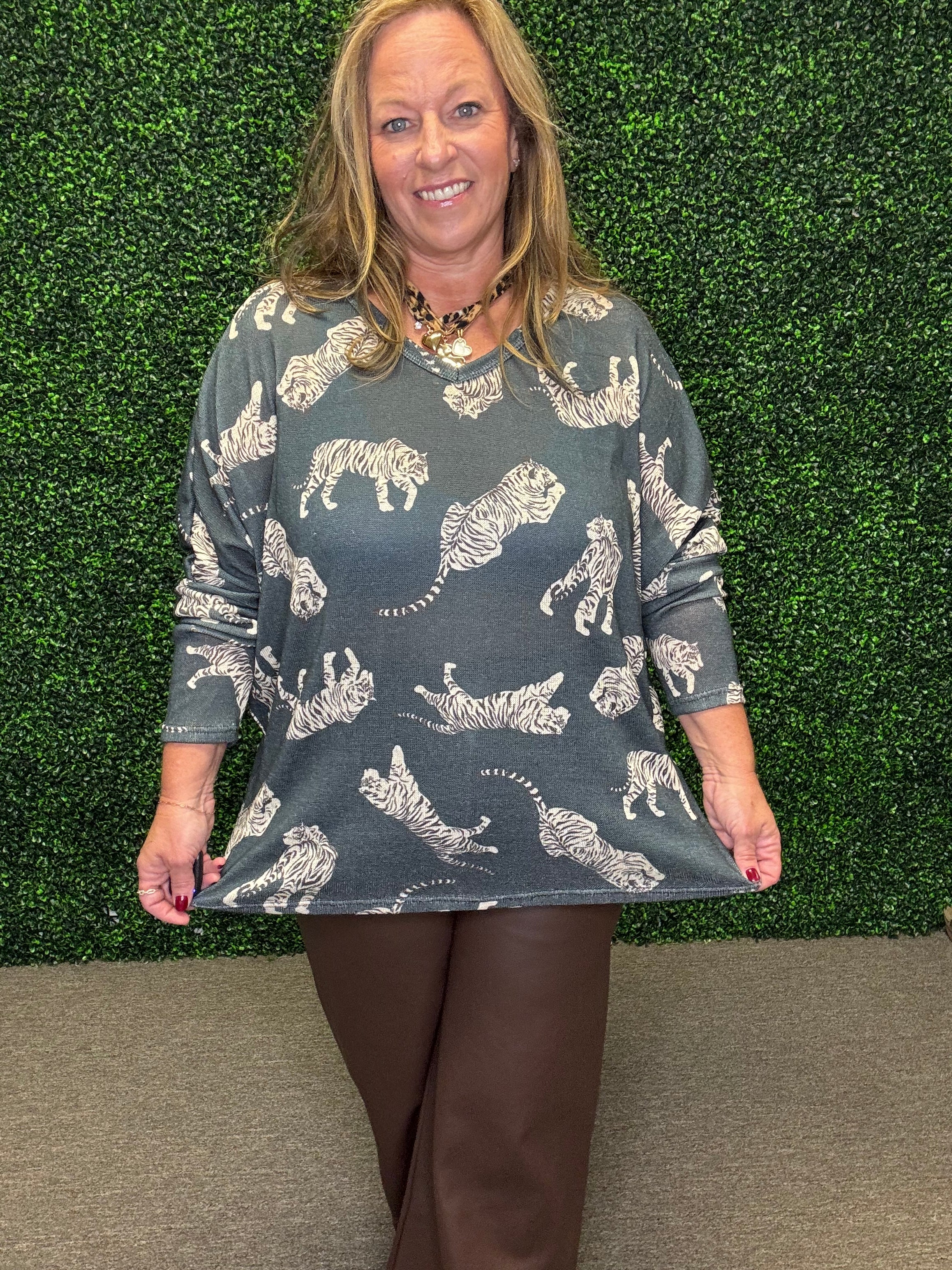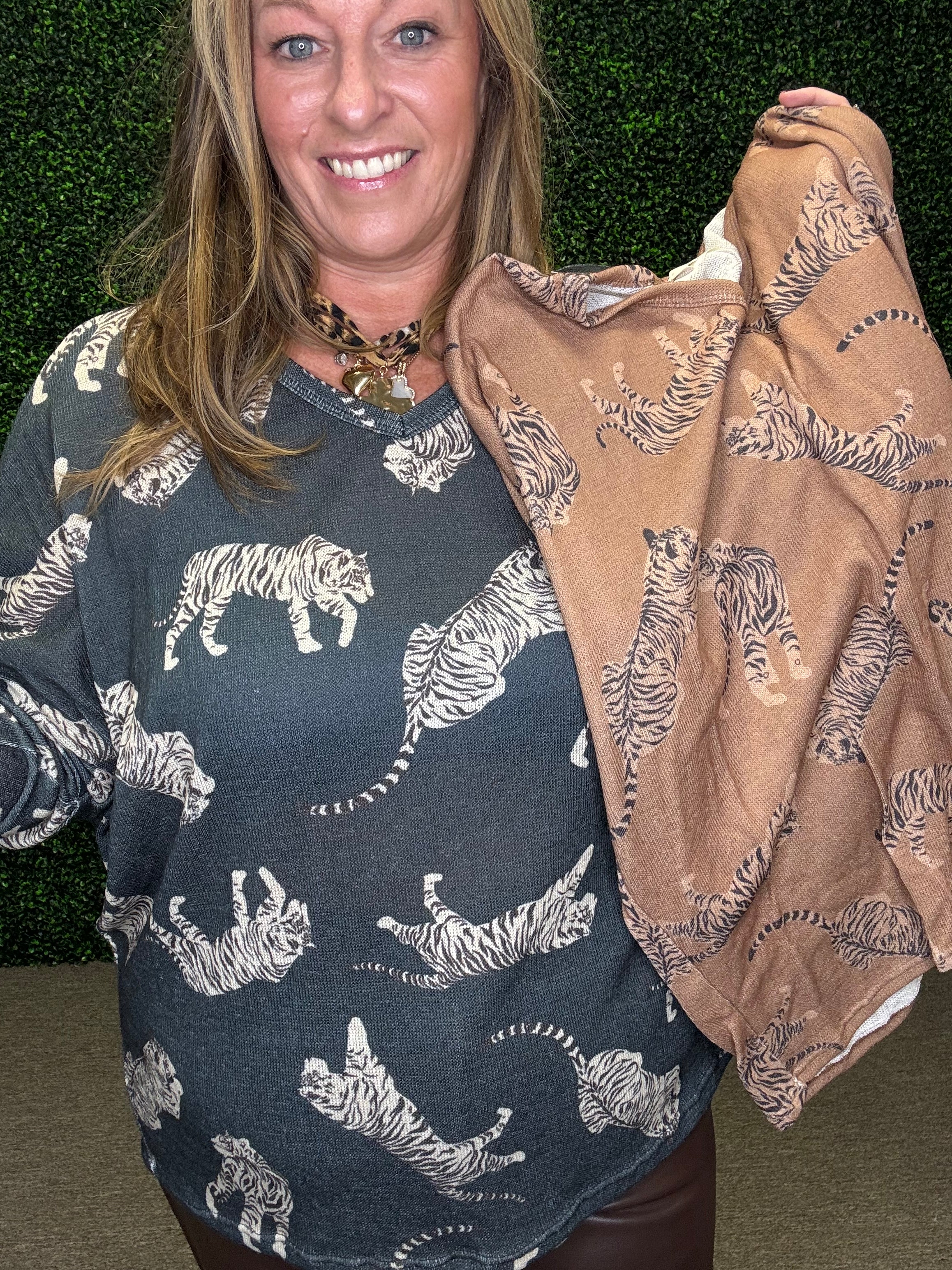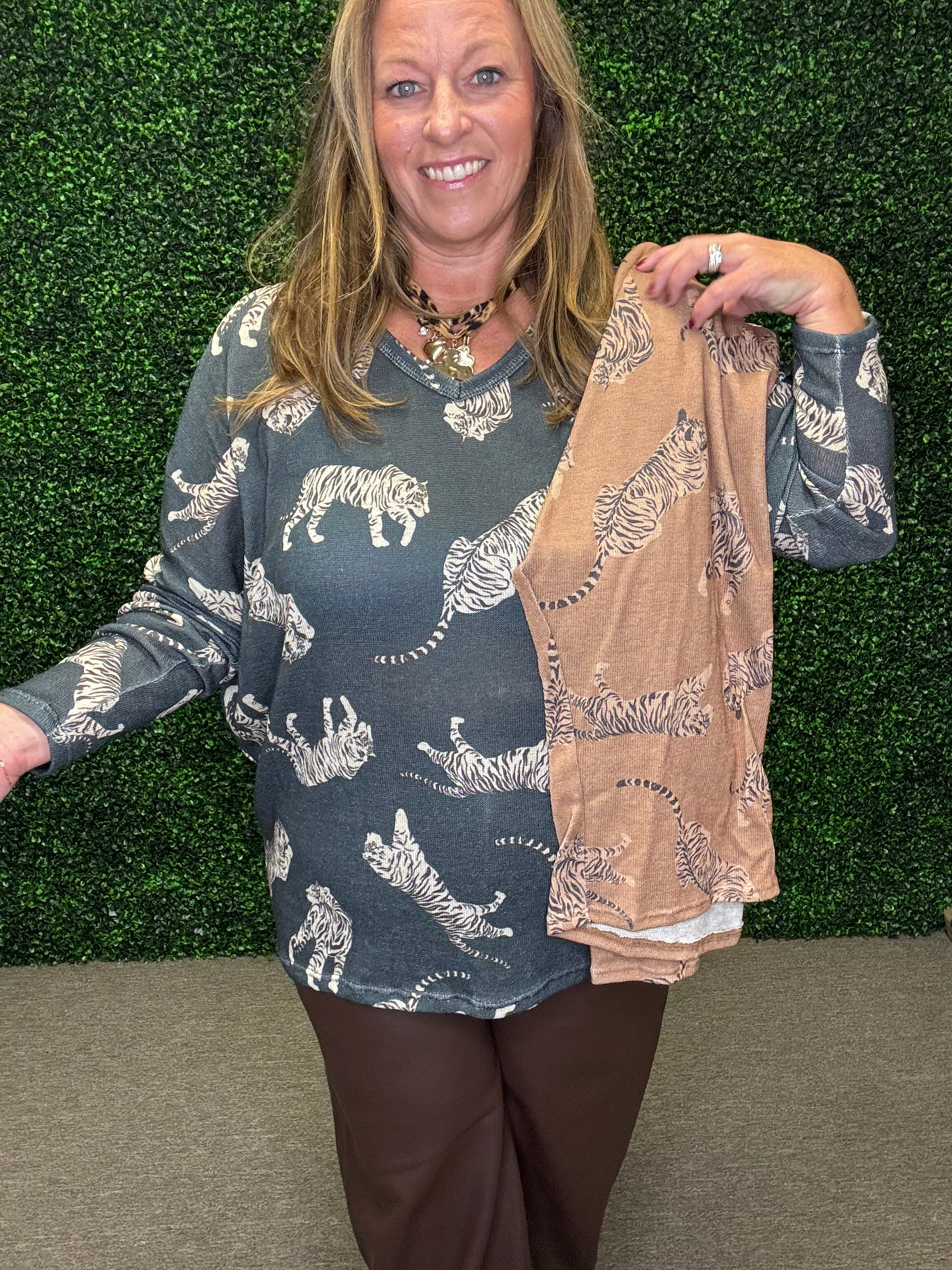 Get ready to show your fierce side in this adorable tiger-print top! The S-L comes in a warm caramel tone, while the 1X-2X features a soft gray version — both equally cute and perfect for everyday wear. Lightweight and easy to style, this Hopely piece brings fun energy to any outfit.